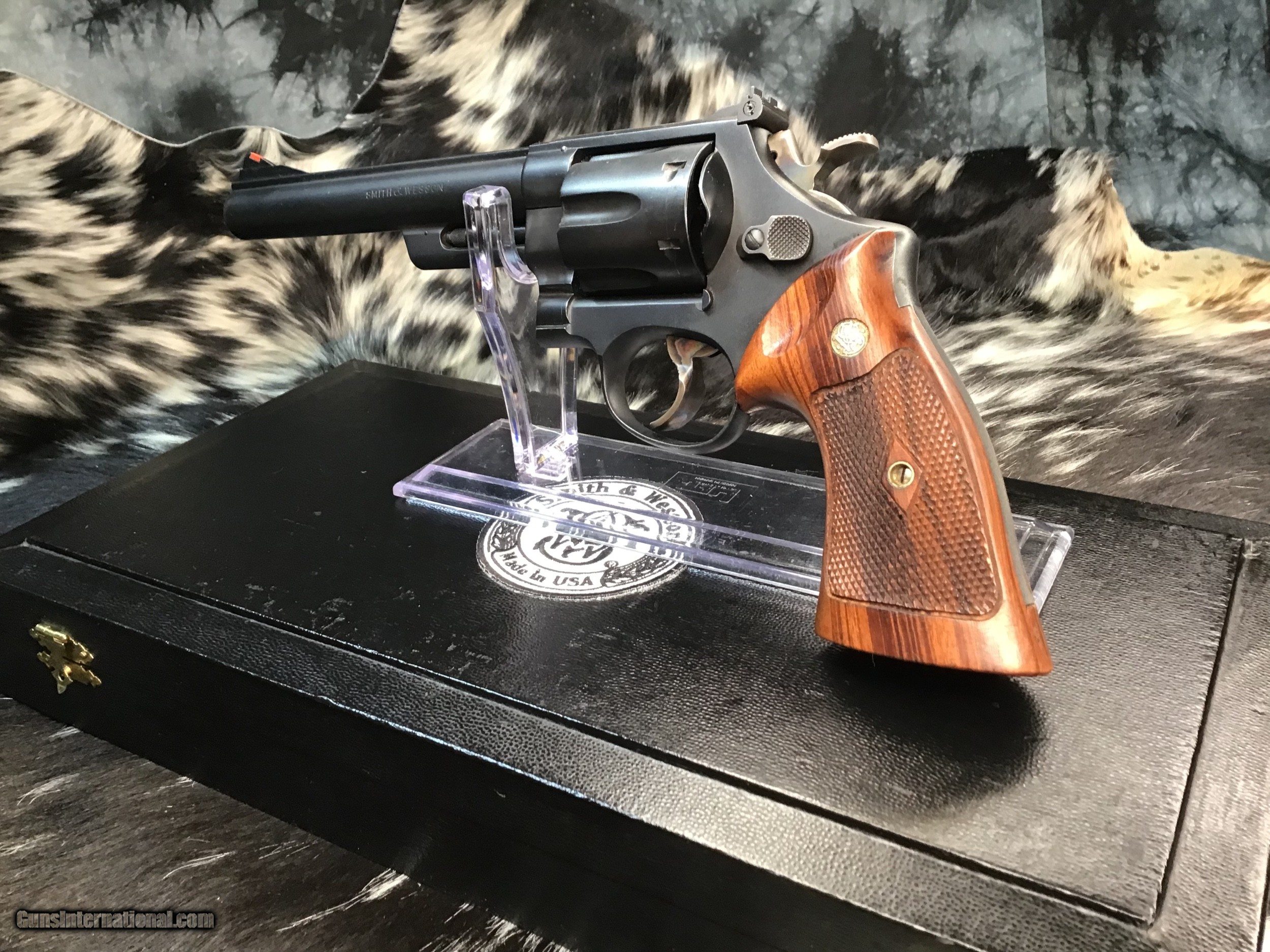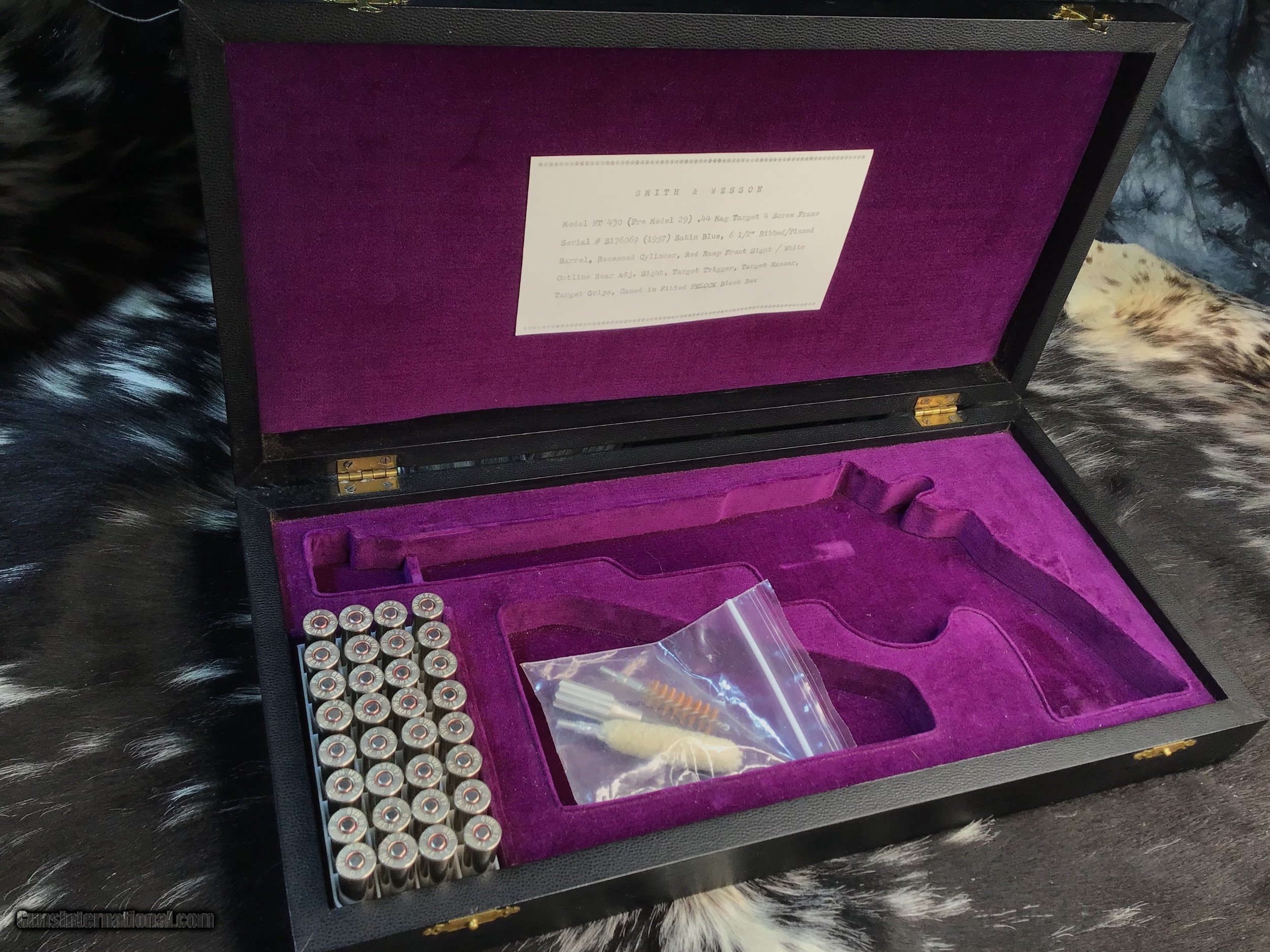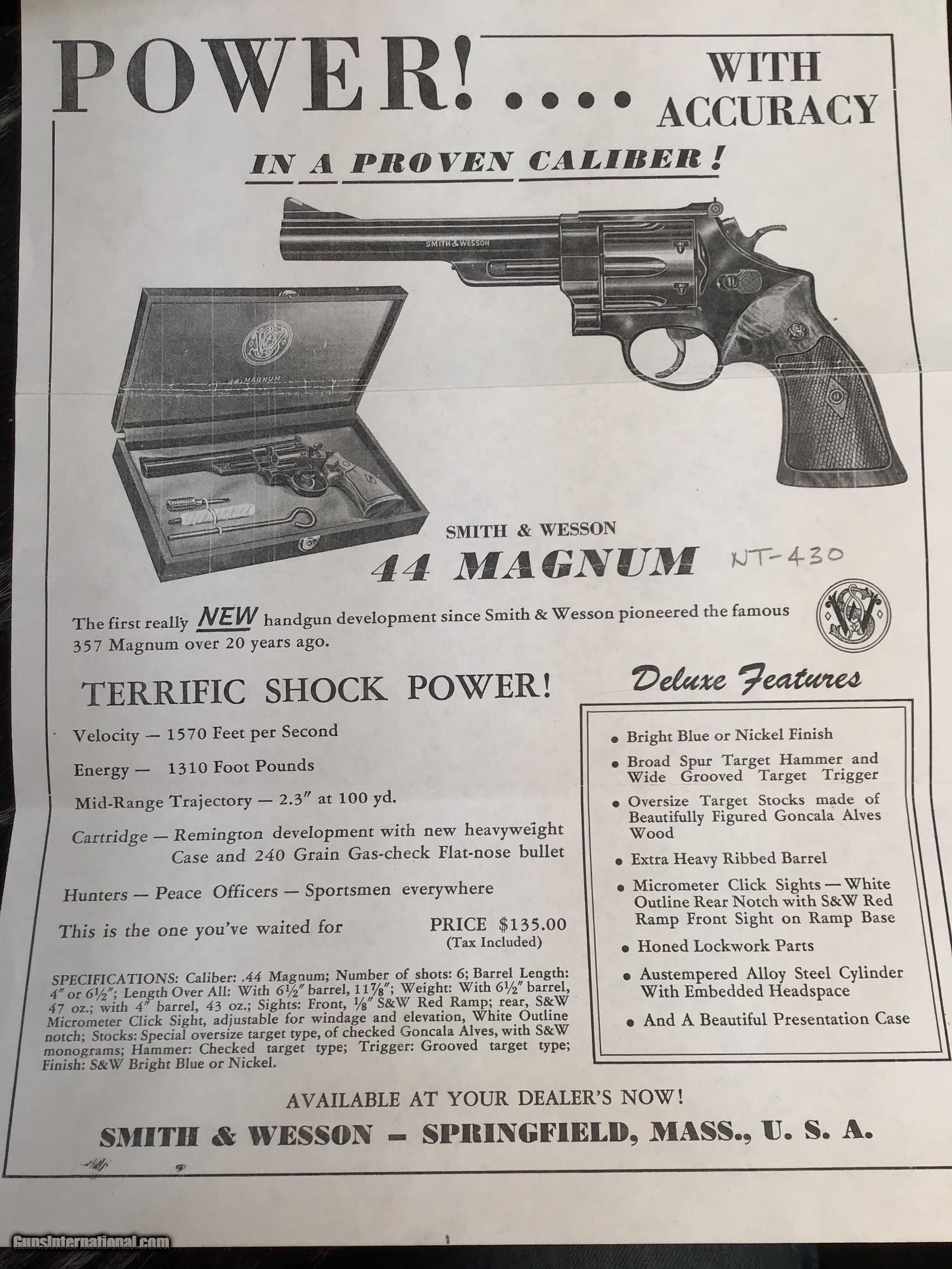 Description: 1957 Mfg. Smith & Wesson Pre-29 model (NT-430) revolver chambered in .44 magnum and wearing a 6 1/2 inch barrel, Beautiful Goncalo Alves Coke bottle Diamond checkered grips and a matte blued finish. Gun remains in excellent condition with light use. Red post front sight with white outline adjustable rear sight. Target hammer, Target trigger and pinned barrel. Come comes in French cut Black presentation case with tools and Smith & Wesson factory letter shown in photos. A fine piece of the American gunmakers craft made in the USA. Add 3% if paying with credit card. Free shipping for all US Veterans. God Bless America from a proud American, and a Viet Nam Vet , thankful for our freedoms.. paid for by the Blood ,Sweat and Tears of our brave men and women in uniform. Ten Below Firearms is a Veteran owned and operated business. We specialize in out of production models of high quality firearms. We love to ship! We ship to all states where legal, just give us a call! Handguns normally ship for $35 and Long guns for $50 and up for extra length long guns. That's 2-3 day USPS Priority shipping, Delivery conformation and with tracking number. Optional Postal insurance is additional $1.75 per $100 and highly recommended. We are OPEN BY APPOINTMENT ONLY FOR IN PERSON VISITS, We trade, sometimes. All payments sent via mail must be received within five days of date of purchase or item will be relisted for sale. Layaway:If needed we offer a 60 day layaway program. Terms, 1/3 of purchase price down, 1/3 due in 30 days, and the final third to include card fees and shipping due at 60 days. Funds are non transferable and non refundable .Layaway is not available on negotiated prices. SOLD Curio/Relic: Yes Handgun Caliber: .44 Remington Magnum Manufacturer: Smith & Wesson Model: Pre-29 Serial Number: S176069 Barrel Length: 6.5 inch Condition: Very good/Fine Metal Condition: Excellent Wood Condition: Excellent Bore Condition: Excellent Action: DA/SA Triggers: Wide Target Finish: Matte Blued Sights: Target adjustable Manufacture Date: 1957 Extras: Factory letter, tools Case: Presentation case Item Location: Mn |