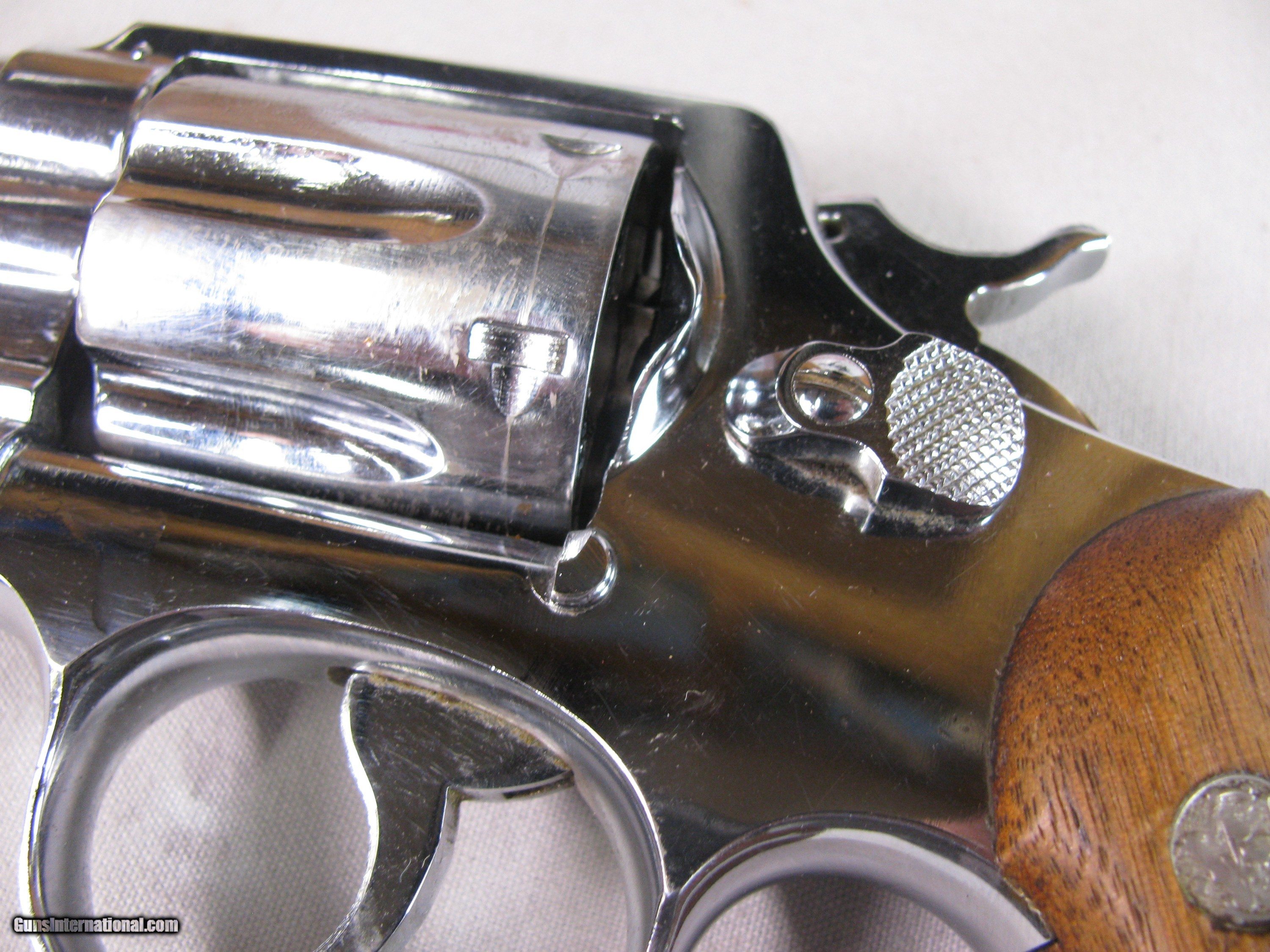 8861 Smith and Wesson Model 36, 38 Special, 2” Barrel, Nickel Finish, wood Grips, Minor marks on the cylinder what looks like from sitting in a gun ba