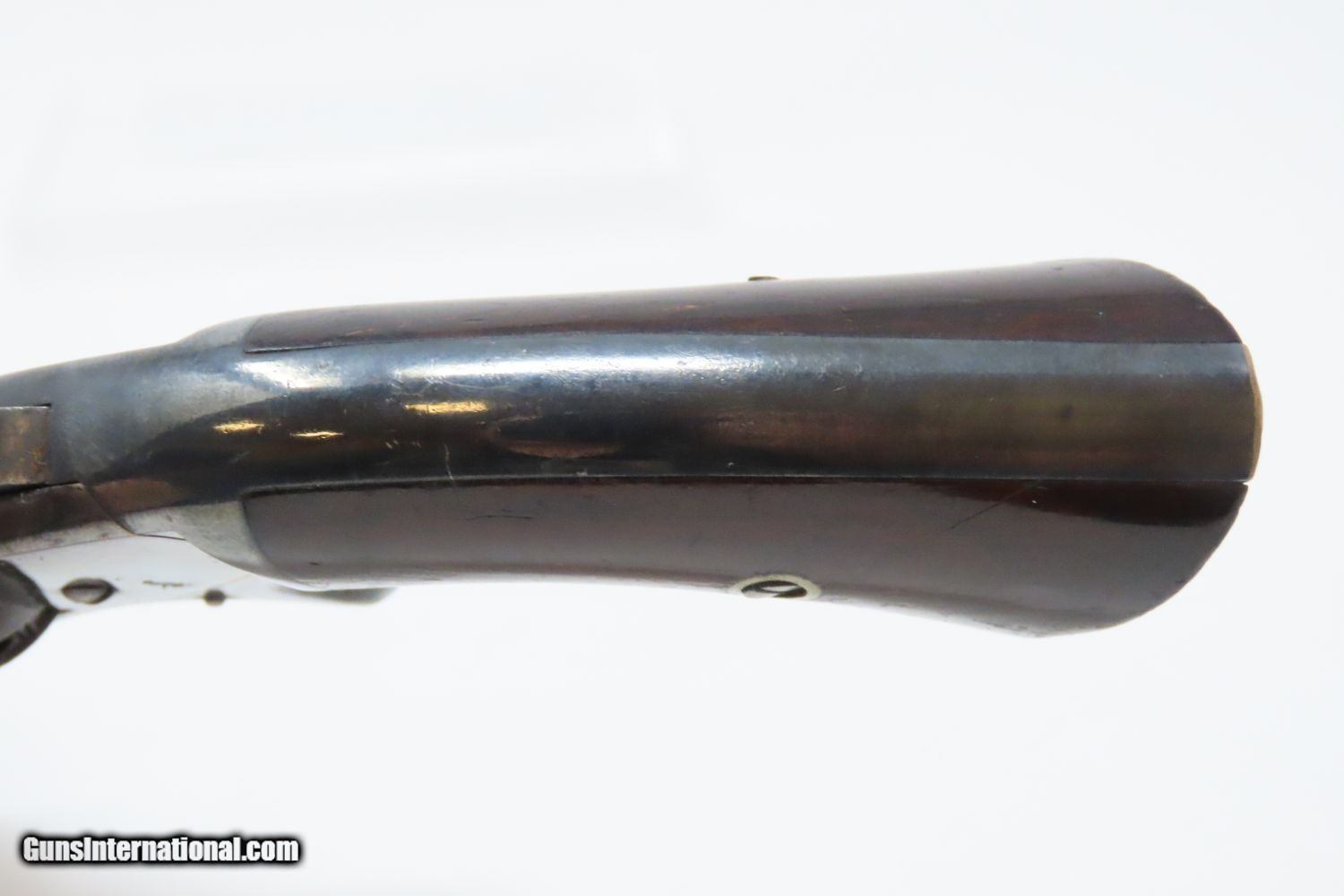Description: Antique CIVIL WAR SMITH & WESSON No. 1 Second Issue Spur Trigger REVOLVER Smith & Wesson ROLLIN WHITE “Bored Through Cylinder” Patent Here we present an antique Smith & Wesson Model No. 1, Second Issue Revolver, manufactured circa 1860 to 1868 in Springfield, Massachusetts. Smith & Wesson manufactured approximately 115,000 of these revolvers between 1860 and 1868. Serial numbers started around 11000 where the 1st Issue left off and continued to 126400. The No. 1 was Smith & Wesson’s first metallic cartridge firearm. It utilized the idea of the “bored through cylinder”, which was patented by Rollin White and subsequently exclusively licensed by Smith & Wesson. This concept has forever changed revolving firearms design, and is the same idea used in revolvers today. S&W, via Rollin White himself, aggressively sued any patent infringers and were able to hold their monopoly on the American market for cartridge revolvers from about 1857 to 1870, whereupon their patent expired. The results were a very profitable business, a broke Rollin White, and a grudging U.S. Chief of Ordnance Alexander Dyer, who was still angry in 1870 about not being able to use the technology during the Civil War. The U.S. government ended up giving Colt their contracts since they valued the larger .44 caliber in the Colt 1860 Armies over the .32 caliber full sized No. 2 Armies. This small revolver is a 7-shot .22 rimfire. It was specifically designed to be a pocket gun, being very small and light. The No. 1 was the precursor to larger firearms that were simply scaled up to be more suitable for use as martial weapons. Though not a primary military arm during the American Civil War, handguns were commonly privately purchased by soldiers for use on the battlefield. Whether legend or fact, it is interesting to note something commonly read about pocket revolvers of the day: that while they could be used for self-defense against the enemy, many soldiers kept them on their person to defend themselves against an unwanted amputation in the primitive field hospitals that were notorious, even in their day. The overall condition is excellent. Bright original blue finish. Functioning action although the cylinder free wheels. Slight wiggle at the hinge. Semi-bright bore. Very good grips with a smooth finish. Here is a prime example from S & W for any antique collection. Own the original! This is a legitimate antique and not a reproduction. Barrel is 3-1/4 inches. Caliber: .22 Rimfire Overall condition as seen in photos. Very Fast. Very Safe. FREE SHIPPING WORLDWIDE. Delivered directly to your door by express mail! Guaranteed AUTHENTIC & Includes CERTIFICATE OF AUTHENTICITY. ancestryguns $1200 #210574 SOLD Antique: Yes |
