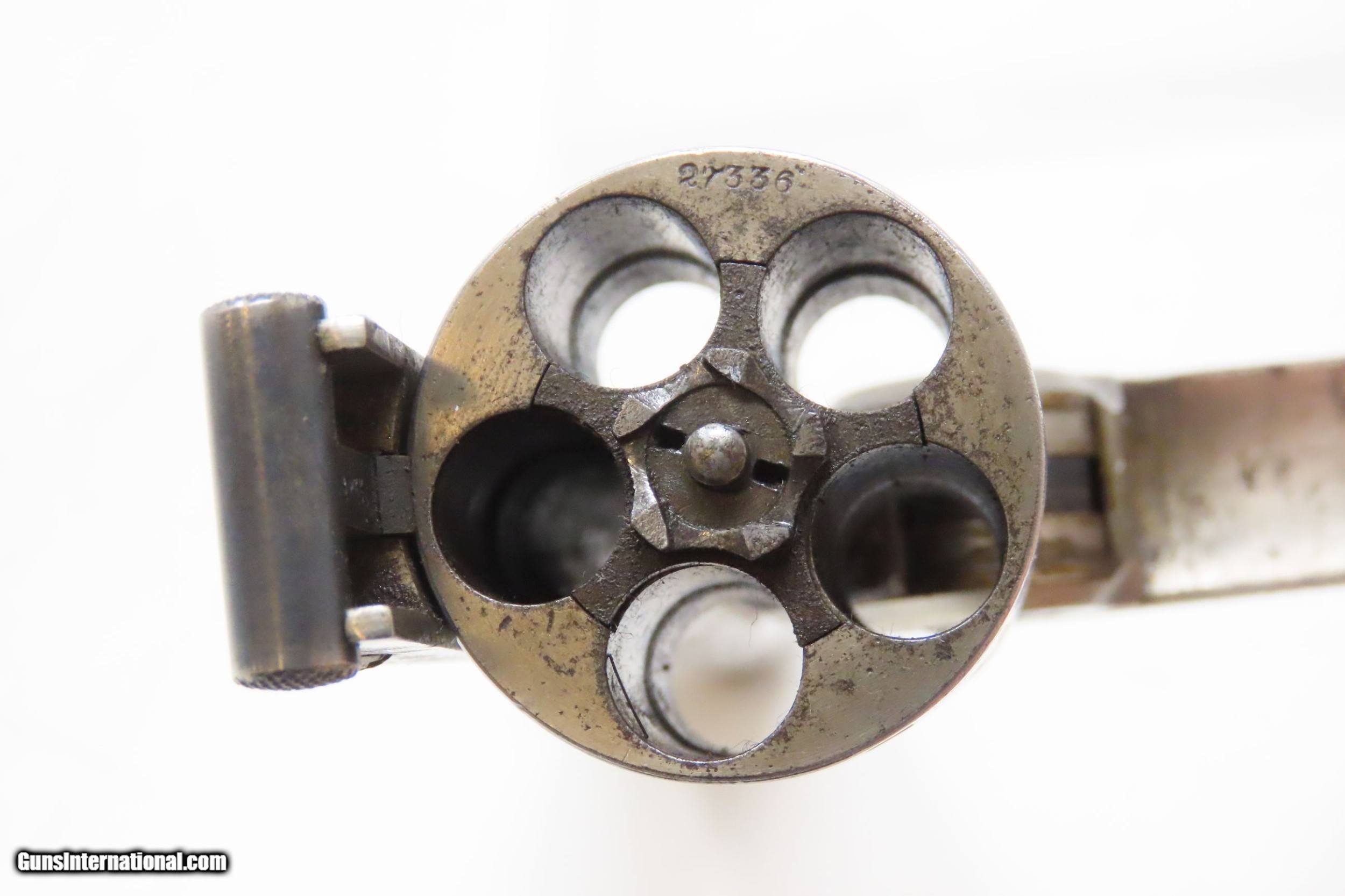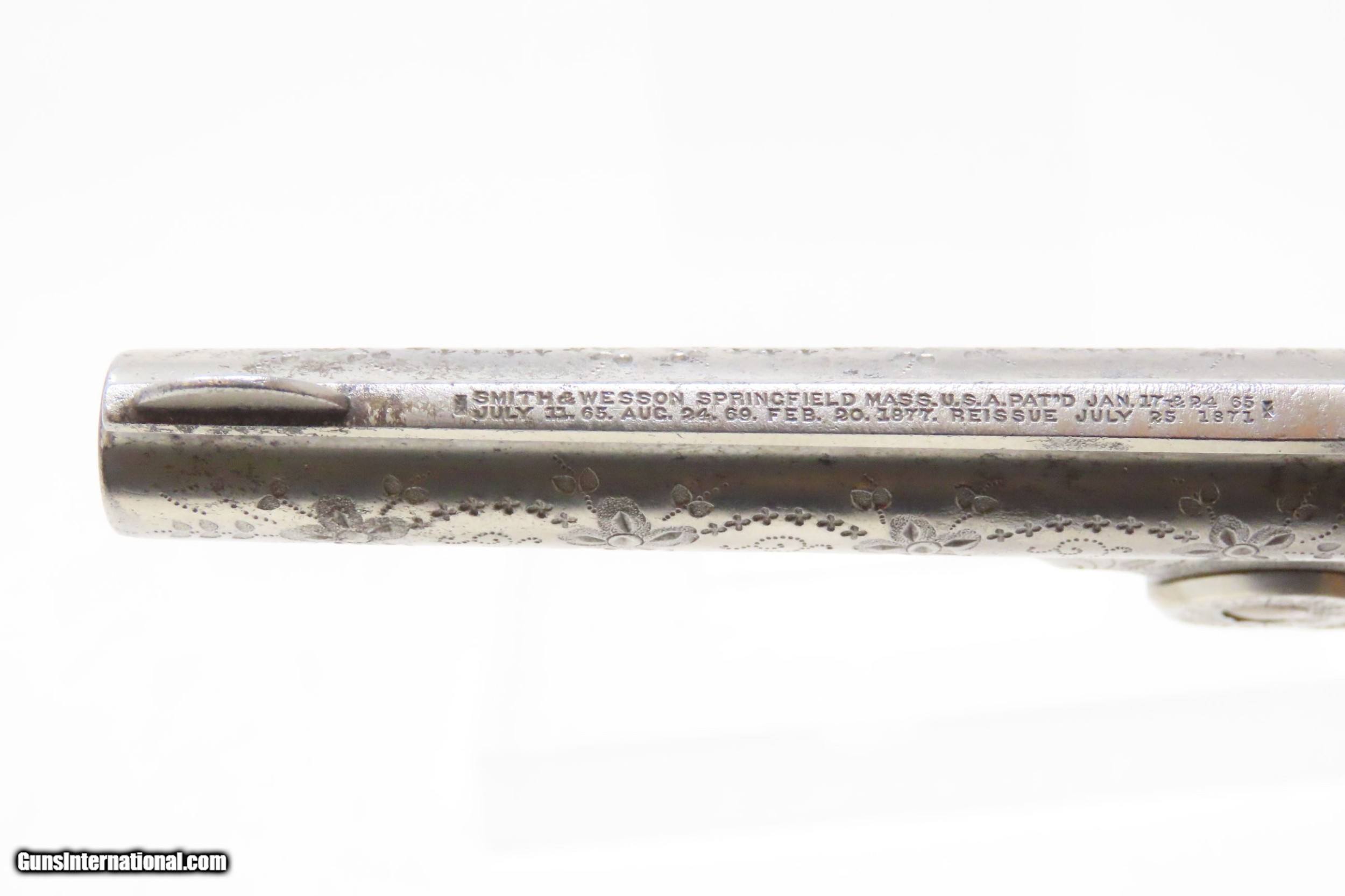 Description: Antique SMITH & WESSON Model 1-1/2 Third Issue .32 SINGLE ACTION Revolver PANEL SCENE ENGRAVED with PEARL GRIP! Here we present an antique Smith & Wesson Model Number 1-1/2 .32 S&W Third Issue Revolver, made circa the 1878-1892 in Springfield, Massachusetts. The No. 1 was Smith & Wesson’s first metallic cartridge firearm. It utilized the idea of the “bored through cylinder”, which was patented by Rollin White and subsequently exclusively licensed by Smith & Wesson. This concept has forever changed revolving firearms design, and is the same idea used in revolvers today. S&W, via Rollin White himself, aggressively sued any patent infringers and were able to hold their monopoly on the American market for cartridge revolvers from about 1857 to 1870, whereupon their patent expired. The results were a very profitable business, a broke Rollin White, and a grudging U.S. Chief of Ordnance Alexander Dyer, who was still angry in 1870 about not being able to use the technology during the Civil War. The U.S. government ended up giving Colt their contracts since they valued the larger .44 caliber in the Colt 1860 Armies over the .32 caliber full sized No. 2 Armies. The S&W Model No. 1-1/2 Revolver Third Issue is known as the “Model 1-1/2 Single Action Revolver”. The major difference between this issue and the first two issues is the breaking at the top, which is consistent with the design of the Safety Hammerless .38 Single Action. It also lacks the ejector rod under the barrel, the large hinge in front of, and just below the barrel, and the extractor that ejects spent cartridges when the barrel is hinged downward. This revolver marked the debut of the .32 S&W centerfire cartridge. Serial numbers range from 1 to approximately 97,500 with a production run between 1878 and 1892. The overall condition is good. Robust action (the ejection pin does not function). Dim bore, clear and contains a few spots of pitting. Deep engravings on the frame and barrel. Legible markings. Both pearl grips are secure and remain vibrant. Numbers match. Here is a nice S&W revolver from the glory days of the Old West! Own the original! This is a legitimate antique and not a reproduction. Barrel is 3-1/2 inches. Caliber: .32 S&W Overall condition as seen in photos. Very Fast. Very Safe. FREE SHIPPING WORLDWIDE. Delivered directly to your door by express mail! Guaranteed AUTHENTIC & Includes CERTIFICATE OF AUTHENTICITY. ancestryguns $1500 #217465 SOLD Antique: Yes |
