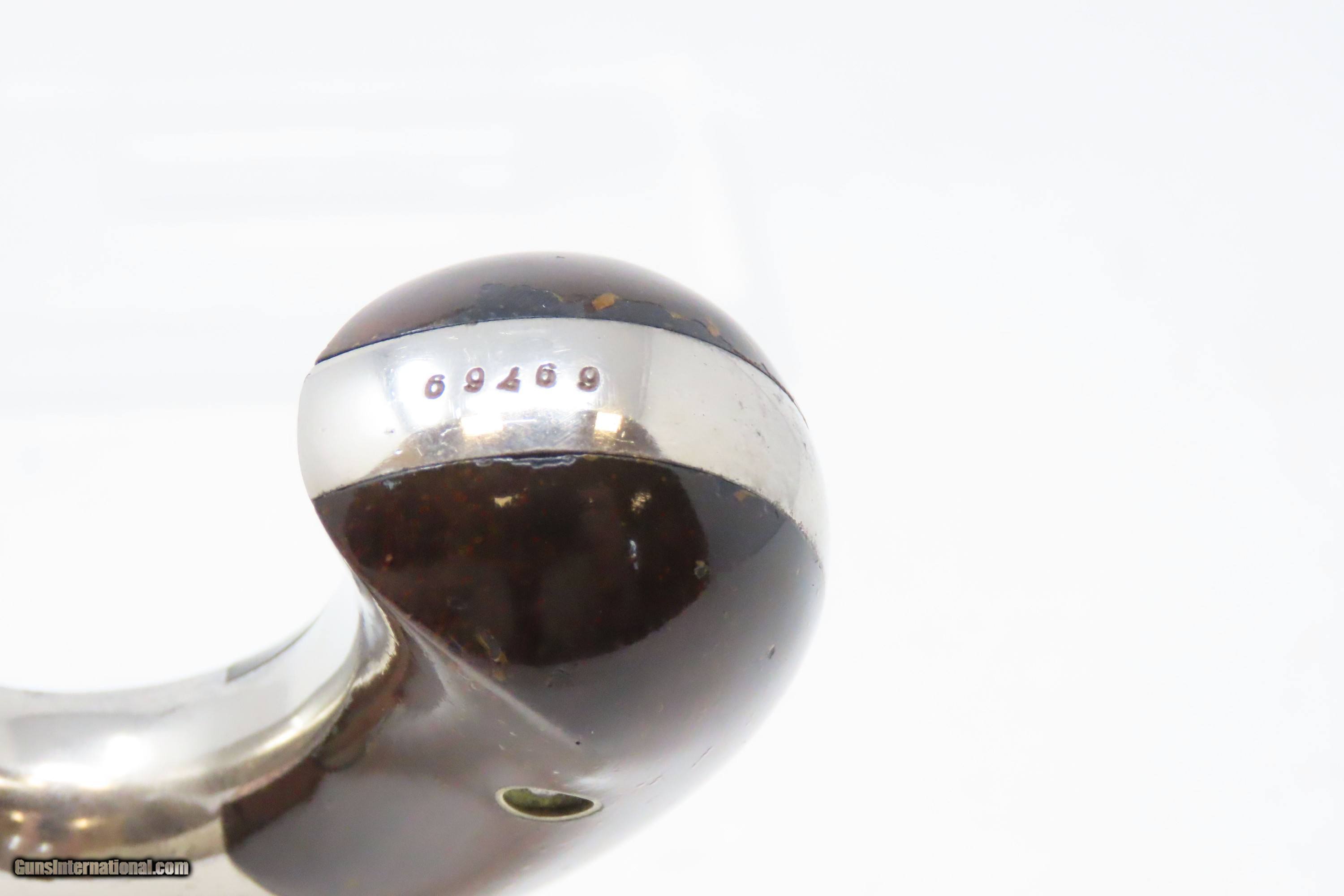 Description: Antique SMITH & WESSON Number 1-1/2 2nd Issue .32 Cal. “NEW MODEL” Revolver Nickel Plated WILD WEST S&W Spur Trigger Here we present an antique Smith & Wesson Model Number 1-1/2 .32 Rimfire 2nd Issue Revolver, also known as the “New Model” Number 1-1/2, made circa 1868-1875 in Springfield, Massachusetts. Like the 1st Issue, it was also produced in blued steel and nickel-plated varieties, with most models having a ?3 1⁄2-inch barrel. 2nd Issue guns were serial numbered consecutively after the 1st Issue, with numbers ranging from approximately 26,300 through 127,000. The No. 1 was Smith & Wesson’s first metallic cartridge firearm. It utilized the idea of the “bored through cylinder”, which was patented by Rollin White and subsequently exclusively licensed by Smith & Wesson. This concept has forever changed revolving firearms design, and is the same idea used in revolvers today. S&W, via Rollin White himself, aggressively sued any patent infringers and were able to hold their monopoly on the American market for cartridge revolvers from about 1857 to 1870, whereupon their patent expired. The results were a very profitable business, a broke Rollin White, and a grudging U.S. Chief of Ordnance Alexander Dyer, who was still angry in 1870 about not being able to use the technology during the Civil War. The U.S. government ended up giving Colt their contracts since they valued the larger .44 caliber in the Colt 1860 Armies over the .32 caliber full sized No. 2 Armies. The overall condition is fine. Original nickel finish. Excellent action. Both grips are in very good shape with less than average wear. Sharp markings. The bore is shiny bright with nice rifling. Own the original! This is a legitimate antique and not a reproduction. Barrel is 3-1/2 inches. Caliber: .32 Rimfire Overall condition as seen in photos. Very Fast. Very Safe. FREE SHIPPING WORLDWIDE. Delivered directly to your door by express mail! Guaranteed AUTHENTIC & Includes CERTIFICATE OF AUTHENTICITY. ancestryguns $1550 #228307 SOLD Antique: Yes |