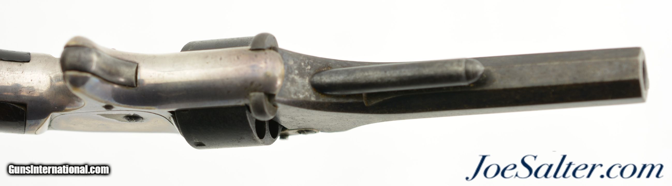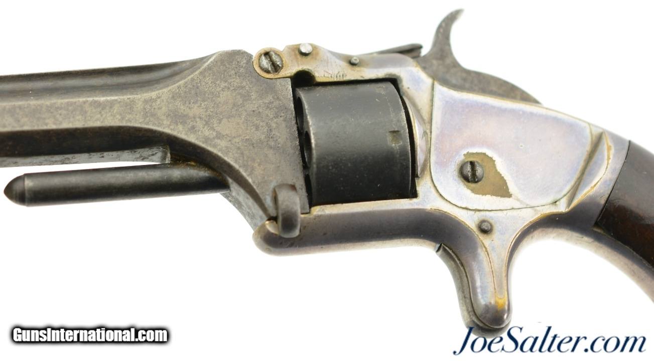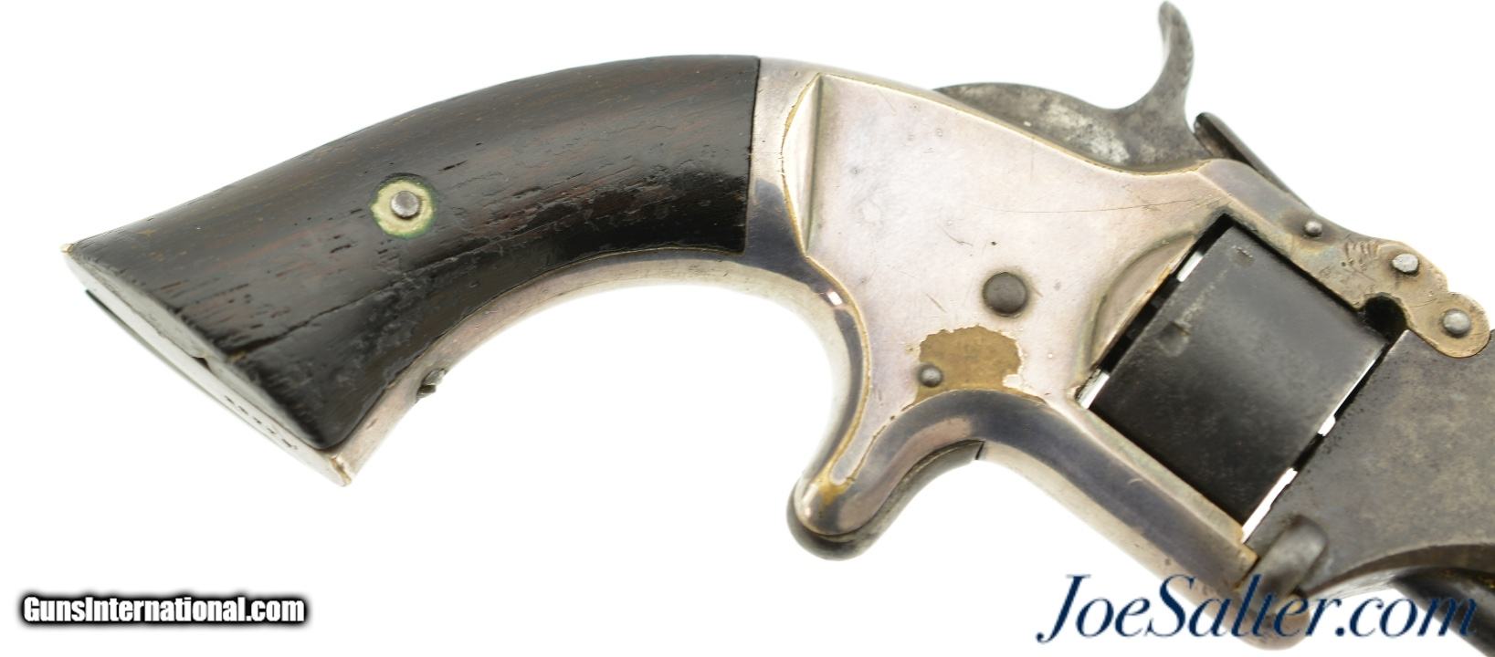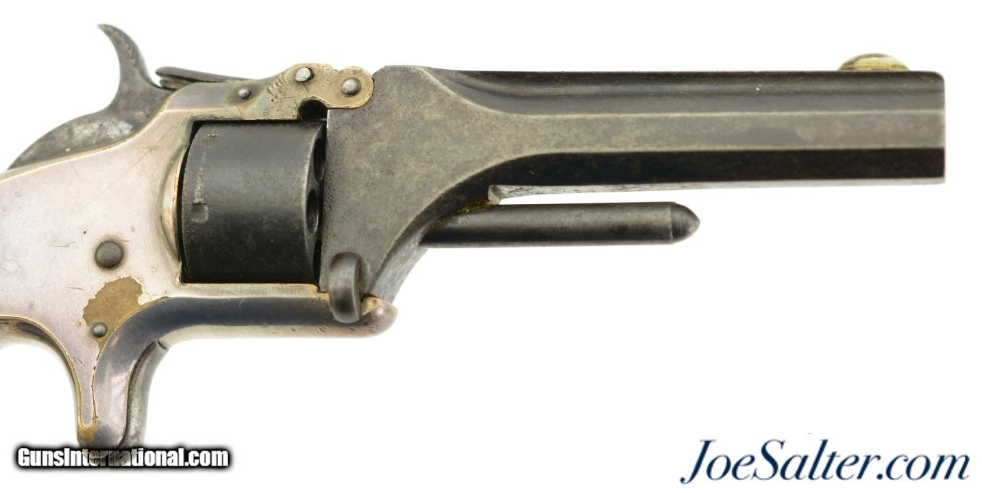 Serial #22770, .22 RF, 3 inch ribbed octagon barrel with a very fine bore with light roughness and strong rifling. This is the Smith & Wesson Model #1, Second issue revolver manufactured from 1860-68. In very fine plus condition the Civil War era pocket pistol retains about 90-95% of the original silver plate on the frame, most of which has a very nice patina flaked in several spots on the side plate and frame. The barrel has a mottled blue gray finish with some very fine scattered pinprick pitting. The cylinder, batch numbered to the barrel, cylinder and frame, retains much of a later added blue finish covering some mild pitting underneath. The rosewood grips are serial numbered to the gun with the right panel having an old repaired crack. Mechanically the action is works, cocking with proper cylinder advancement, crisp trigger pull and and no play in the barrel. The cylinder stop spring is weak and doesn't always hold the cylinder in place. An overall very fine example of this classic Antique S&W revolver. Antique.