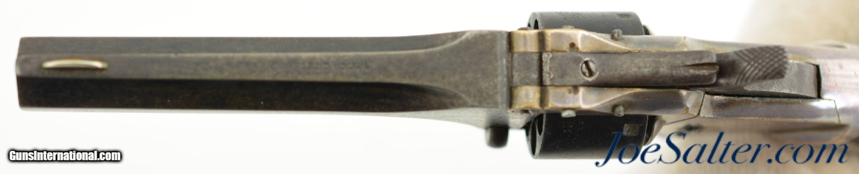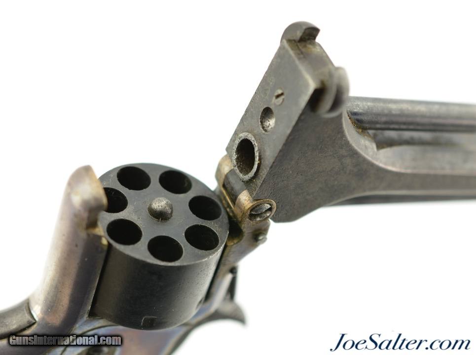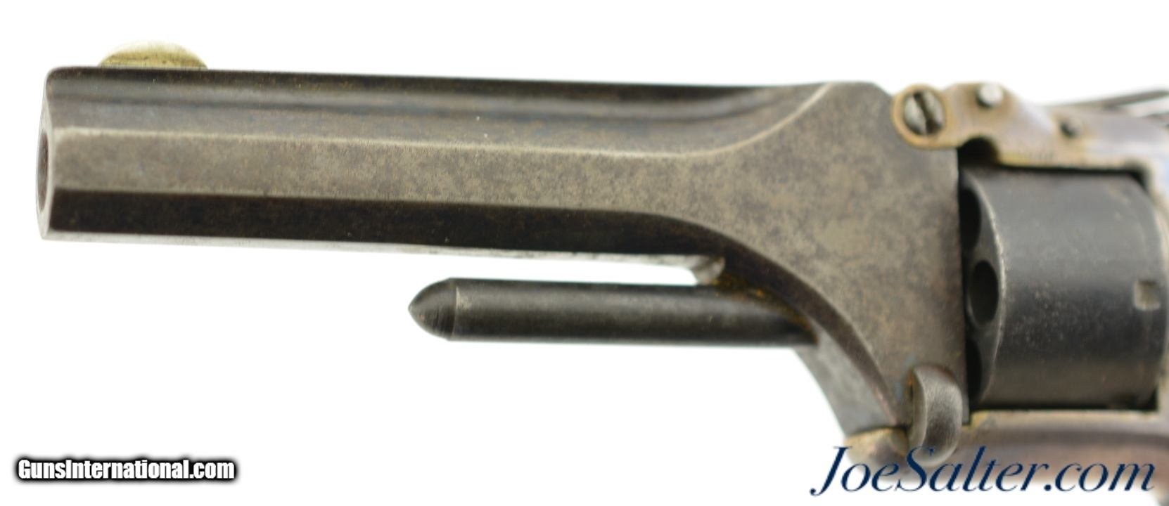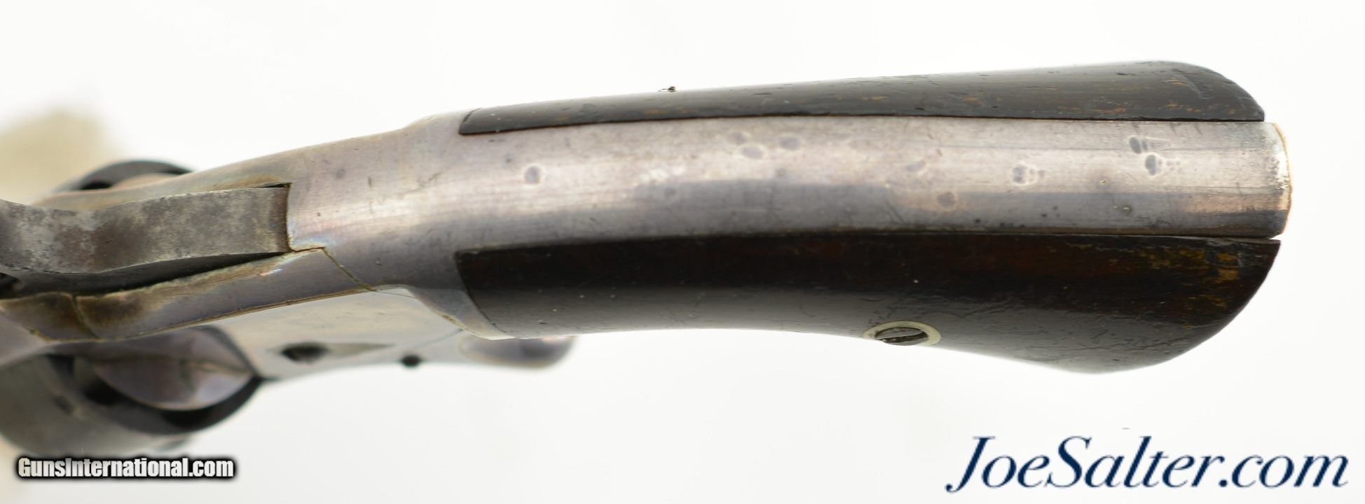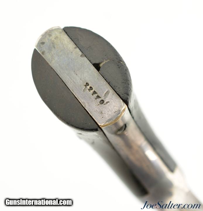 Serial #22770, .22 RF, 3 inch ribbed octagon barrel with a very fine bore with light roughness and strong rifling. This is the Smith & Wesson Model #1, Second issue revolver manufactured from 1860-68. In very fine plus condition the Civil War era pocket pistol retains about 90-95% of the original silver plate on the frame, most of which has a very nice patina flaked in several spots on the side plate and frame. The barrel has a mottled blue gray finish with some very fine scattered pinprick pitting. The cylinder, batch numbered to the barrel, cylinder and frame, retains much of a later added blue finish covering some mild pitting underneath. The rosewood grips are serial numbered to the gun with the right panel having an old repaired crack. Mechanically the action is works, cocking with proper cylinder advancement, crisp trigger pull and and no play in the barrel. The cylinder stop spring is weak and doesn't always hold the cylinder in place. An overall very fine example of this classic Antique S&W revolver. Antique.