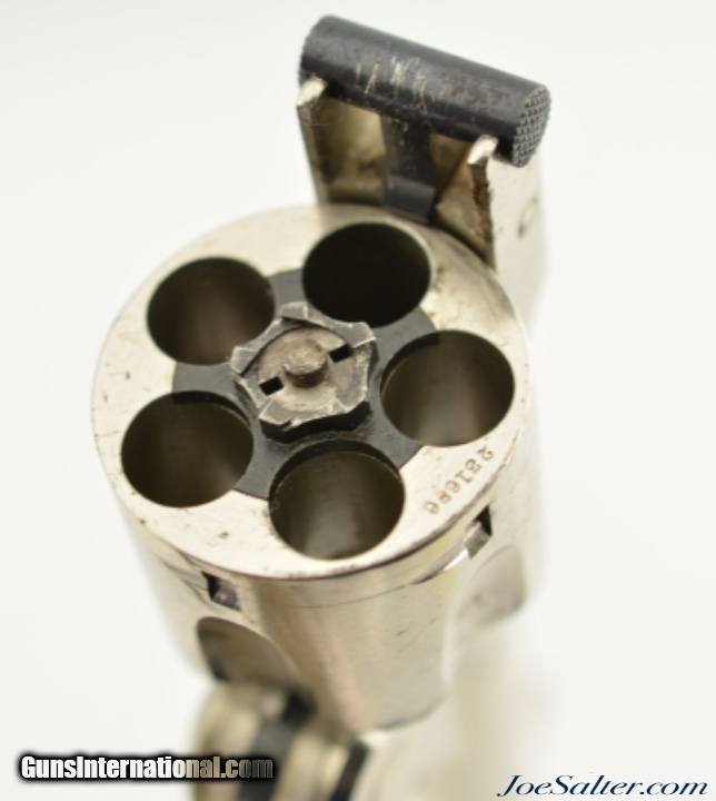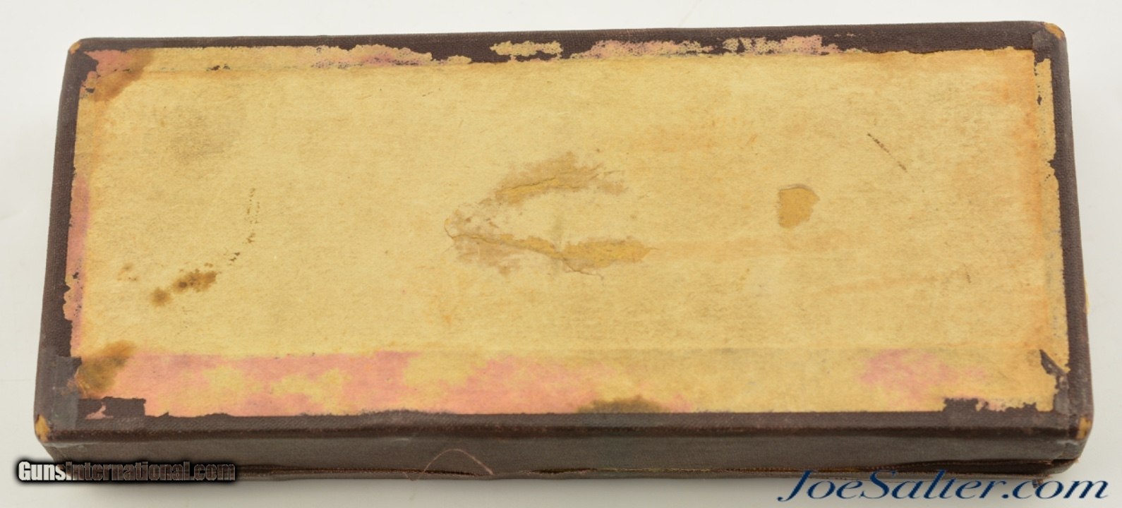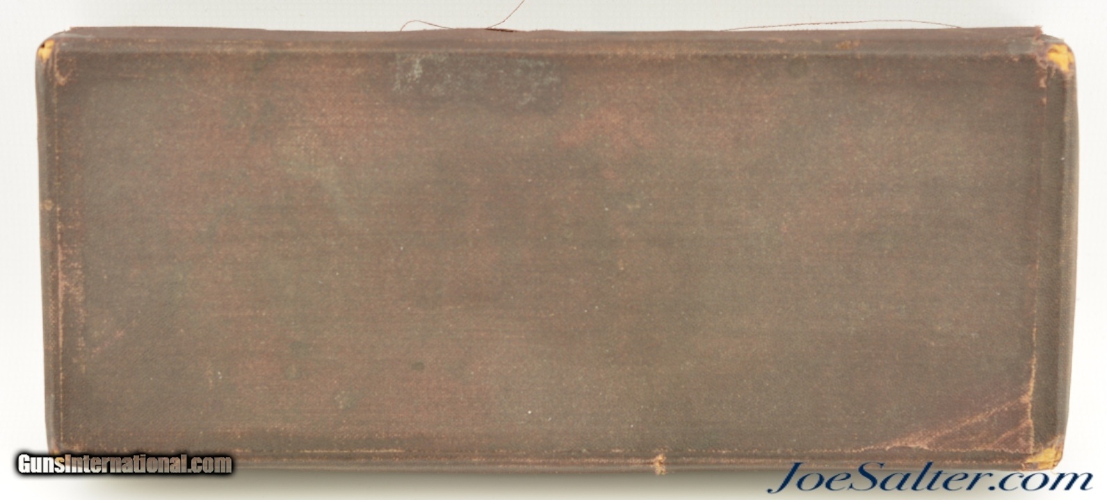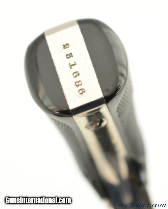 Description: Serial #231686, .32 S&W, 3" ribbed round barrel with a partially bright very good bore showing some areas of light pitting and oxidation with otherwise strong rifling. This is the 4th model 32 Double-action revolver manufactured by Smith & Wesson in the early 1900's. In excellent overall condition it retains about 92-95% overall bright nickel finish with very light flaking on the cylinder and the right side of the frame. The latch and triggerguard retain a similar amount of original bright blue toning to mild gray-brown and showing some light freckling while the hammer and trigger show somewhat muted case-hardening with wisps of vibrant colors. All markings are crisp and clear and the black checkered hard rubber grips remain in near excellent condition. The left panel retains a nice patent date along the bottom edge and the right panel is properly scratch-numbered matching the frame. The remaining serialized parts are matching, barrel-to-frame fit is solid and the action seems to function well mechanically with very good timing and lock-up. An original deep purple paper-covered box is included that remains in very good condition showing a few small tears and scuffing along the edges. The proper end label is mostly intact and there is no visible number along the bottom. An excellent boxed example of the 32 S&W Double-action. FFL or C&R SOLD Curio/Relic: Yes |