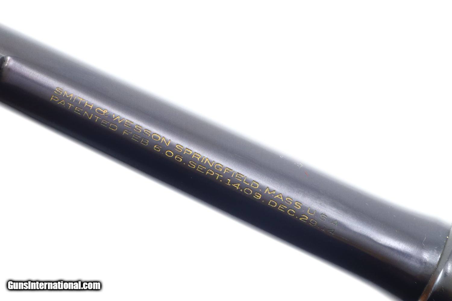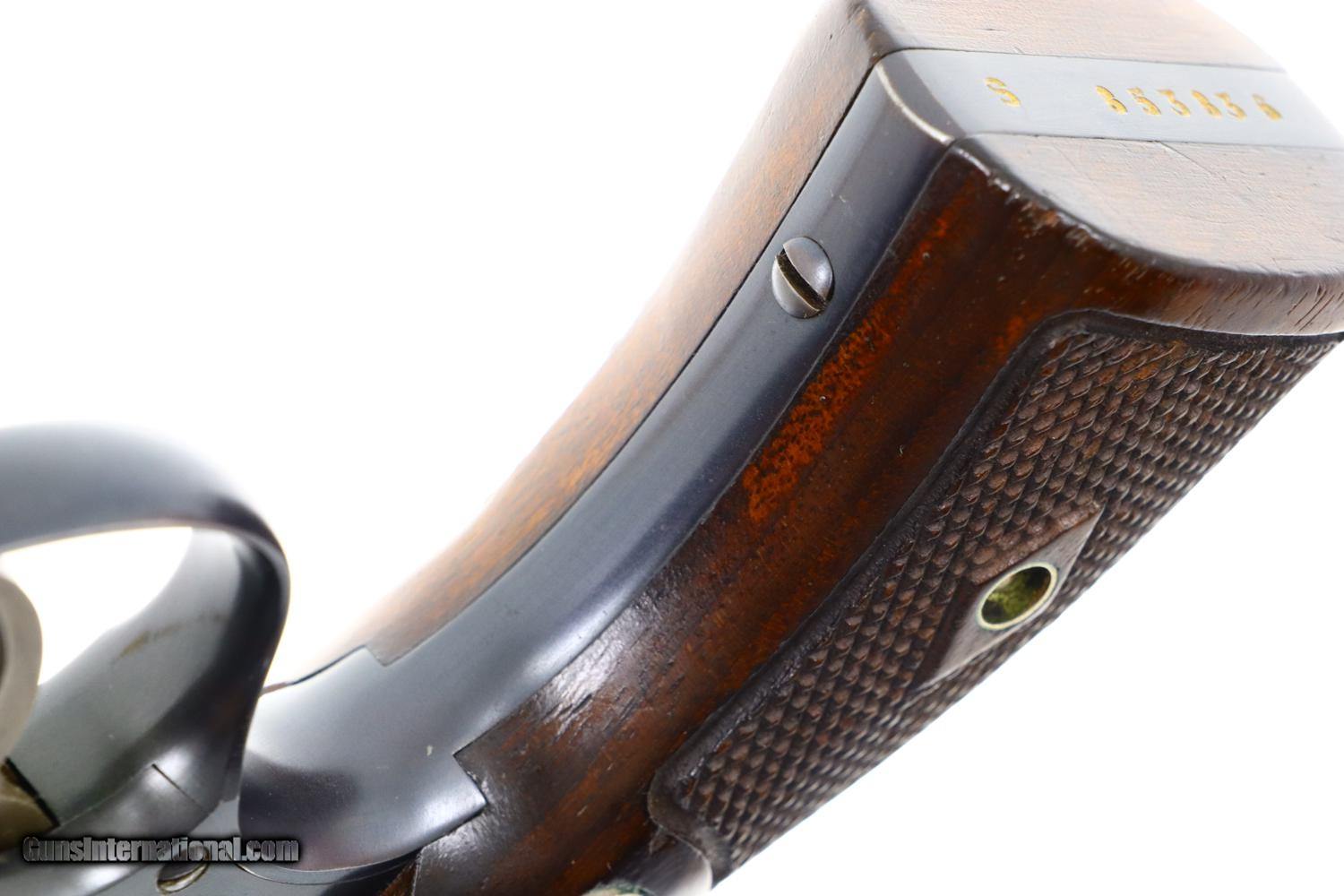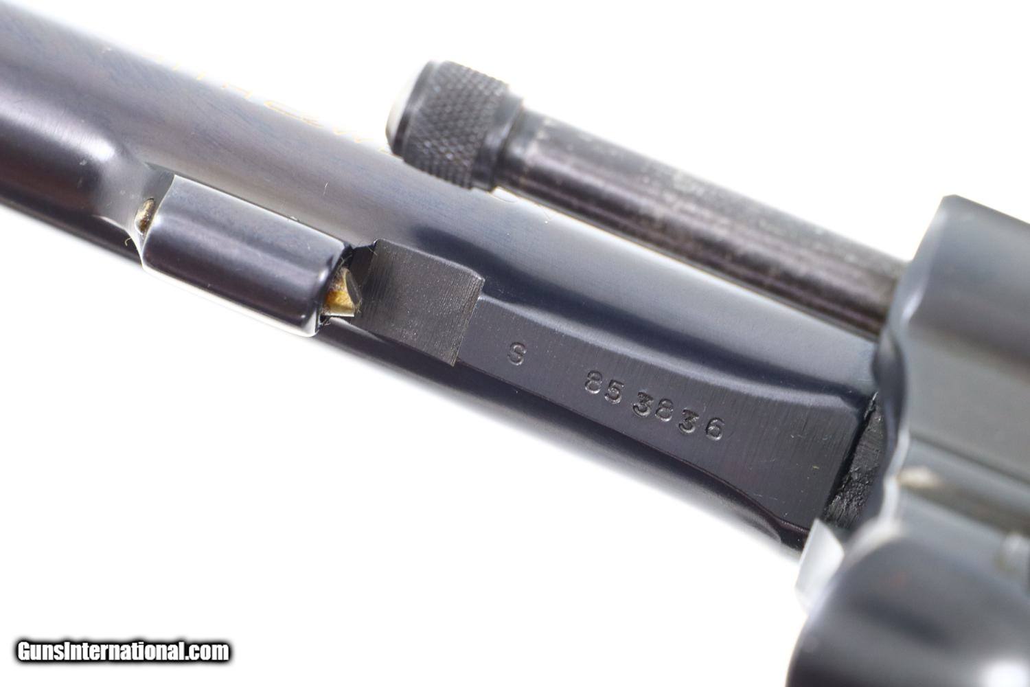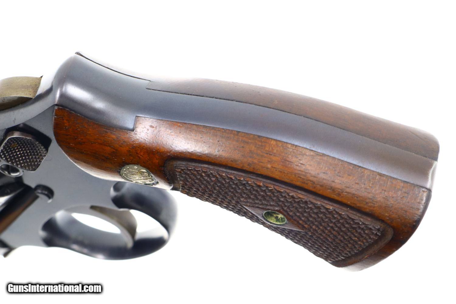 Description: Synopsis: A wonderful and Classic S&W, Pre-Model 10, 5 Screw. Description: A very high condition S&W Pre-Model 10 revolver in 5-screw configuration, .38 S&W Special, made in 1950s with 5” barrel, fixed sights and serial numbered in the “S” prefix range. Matching numbered barrel and cylinder. Fitted with usual color cased hardened hammer and trigger; standard grips with diamonds around screw escutcheons. Condition: 97-98% original bright blue with trace wear on either side of muzzle, a faint cylinder ring that barely breaks through the blue, and slight toning of the straps, especially the backstrap. Recoil shield shows no cartridge head imprinting. Comparable condition grips. Mirror bore. Perfect manual mechanics. A wonderful, lightly carried and seldom fired S&W 5-screw revolver with classic 5” barrel. ~~Insured shipping fee of $45; most packages shipped using FedEx 2nd Day.~~ SOLD Curio/Relic: Yes Manufacturer: S&W Serial Number: S853836 Caliber Info: .38 S&W Special |