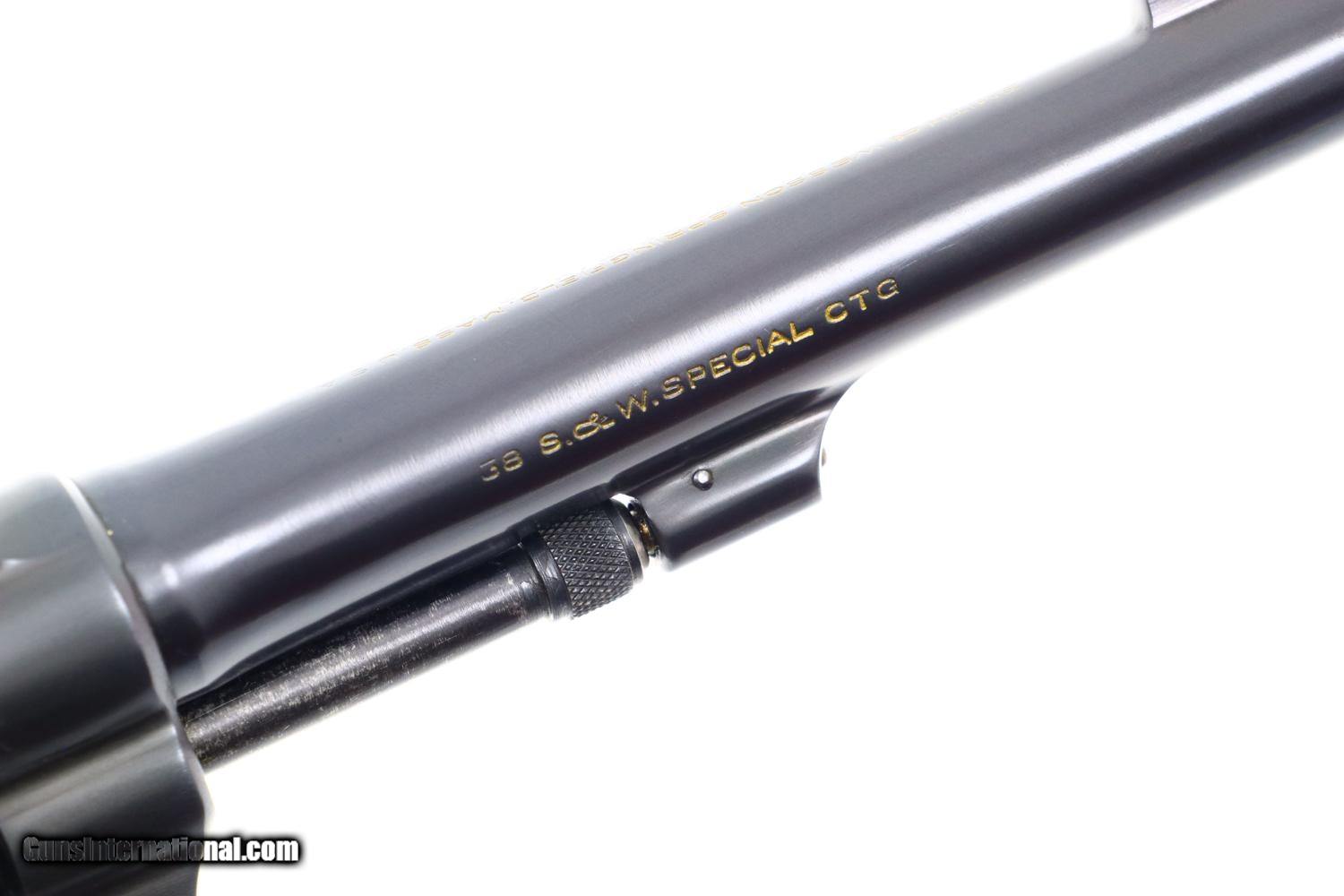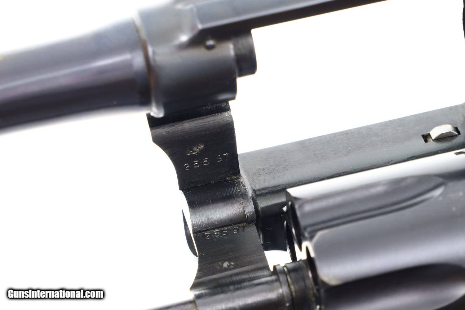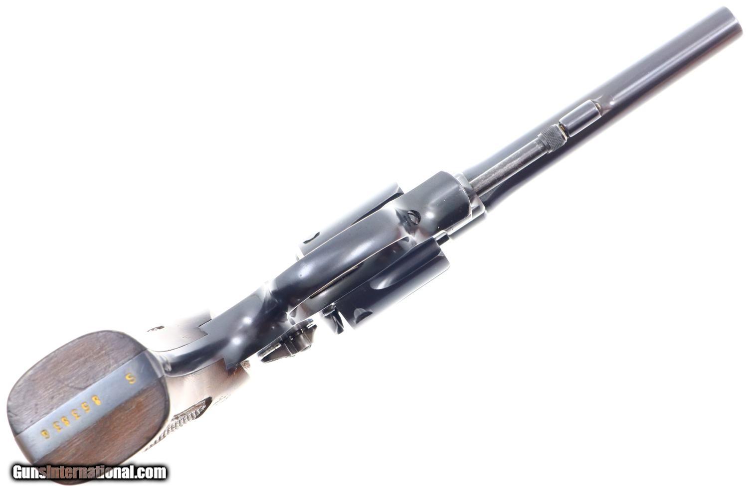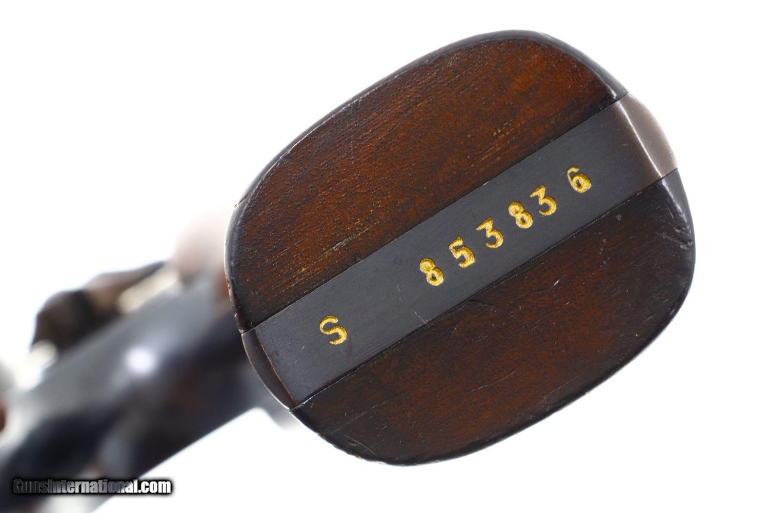 Description: Synopsis: A wonderful and Classic S&W, Pre-Model 10, 5 Screw. Description: A very high condition S&W Pre-Model 10 revolver in 5-screw configuration, .38 S&W Special, made in 1950s with 5” barrel, fixed sights and serial numbered in the “S” prefix range. Matching numbered barrel and cylinder. Fitted with usual color cased hardened hammer and trigger; standard grips with diamonds around screw escutcheons. Condition: 97-98% original bright blue with trace wear on either side of muzzle, a faint cylinder ring that barely breaks through the blue, and slight toning of the straps, especially the backstrap. Recoil shield shows no cartridge head imprinting. Comparable condition grips. Mirror bore. Perfect manual mechanics. A wonderful, lightly carried and seldom fired S&W 5-screw revolver with classic 5” barrel. ~~Insured shipping fee of $45; most packages shipped using FedEx 2nd Day.~~ SOLD Curio/Relic: Yes Manufacturer: S&W Serial Number: S853836 Caliber Info: .38 S&W Special |