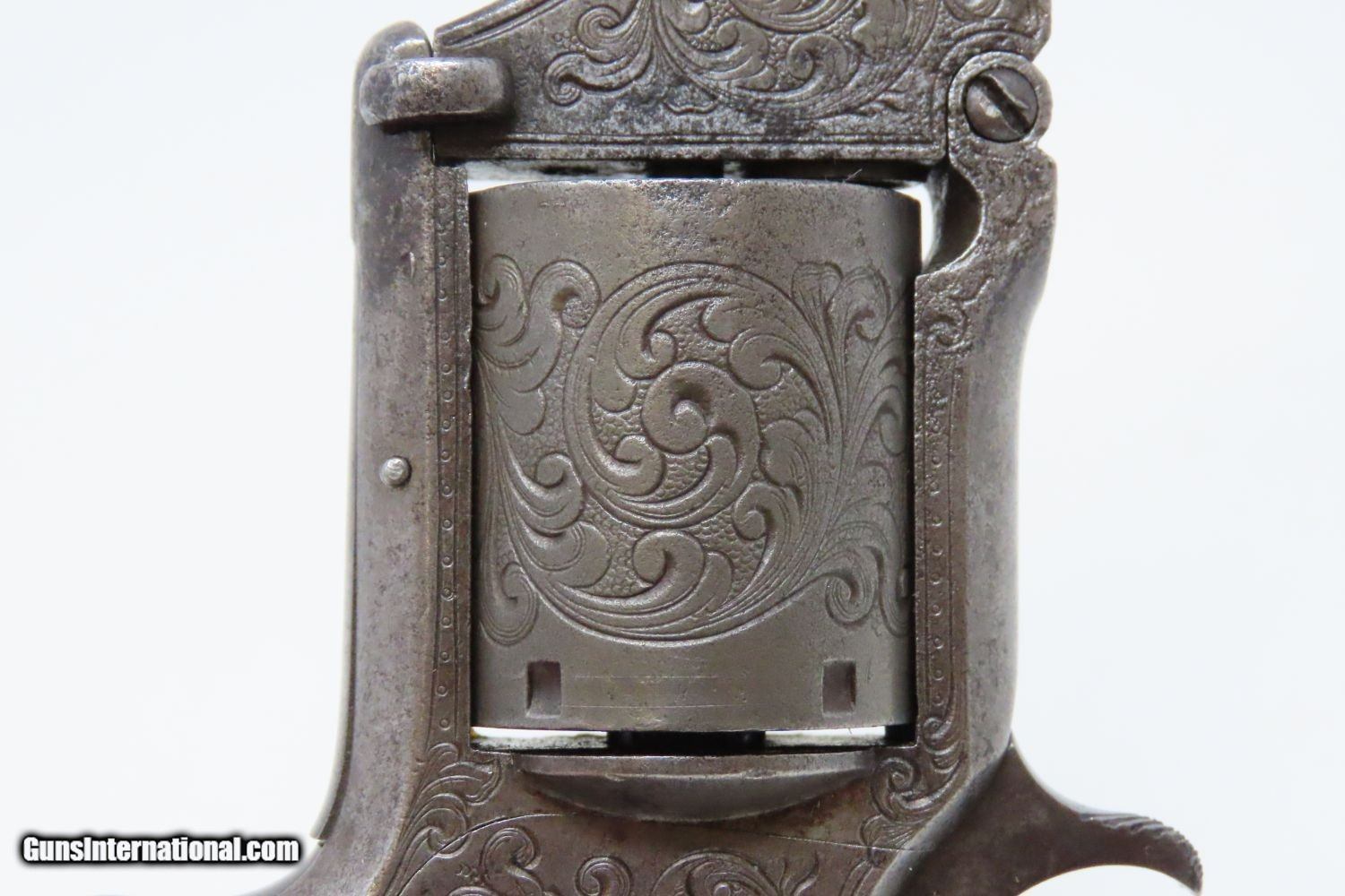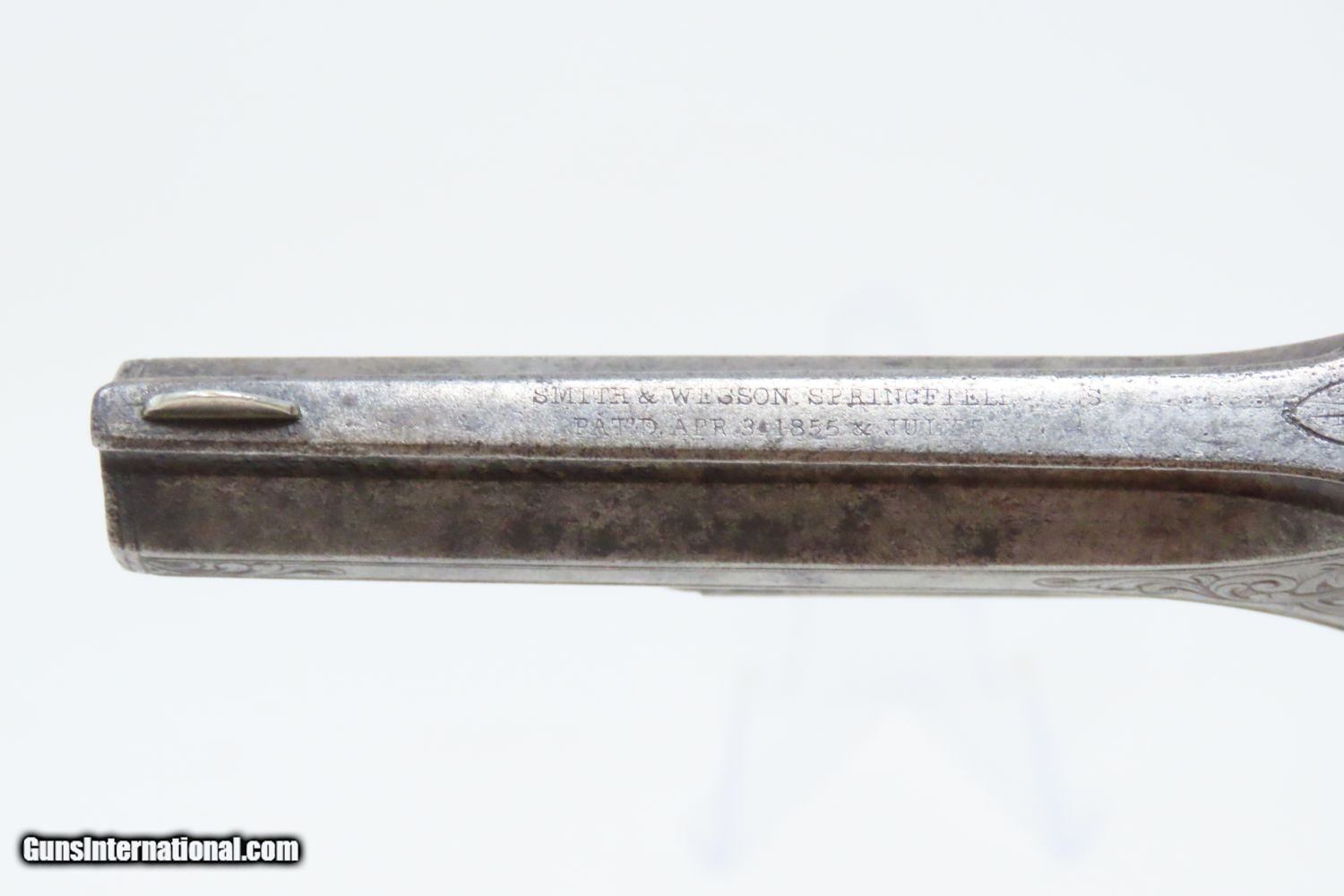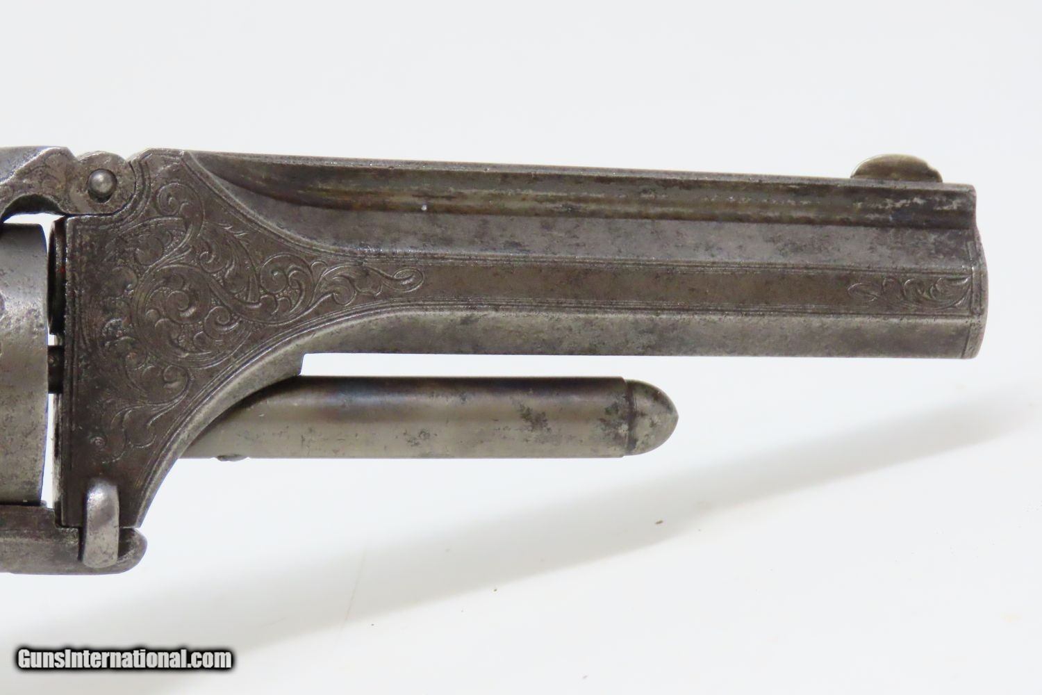 Description: ENGRAVED, PEARL Gripped Antique SMITH & WESSON No. 1 ½ .32 Rimfire REVOLVER “WILD WEST” Revolver with MOTHER OF PEARL GRIPS Here we present an antique Factory Engraved Smith & Wesson Model Number 1-1/2 .32 Rimfire Revolver, made circa 1865-68 in Springfield, Massachusetts. The No. 1 was Smith & Wesson’s first metallic cartridge firearm. It utilized the idea of the “bored through cylinder”, which was patented by Rollin White and subsequently exclusively licensed by Smith & Wesson. This concept has forever changed revolving firearms design, and is the same idea used in revolvers today. S&W, via Rollin White himself, aggressively sued any patent infringers and were able to hold their monopoly on the American market for cartridge revolvers from about 1857 to 1870, whereupon their patent expired. The results were a very profitable business, a broke Rollin White, and a grudging U.S. Chief of Ordnance Alexander Dyer, who was still angry in 1870 about not being able to use the technology during the Civil War. The U.S. government ended up giving Colt their contracts since they valued the larger .44 caliber in the Colt 1860 Armies over the .32 caliber full sized No. 2 Armies. The S&W Model No. 1-1/2 Revolver is simply a scaled-up version of the No. 1, down to the aesthetics. The .32 continued to evolve just as the .22 version, both in features and aesthetics. It was also a commercial success and was well-received by the buying public seeing 26,300 of the First Issue produced and over 100,000 of the updated Second Issue. The overall condition is good. The action (hammer/trigger) remains strong. The cylinder indexes well but does not lockup due to the weak bolt spring. The bore is in good shape. All of the tight floral engravings remain sharp throughout, even on the cylinder! Both pearl grips are firm in very good shape! This example is tight at the hinge and opens easily. This is an old Smith & Wesson revolver that is easy on the eyes. Own the original! This is a legitimate antique and not a reproduction. Barrel is 3-1/2 inches. Caliber: .32 Rimfire Overall condition as seen in photos. Very Fast. Very Safe. FREE SHIPPING WORLDWIDE. Delivered directly to your door by express mail! Guaranteed AUTHENTIC & Includes CERTIFICATE OF AUTHENTICITY. ancestryguns $1375 #201204 SOLD Antique: Yes |