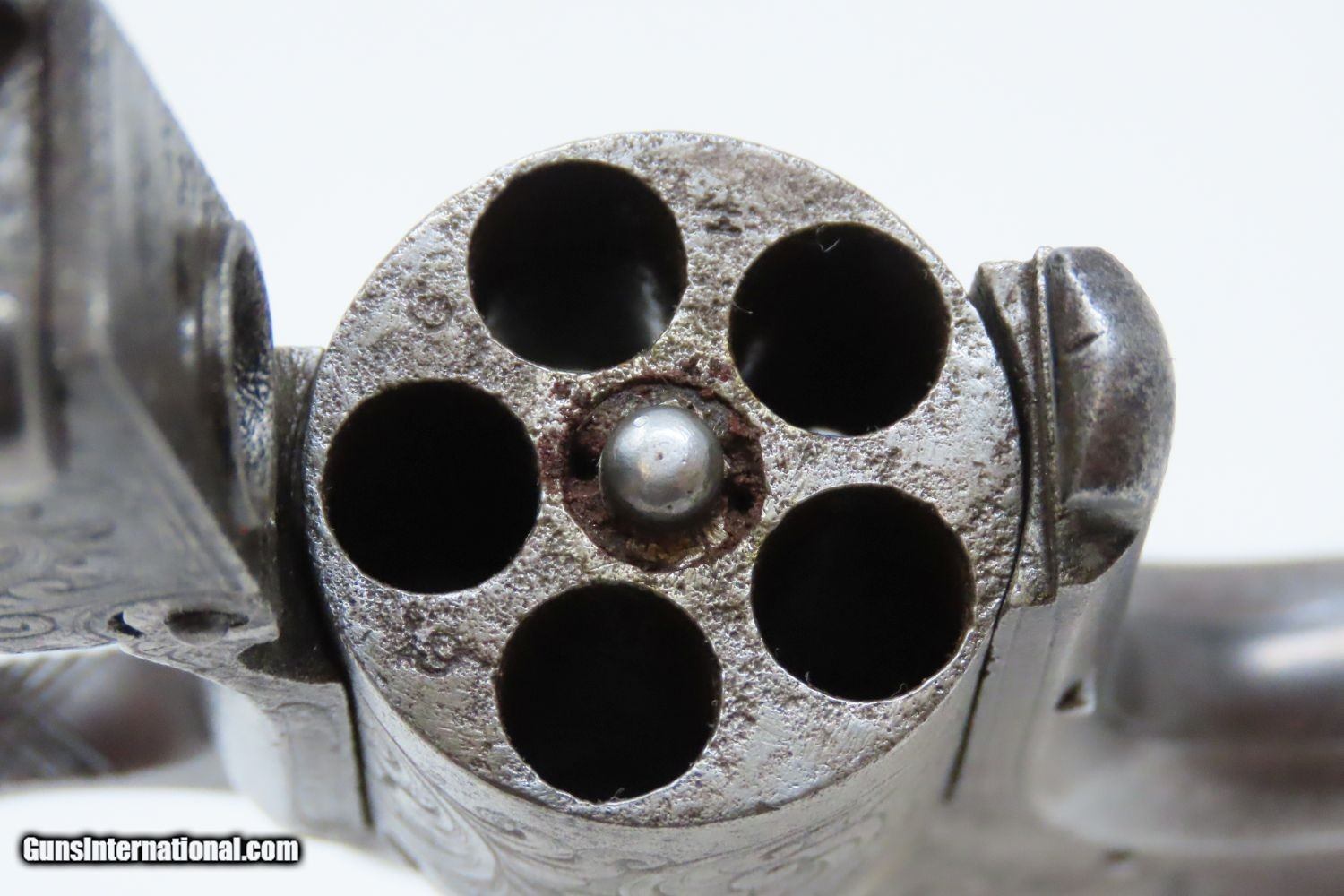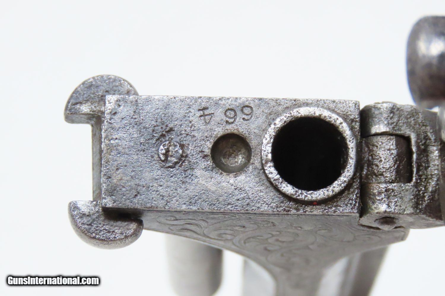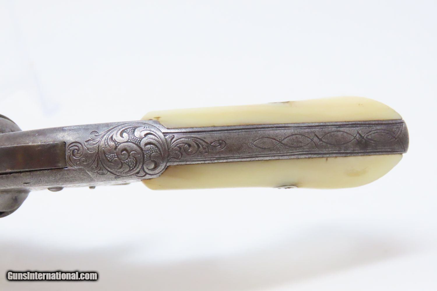 Description: ENGRAVED, PEARL Gripped Antique SMITH & WESSON No. 1 ½ .32 Rimfire REVOLVER “WILD WEST” Revolver with MOTHER OF PEARL GRIPS Here we present an antique Factory Engraved Smith & Wesson Model Number 1-1/2 .32 Rimfire Revolver, made circa 1865-68 in Springfield, Massachusetts. The No. 1 was Smith & Wesson’s first metallic cartridge firearm. It utilized the idea of the “bored through cylinder”, which was patented by Rollin White and subsequently exclusively licensed by Smith & Wesson. This concept has forever changed revolving firearms design, and is the same idea used in revolvers today. S&W, via Rollin White himself, aggressively sued any patent infringers and were able to hold their monopoly on the American market for cartridge revolvers from about 1857 to 1870, whereupon their patent expired. The results were a very profitable business, a broke Rollin White, and a grudging U.S. Chief of Ordnance Alexander Dyer, who was still angry in 1870 about not being able to use the technology during the Civil War. The U.S. government ended up giving Colt their contracts since they valued the larger .44 caliber in the Colt 1860 Armies over the .32 caliber full sized No. 2 Armies. The S&W Model No. 1-1/2 Revolver is simply a scaled-up version of the No. 1, down to the aesthetics. The .32 continued to evolve just as the .22 version, both in features and aesthetics. It was also a commercial success and was well-received by the buying public seeing 26,300 of the First Issue produced and over 100,000 of the updated Second Issue. The overall condition is good. The action (hammer/trigger) remains strong. The cylinder indexes well but does not lockup due to the weak bolt spring. The bore is in good shape. All of the tight floral engravings remain sharp throughout, even on the cylinder! Both pearl grips are firm in very good shape! This example is tight at the hinge and opens easily. This is an old Smith & Wesson revolver that is easy on the eyes. Own the original! This is a legitimate antique and not a reproduction. Barrel is 3-1/2 inches. Caliber: .32 Rimfire Overall condition as seen in photos. Very Fast. Very Safe. FREE SHIPPING WORLDWIDE. Delivered directly to your door by express mail! Guaranteed AUTHENTIC & Includes CERTIFICATE OF AUTHENTICITY. ancestryguns $1375 #201204 SOLD Antique: Yes |