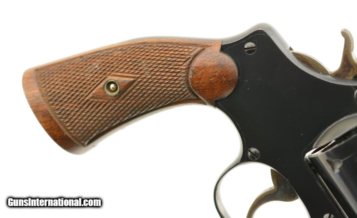 Description: Serial #505426, .32 S&W Long, 3 ¼ inch barrel with a bright, excellent bore. This is the third model 32 Hand Ejector revolver. In excellent condition the barrel, frame and cylinder retain about 96-98% of the original blue finish with some wear around the muzzle, especially on the left side, a very thin drag line on the cylinder and some scattered tiny freckles on the frame. The patent marked hammer and trigger retain virtually all of the original vivid case colors. All numbered parts correctly match. The checkered walnut grips with diamond around the screw escutcheon are in excellent condition, pencil numbered to the gun on the right stock with patent number on the bottom of the left. An excellent example of this little 5 screw revolver. FFL or C& SOLD Curio/Relic: Yes |