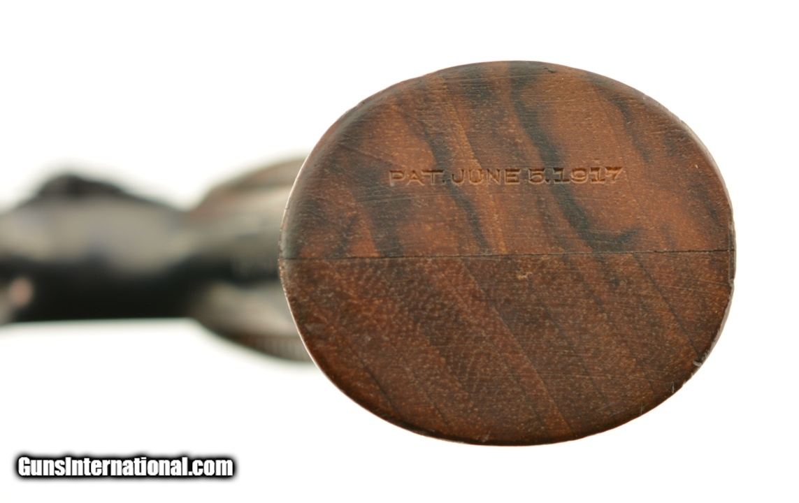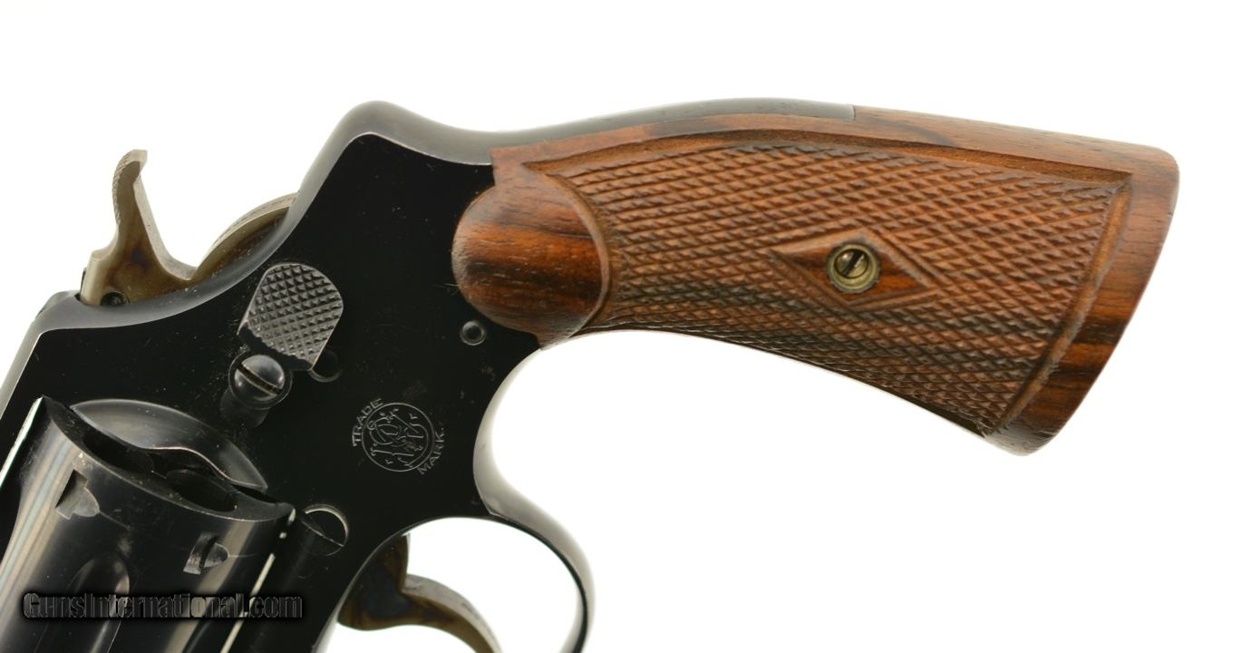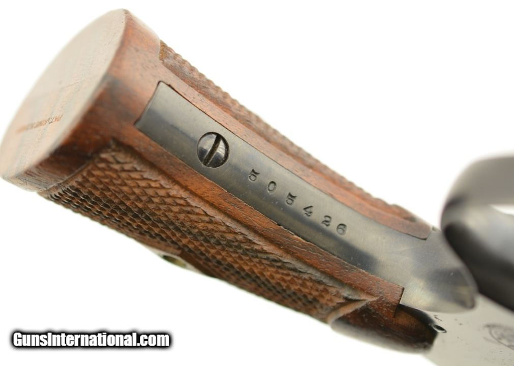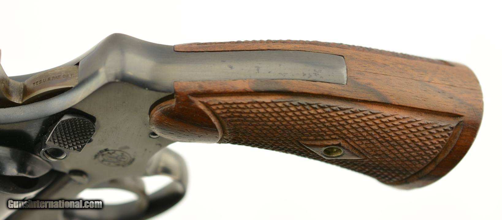 Description: Serial #505426, .32 S&W Long, 3 ¼ inch barrel with a bright, excellent bore. This is the third model 32 Hand Ejector revolver. In excellent condition the barrel, frame and cylinder retain about 96-98% of the original blue finish with some wear around the muzzle, especially on the left side, a very thin drag line on the cylinder and some scattered tiny freckles on the frame. The patent marked hammer and trigger retain virtually all of the original vivid case colors. All numbered parts correctly match. The checkered walnut grips with diamond around the screw escutcheon are in excellent condition, pencil numbered to the gun on the right stock with patent number on the bottom of the left. An excellent example of this little 5 screw revolver. FFL or C& SOLD |