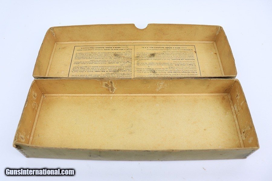 Description: This is a very rare Smith & Wesson Model 1950 Target revolver in the original box. One of only ~5,000 produced, it also has a scarce 4in barrel with mint bore. The revolver has 99% of the original blue remaining with just a little edge wear on the cylinder and a very faint turn line. Beautiful case hardening on hammer and trigger. Excellent grips with only minor handling wear. It comes with the original S&W box, which can be seen as originally designated for the 1926 model but the top of the box has the original label for this model and the box is hand numbered on the bottom with matching serial. Comes with the pamphlet and tools. SOLD Curio/Relic: Yes Handgun Caliber: .44 Special |