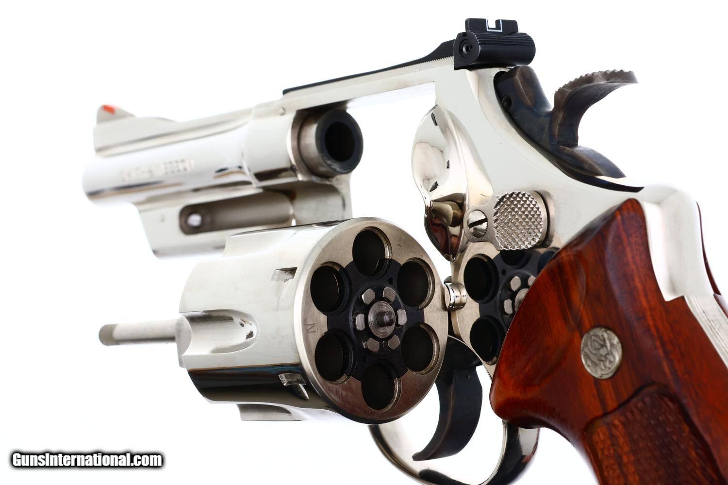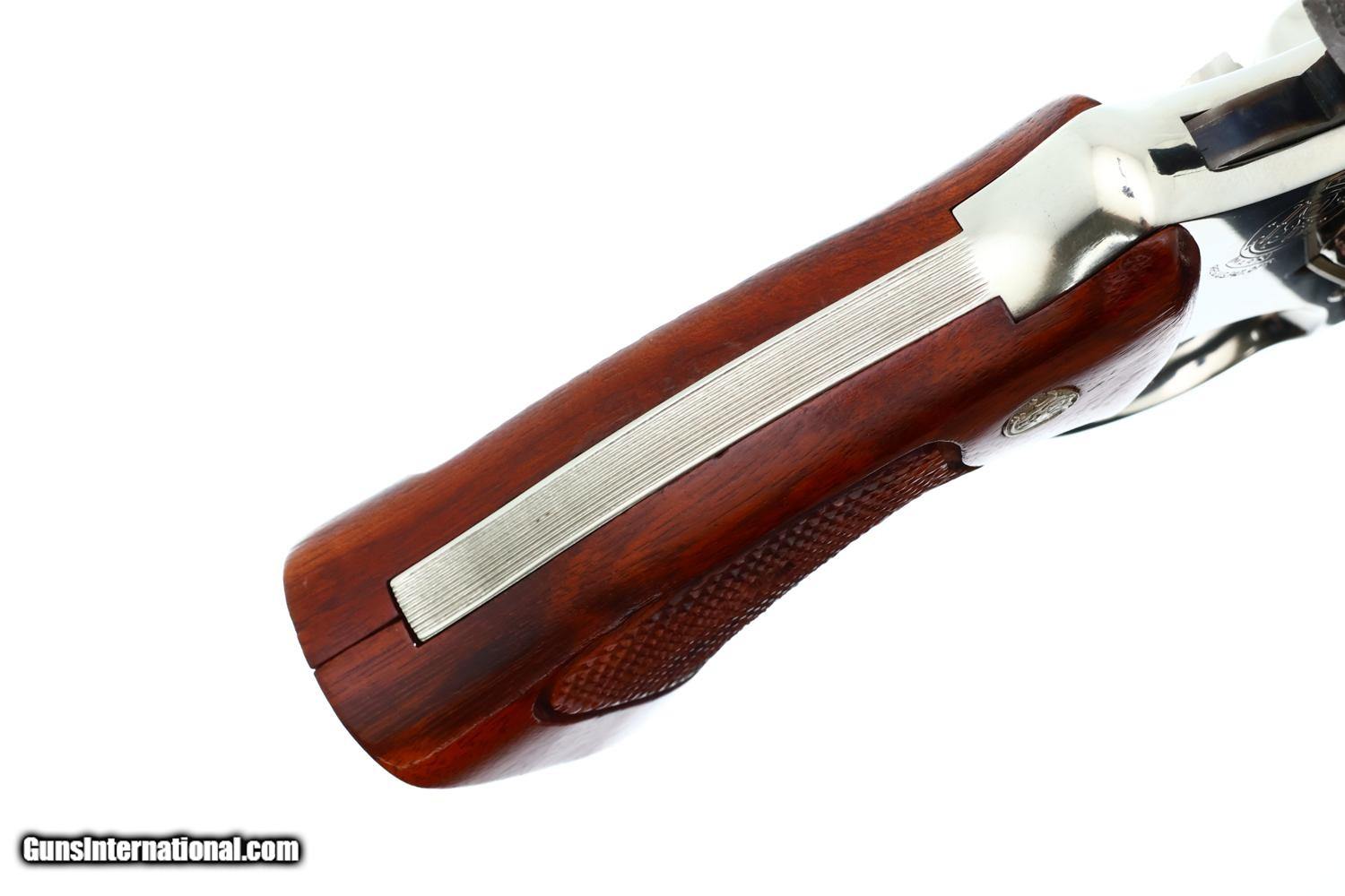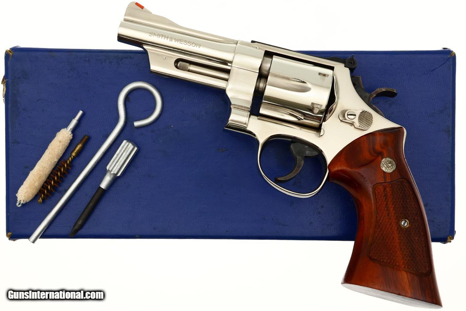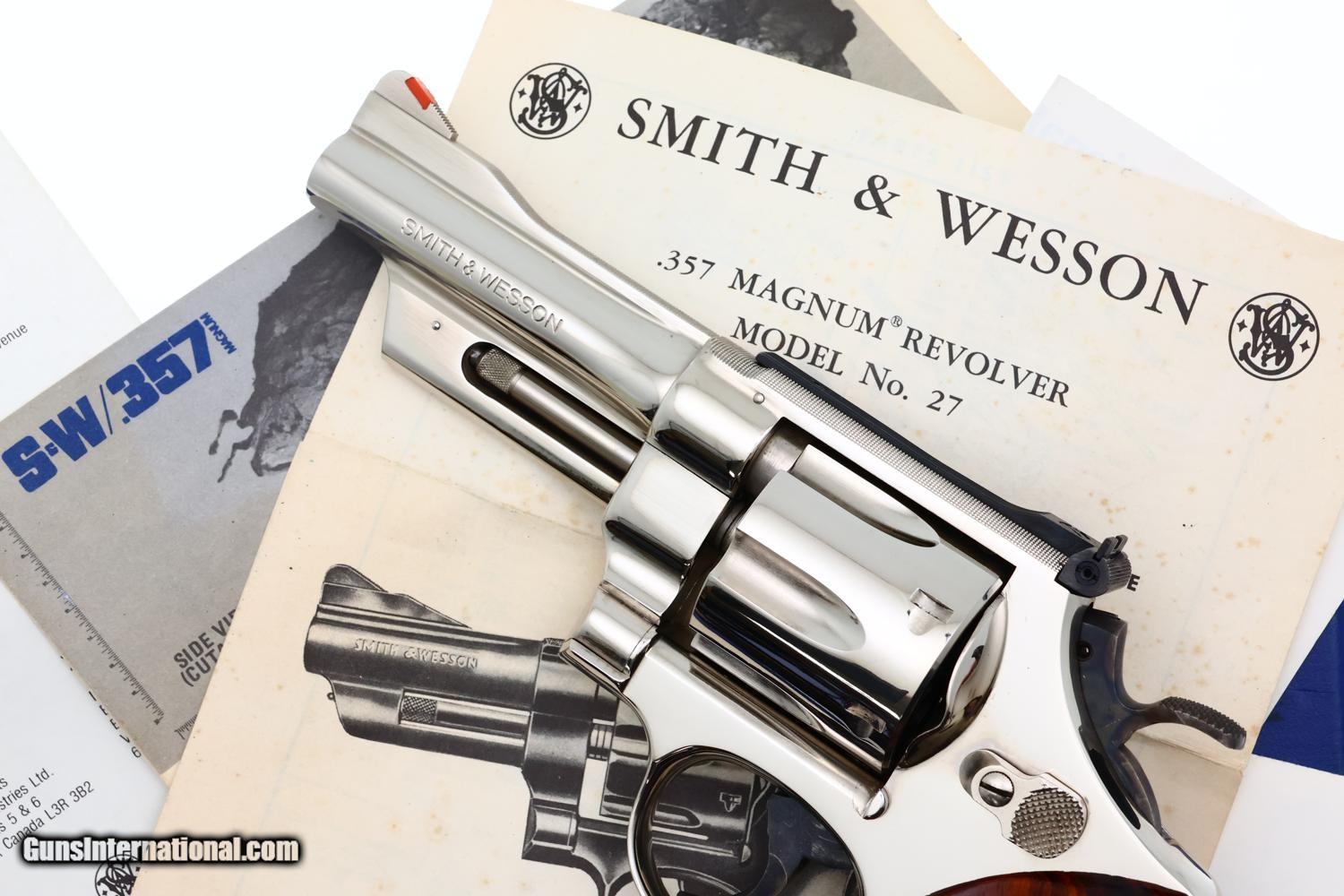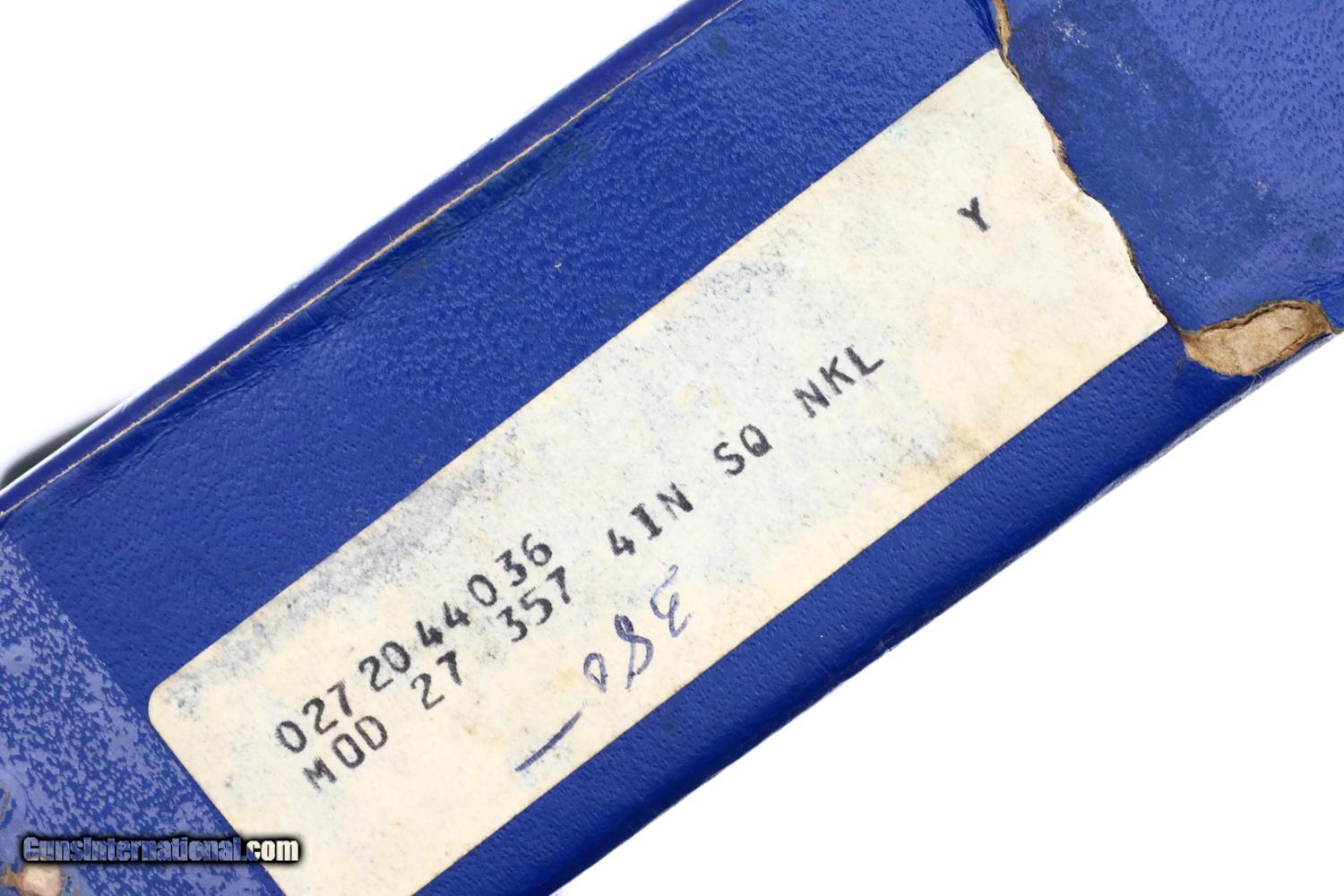 Standard configuration Smith & Wesson Model 27-2 .357 Magnum revolver, 4" barrel, factory nickel finish, SN: N831156, with red ramp front sight and white outline, fully adjustable rear sight. The left side of the barrel is marked "SMITH & WESSON" while the right side of the barrel bears "S.W. .357 MAGNUM". Circular S&W logo on the sideplate; 4-line address on forward frame. The frame under crane marked "N831156 / MOD 27-2", the crane "66275", with the frame under left grip marked with matching "66275" and "27 N". Fitted with color case hardened target hammer, target trigger, and Goncalo Alves target grips with football cutout and silver S&W medallions. Factory matching blue cardboard box with RIP, cleaning rod, bristle brush, swab, screwdriver, and literature to include instructions, warrantee card, etc.
