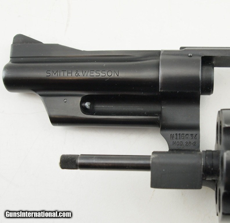 Description: S&W 28-2 .357 MAG, 4" bbl, bright shiny bore, good rifling, adjustable notch rear sight, serrated ramp front sight, blued finish, color case hardened serrated trigger - checkered hammer, and Pachmayr Gripper grips. Clean revolver. Great collecter or shooter! Add 3% for Credit Card Shipping $25.00 SOLD |