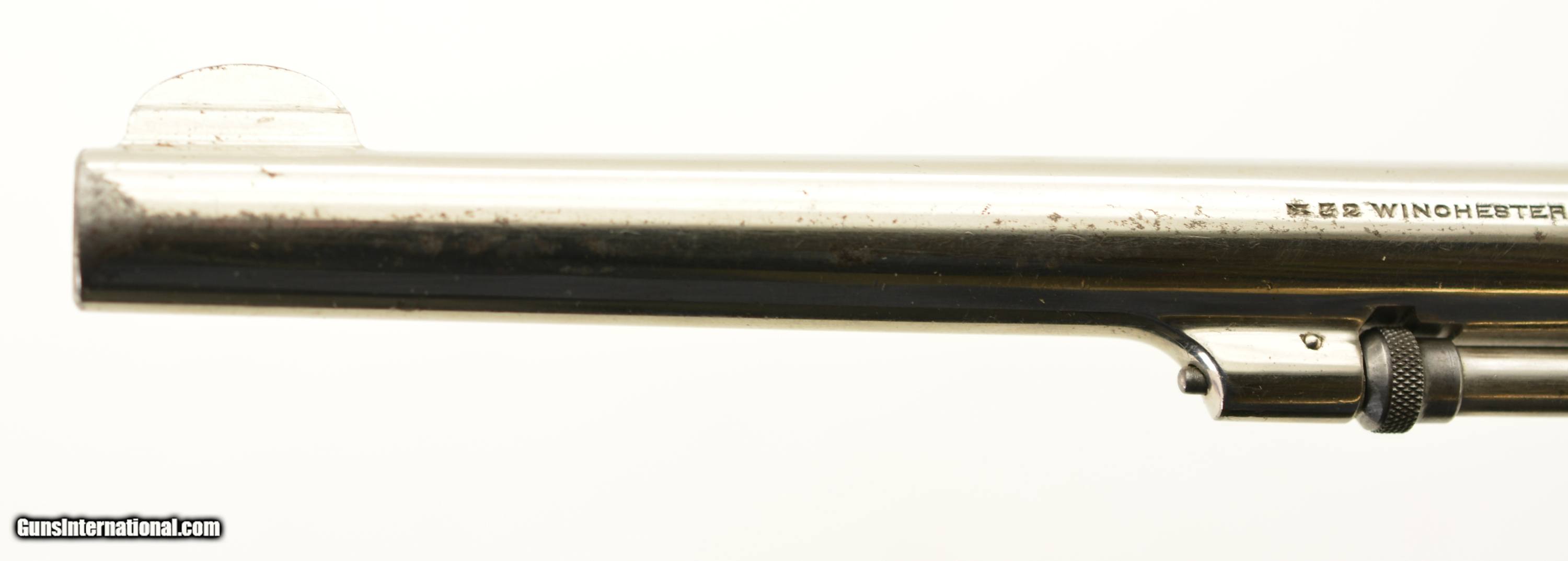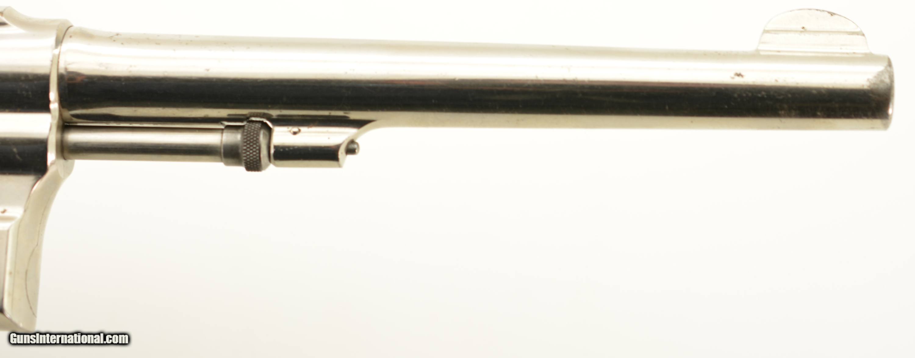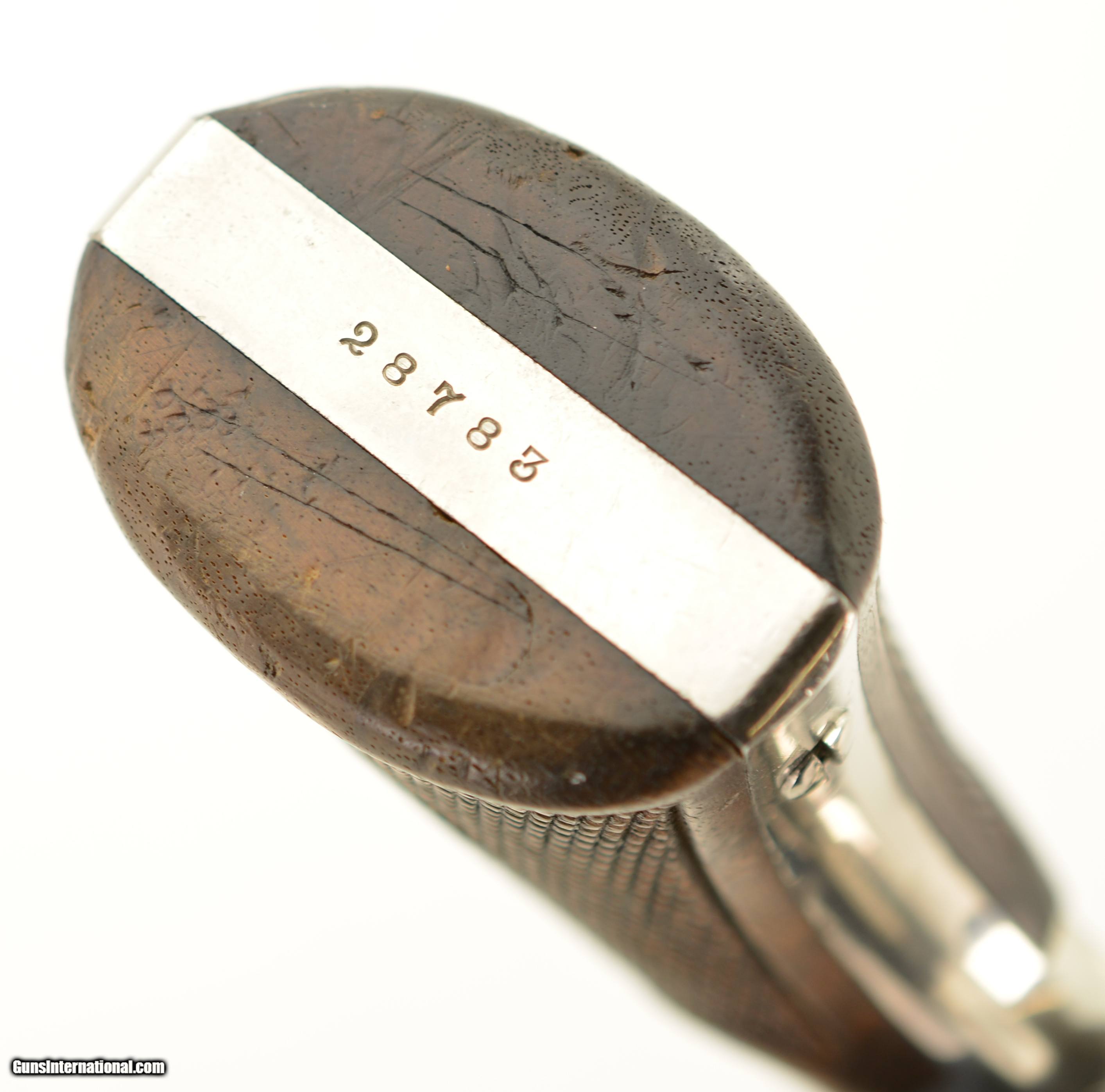 Description: Serial #28783, .32-20 (.32 WCF), 6 1/2" barrel with a fine, bright bore that has some very mild freckling within the grooves. This revolver has matching numbers on the frame, cylinder, barrel, extractor, and yoke, with the metal retaining 95-97% of the original nickel finish that has numerous small handling marks and blemishes scattered throughout, as well as some finish loss at the sides of the muzzle, where the underlying freckled gray metal is visible. The hammer and trigger retain most of their original color case-hardening with some dark spots of freckling along the sides of the spur and edges of the trigger. The checkered, walnut grips are in very good shape with minor handling marks at the butt, and some flattening of the points. The lock-up is still tight, and the action functions flawlessly. This is a very nice example of a desirable S&W .32-20 Hand Ejector, and is in very good-near fine condition. FFL or C&R SOLD Manufacturer: S&W Model: Hand Ejector Serial Number: 28783 Caliber Info: .32-20 Gauge Info: .32-20 |