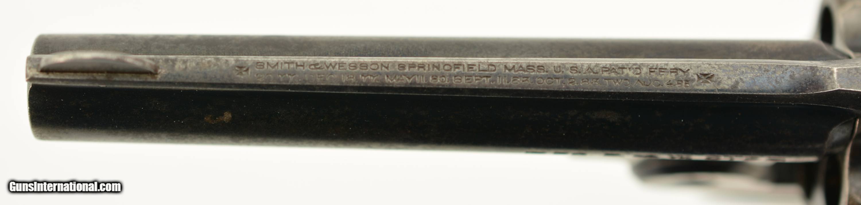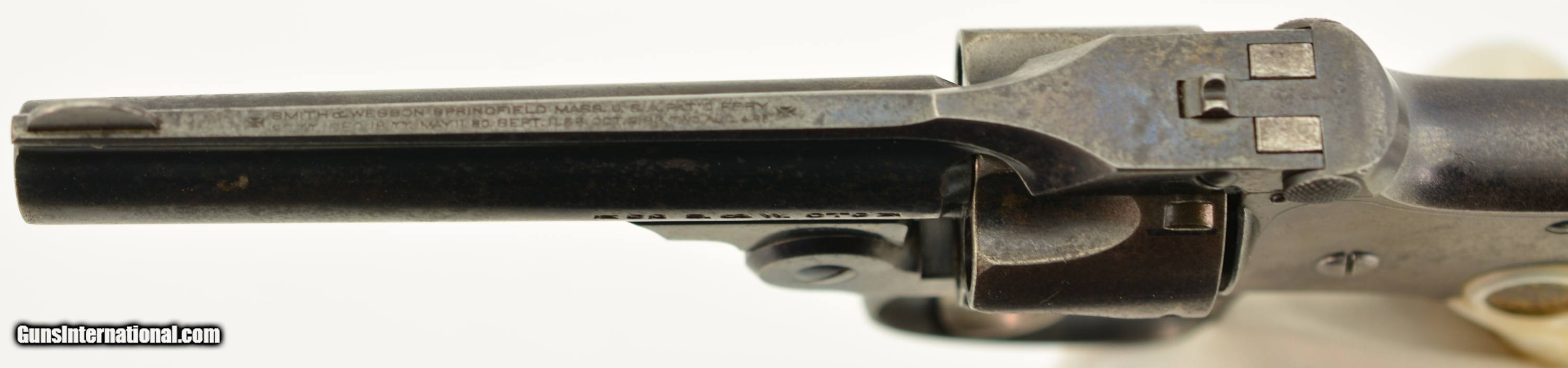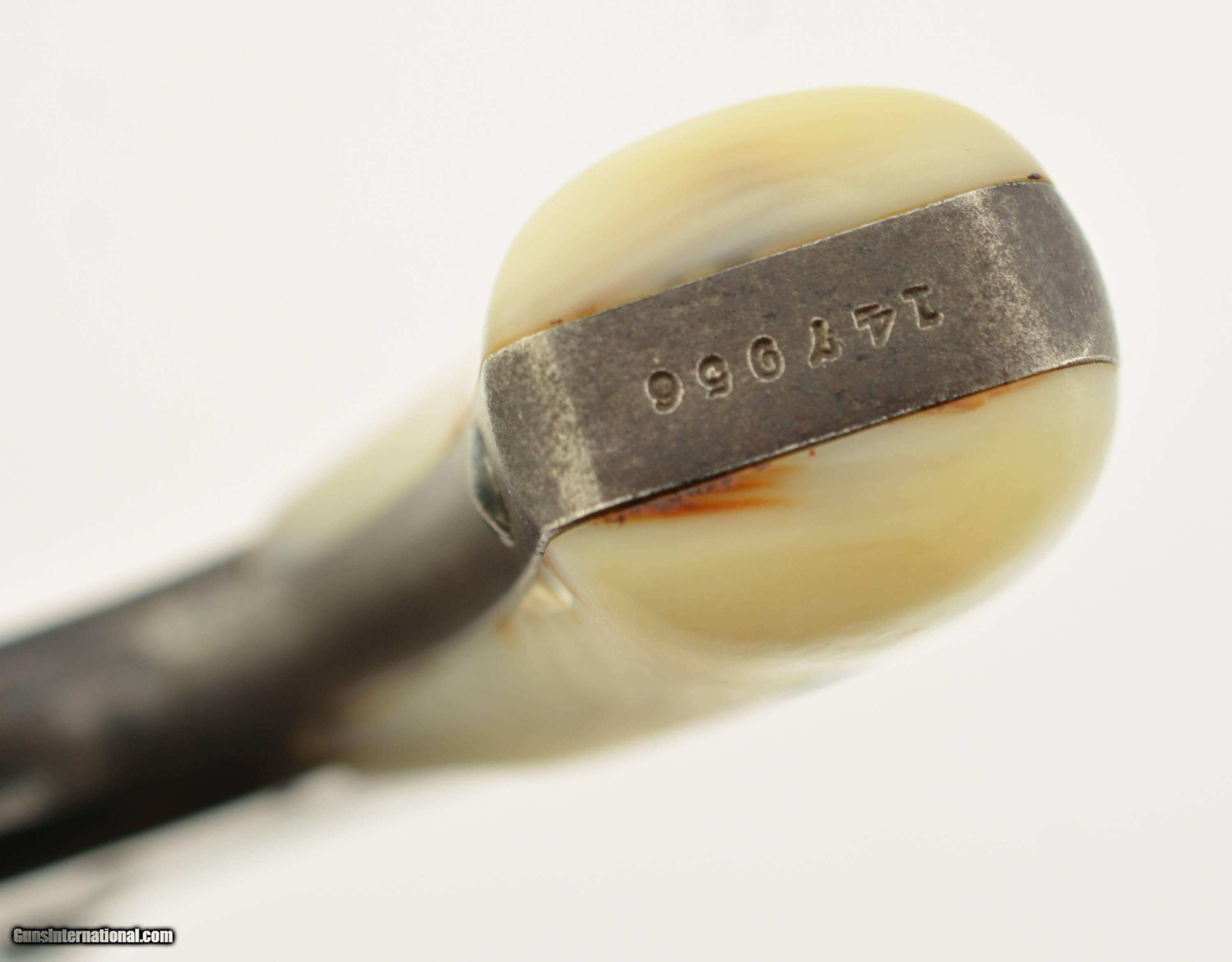 Description: Serial #147956, .32 S;W, 3 1/2" barrel with an excellent, bright bore. This is a handsome revolver that has matching numbers on the frame, barrel, cylinder, and latch, with the metal retaining 60-70% of the original blue finish with fading at the muzzle, along the high and exposed edges, as well as around the cylinder, which has a plum-brown and gray patina with blue remaining inside the flutes. The trigger has about 50% of the original color case-hardening remaining, with the balance turned to a freckled plum-brown. The S;W medallion mother-of-pearl grips are in fine-near excellent shape with some minor staining along the edges, and no cracks or chips. The lock-up is tight, and the action is fully functional. This is a very nice "Lemon-Squeezer", with great, period S;W grips, and rates fine condition overall. FFL or C;R SOLD |