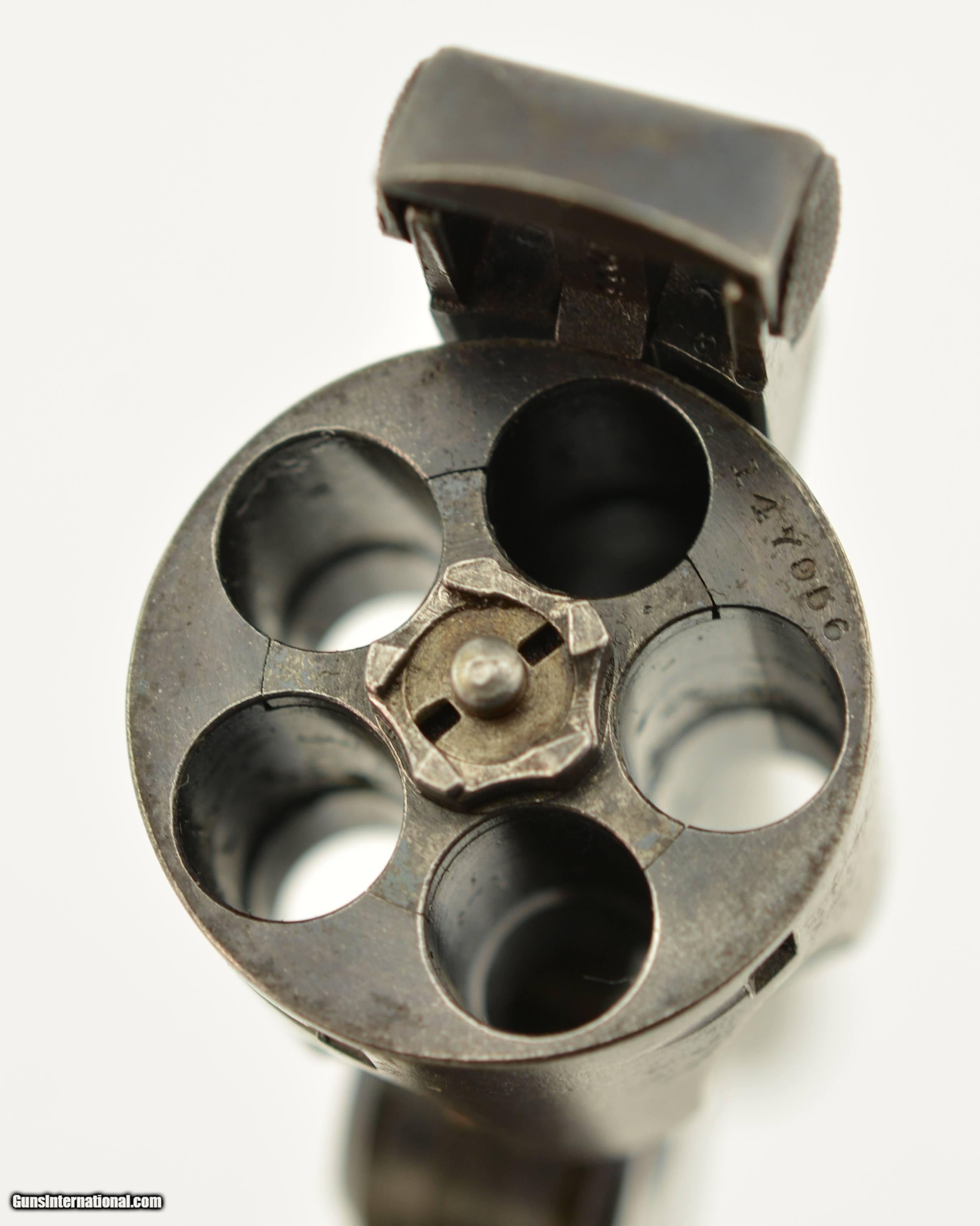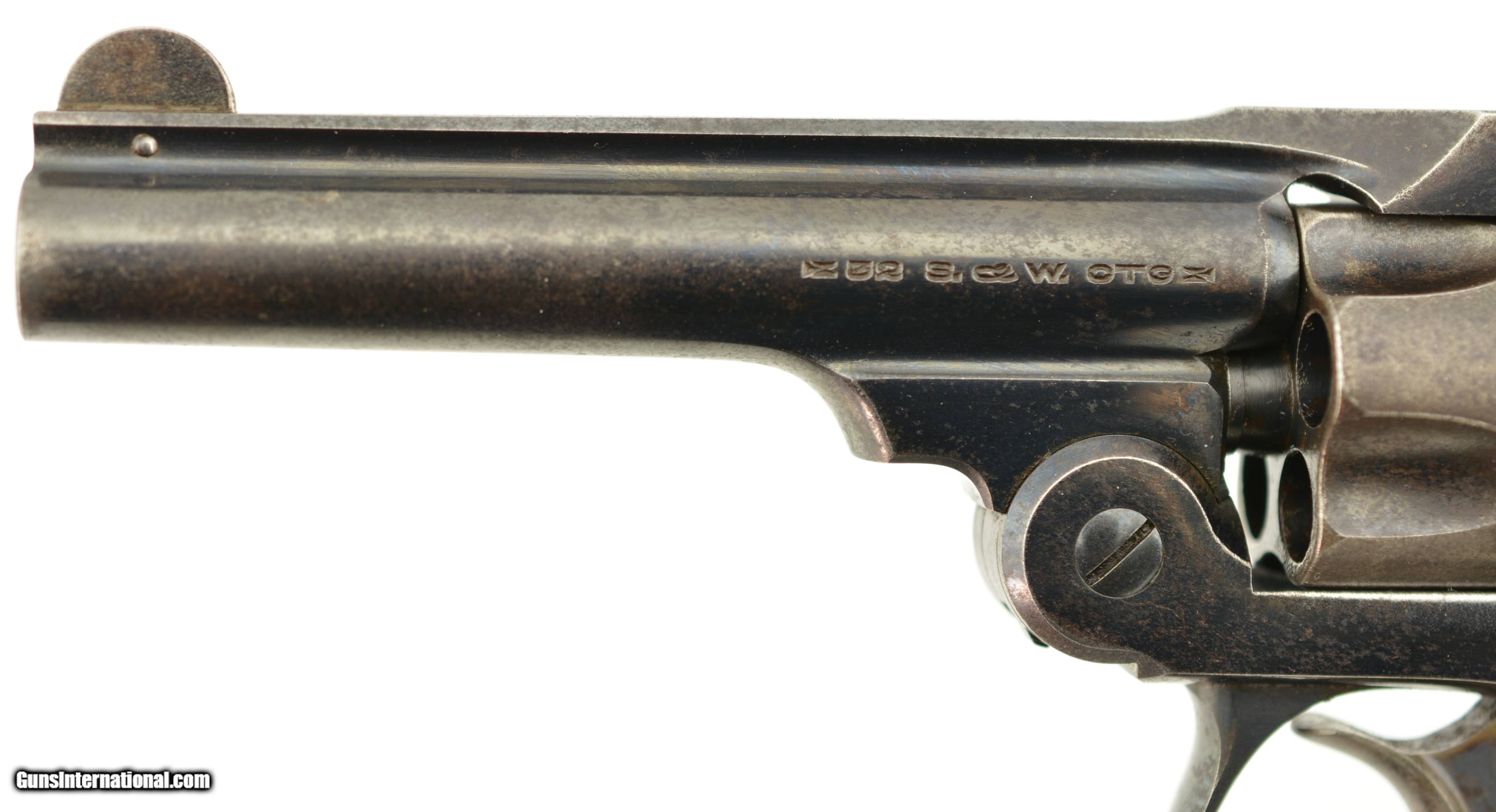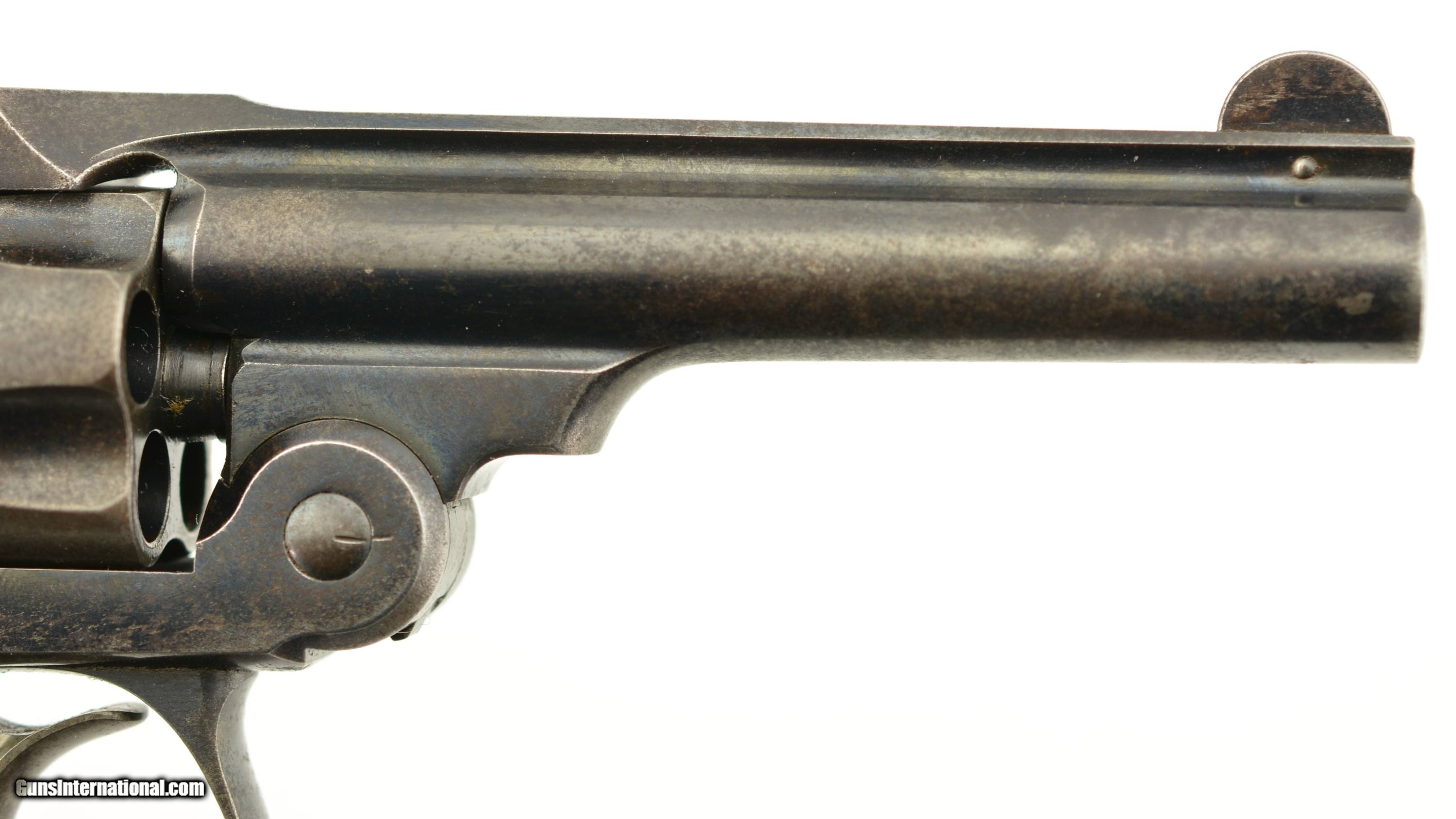 Description: Serial #147956, .32 S;W, 3 1/2" barrel with an excellent, bright bore. This is a handsome revolver that has matching numbers on the frame, barrel, cylinder, and latch, with the metal retaining 60-70% of the original blue finish with fading at the muzzle, along the high and exposed edges, as well as around the cylinder, which has a plum-brown and gray patina with blue remaining inside the flutes. The trigger has about 50% of the original color case-hardening remaining, with the balance turned to a freckled plum-brown. The S;W medallion mother-of-pearl grips are in fine-near excellent shape with some minor staining along the edges, and no cracks or chips. The lock-up is tight, and the action is fully functional. This is a very nice "Lemon-Squeezer", with great, period S;W grips, and rates fine condition overall. FFL or C;R SOLD |