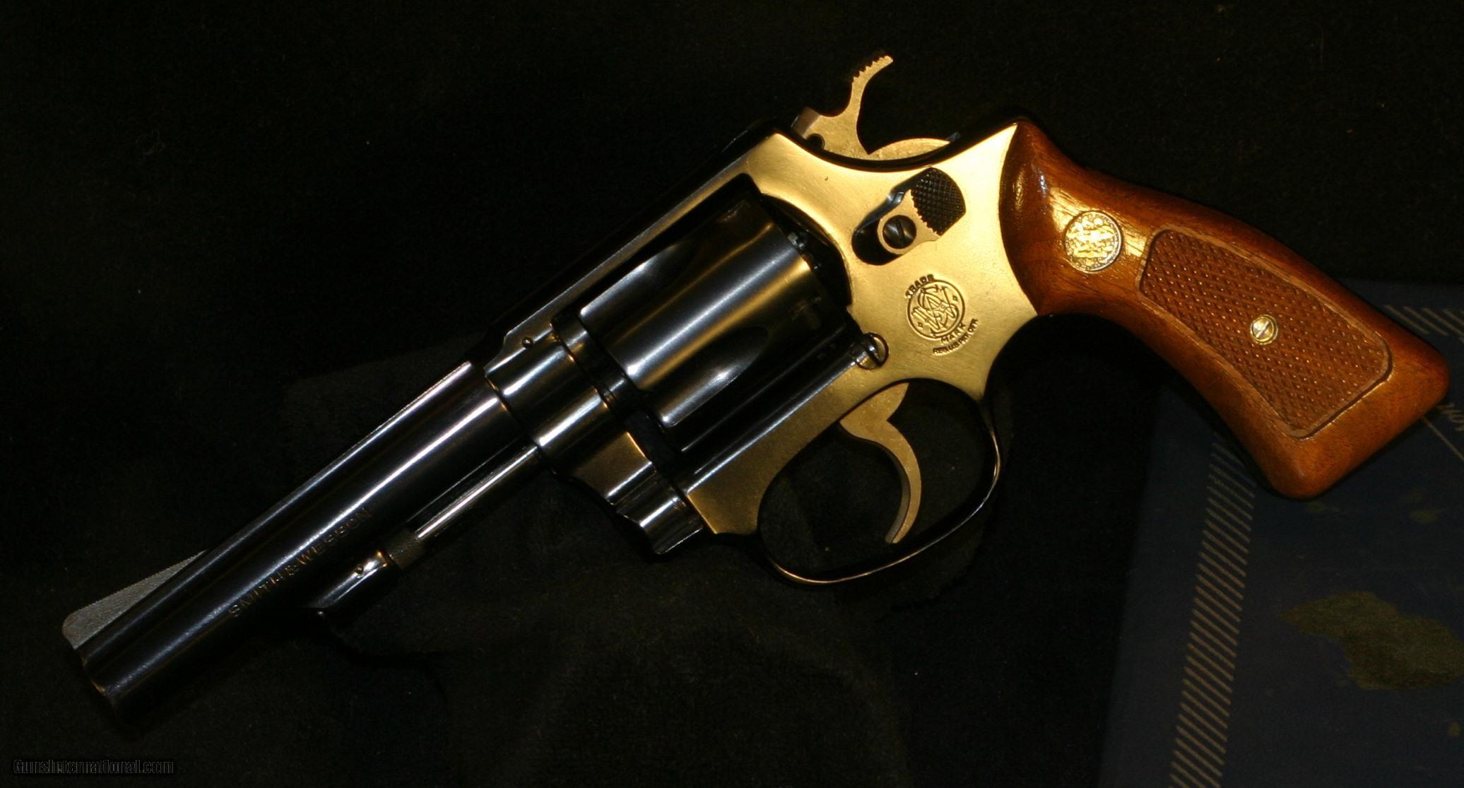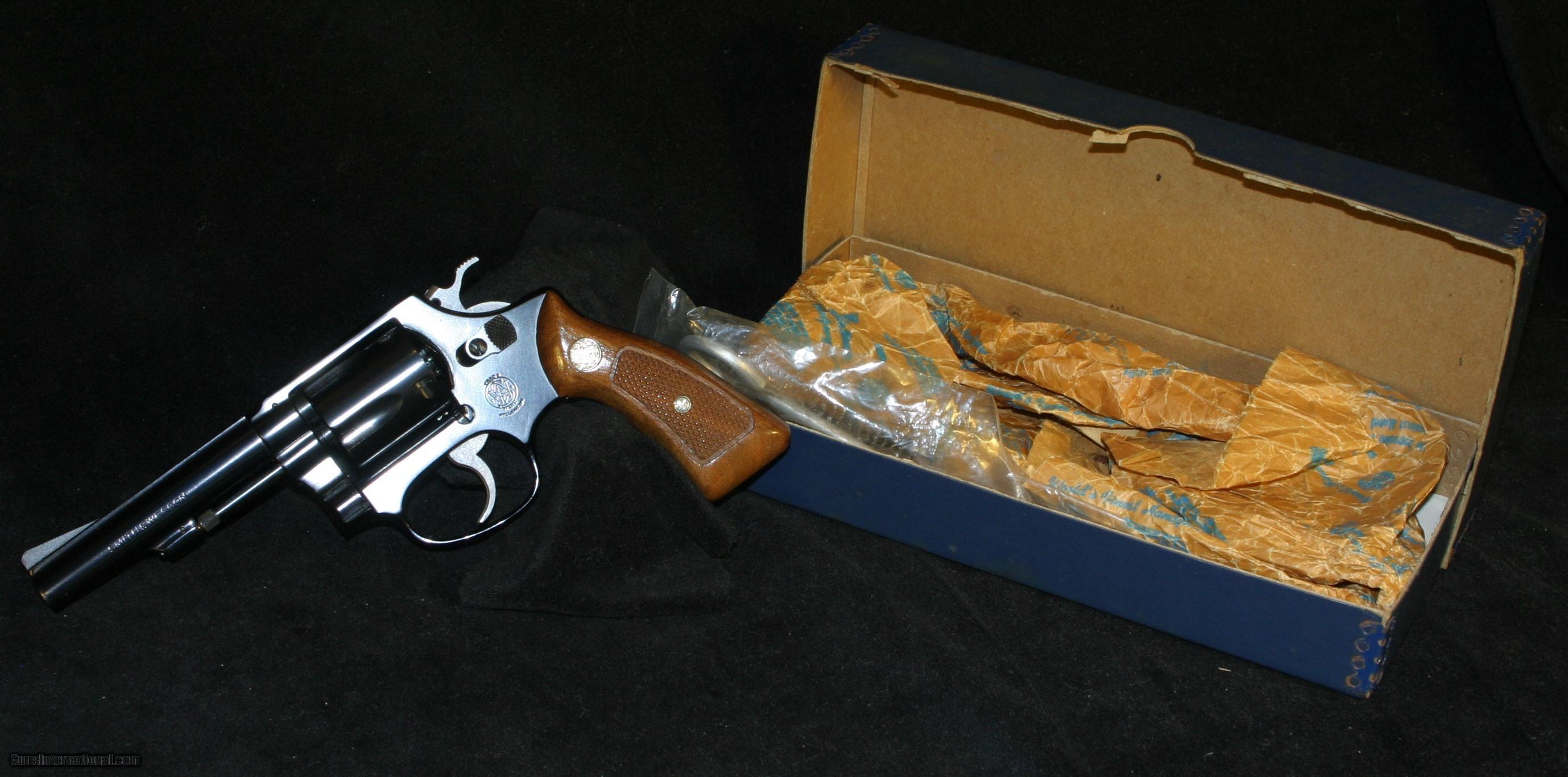 Description: This is a nice one! In the blue box, a 4" M33 in .38 S&W, not .38 Special. Excellent condition. Hard to find, a "must have" to complete a collection of J frames.This was built in 1971 SOLD |