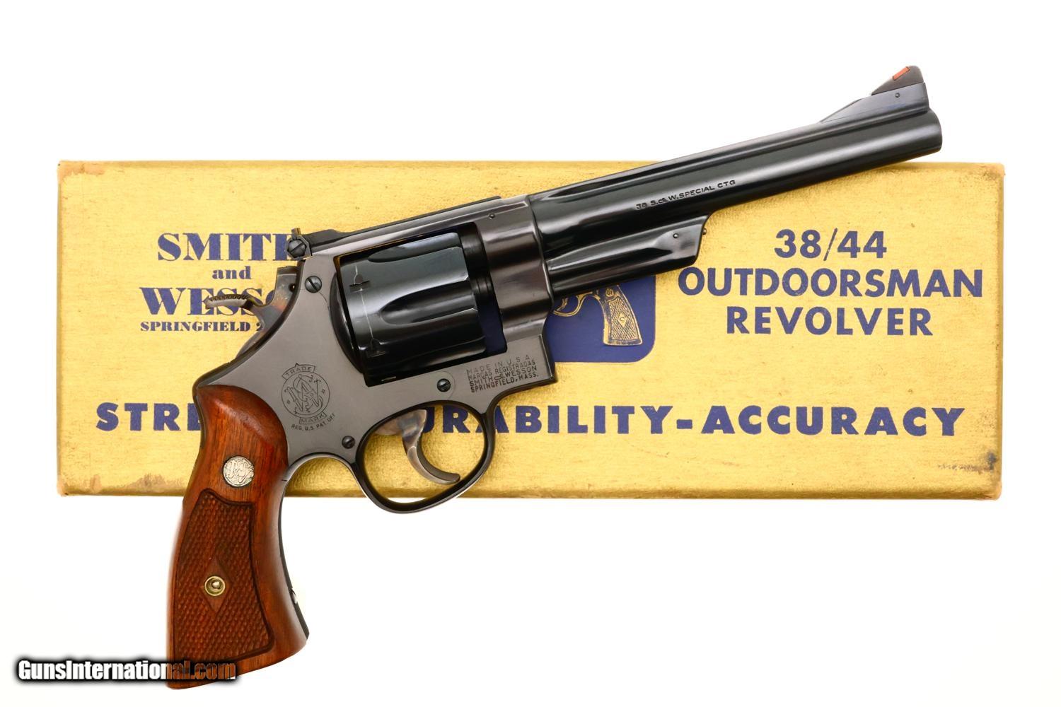 Magnificent Smith & Wesson S&W .38/44 Outdoorsman revolver, .38 Special, 6.5? barrel in blue/gold box.