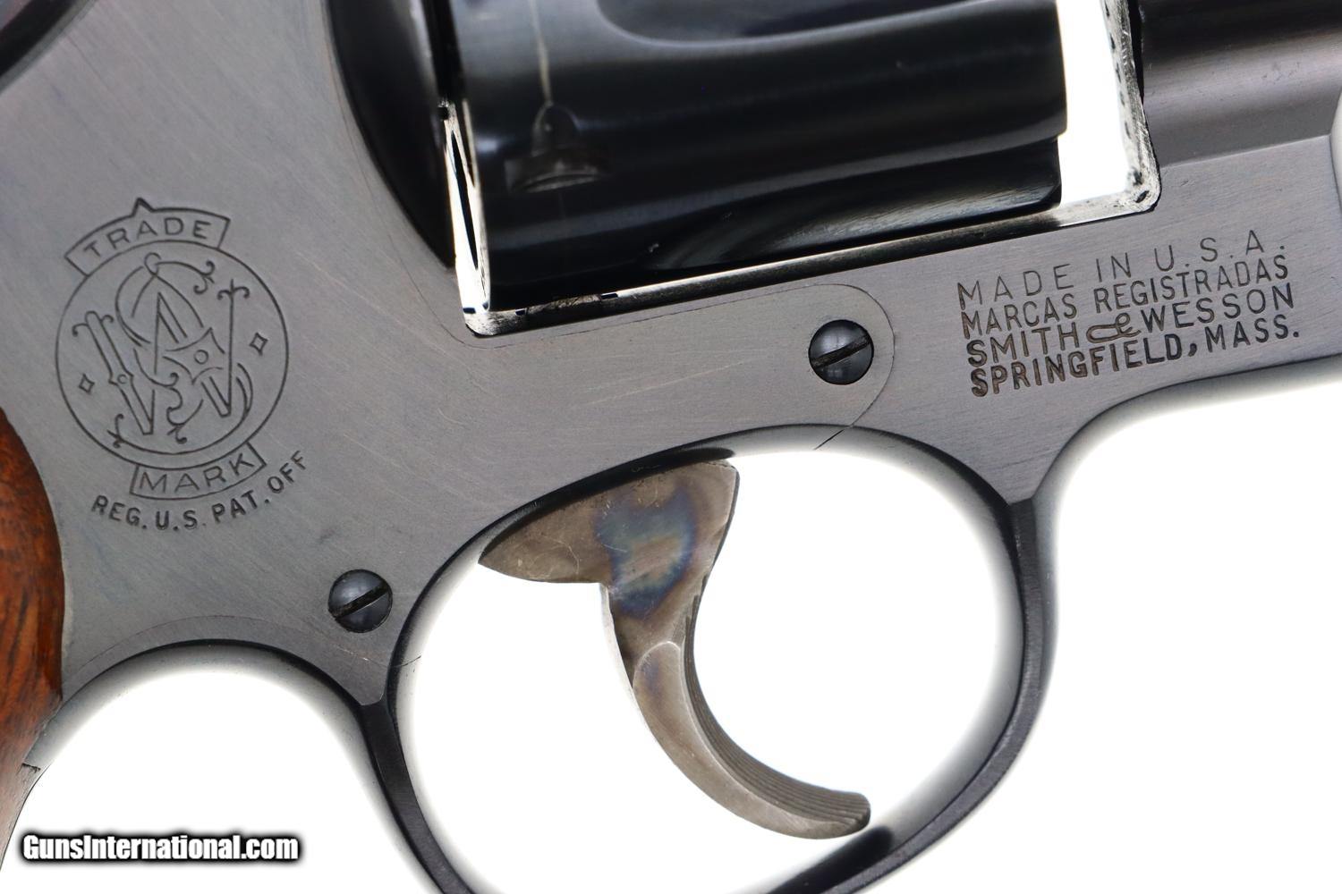 EXC+, near new, original factory finish, no sharp edge wear, cylinder ring that breaks the blue. No cartridge head markings on recoil shield. Mirror bore. Perfect manual mechanics. VG-EXC blue/gold shipping box. A great N frame S&W 5-screw 38/44 Outdoorsman revolver with correct factory box from 1953!