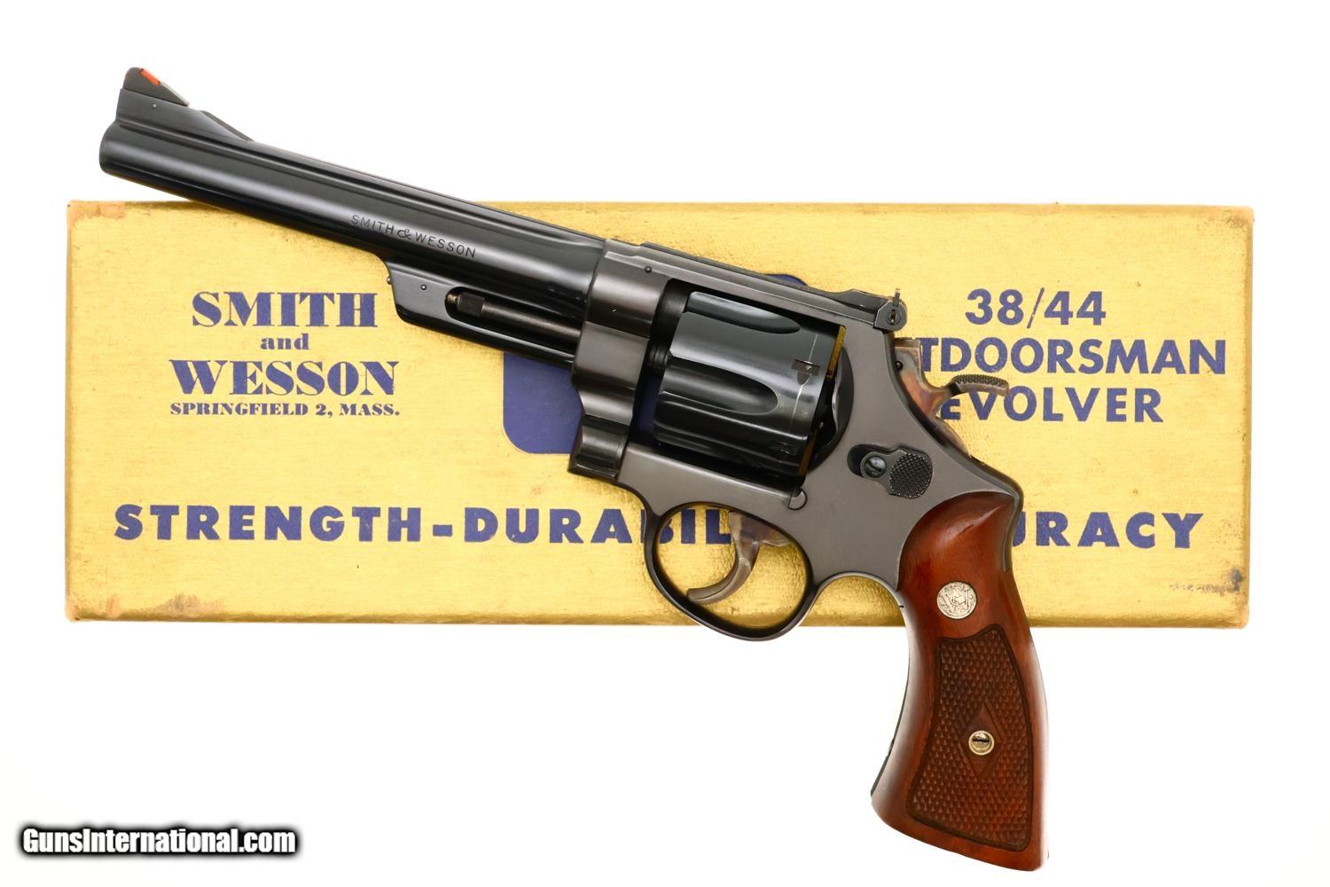 A beautiful original finish S&W 38-44 Outdoorsman revolver, 5-screw, .38 S&W Special, with 6.5” barrel, adjustable white highlight rear sight, red ramp front sight, target trigger and hammer. Revolver is unusual in having full serial number on barrel lug, rear of cylinder, and butt with matching assembly number on frame and crane. Standard grips. Complete with correct Blue/Gold shipping box, referencing finish and barrel length. No instruction literature or cleaning implements.