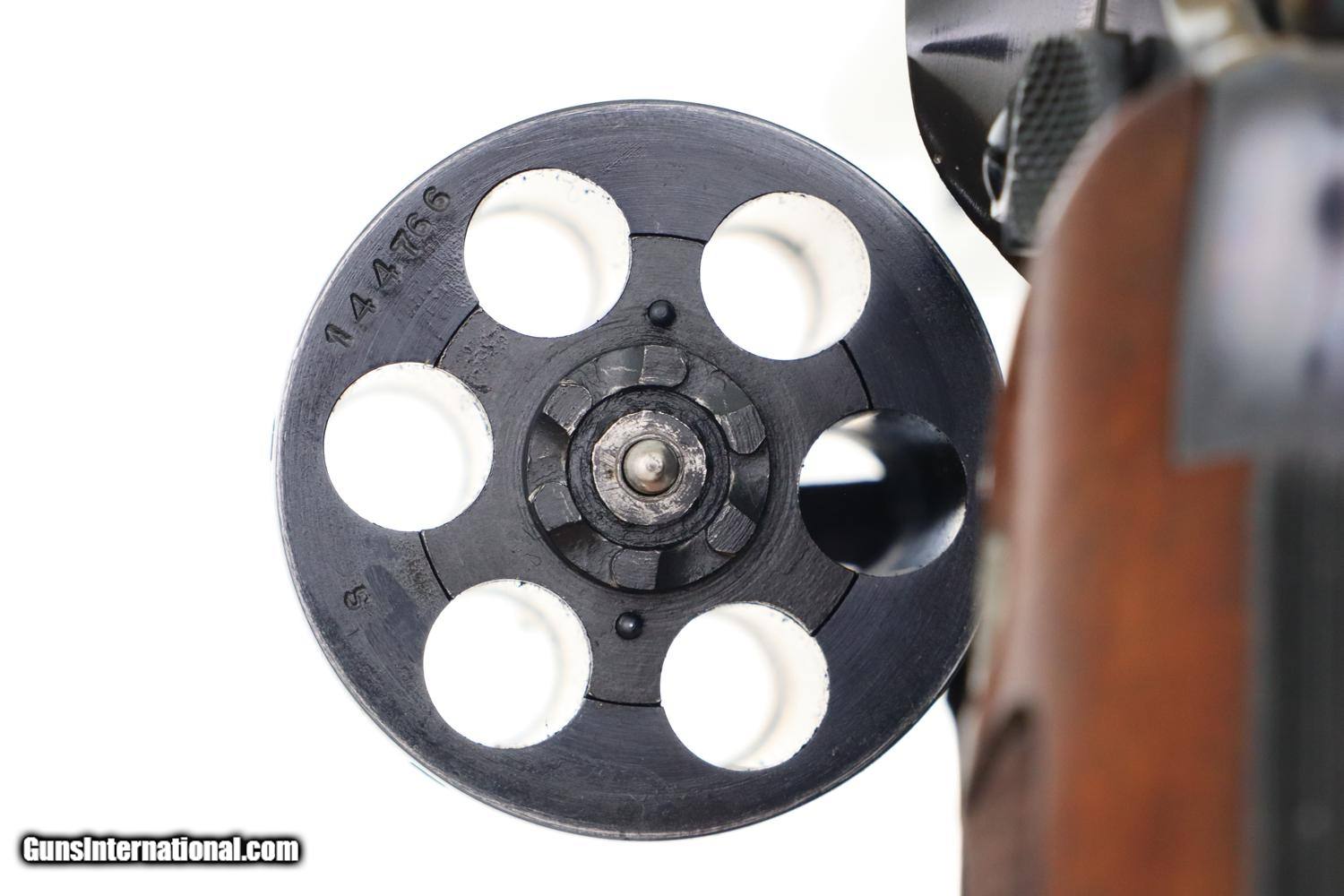 Description: Synopsis: Magnificent Smith & Wesson S&W .38/44 Outdoorsman revolver, .38 Special, 6.5? barrel in blue/gold box. Description: A beautiful original finish S&W 38-44 Outdoorsman revolver, 5-screw, .38 S&W Special, with 6.5” barrel, adjustable white highlight rear sight, red ramp front sight, target trigger and hammer. Revolver is unusual in having full serial number on barrel lug, rear of cylinder, and butt with matching assembly number on frame and crane. Standard grips. Complete with correct Blue/Gold shipping box, referencing finish and barrel length. No instruction literature or cleaning implements. Condition: EXC+, near new, original factory finish, no sharp edge wear, cylinder ring that breaks the blue. No cartridge head markings on recoil shield. Mirror bore. Perfect manual mechanics. VG-EXC blue/gold shipping box. A great N frame S&W 5-screw 38/44 Outdoorsman revolver with correct factory box from 1953! SOLD Manufacturer: S&W Model: 38-44, Outdoorsman Serial Number: S144766 Caliber Info: 38 S&W Condition: Near NIB |