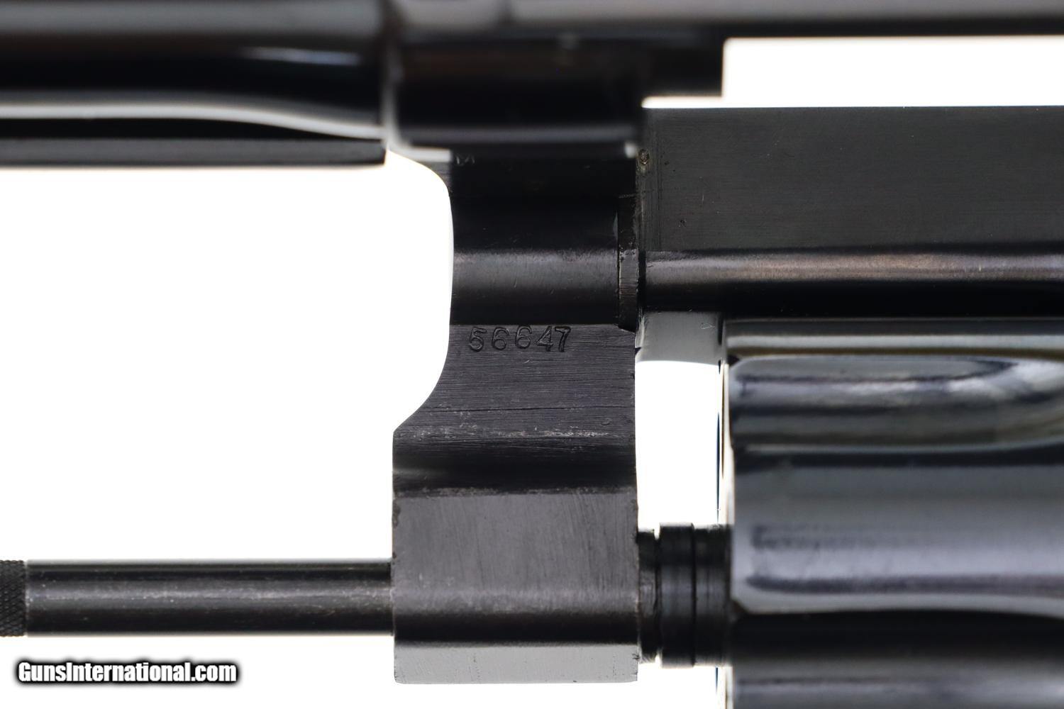 EXC+, near new, original factory finish, no sharp edge wear, cylinder ring that breaks the blue. No cartridge head markings on recoil shield. Mirror bore. Perfect manual mechanics. VG-EXC blue/gold shipping box. A great N frame S&W 5-screw 38/44 Outdoorsman revolver with correct factory box from 1953!