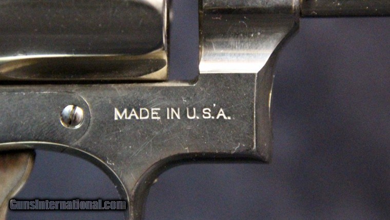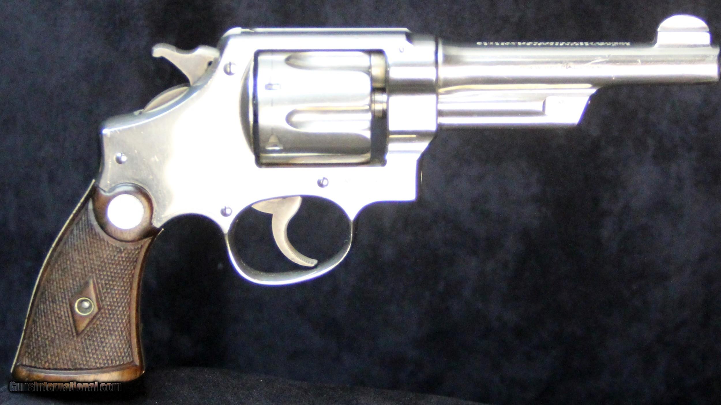 Description: .44 S&W Special, #34524, 5 inch barrel, nickel finish, 2 piece walnut grips, letters to Wolf & Klar, circa 1930. Condition: strong bright bore, 98% nickel overall, case color on hammer and trigger has faded, number on grips does not match serial number but are excellent and fit well, excellent mechanically, excellent marks. SOLD Curio/Relic: Yes |