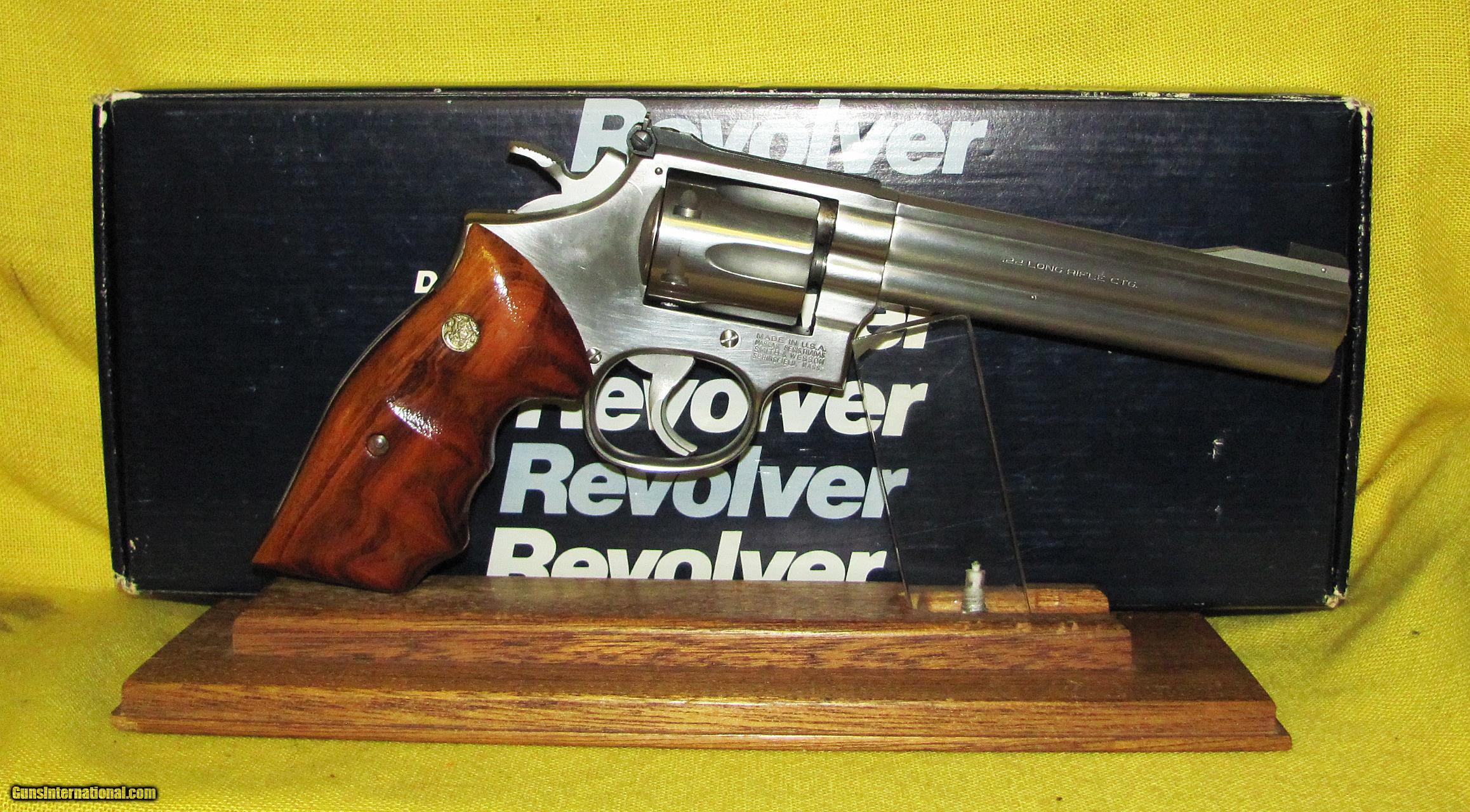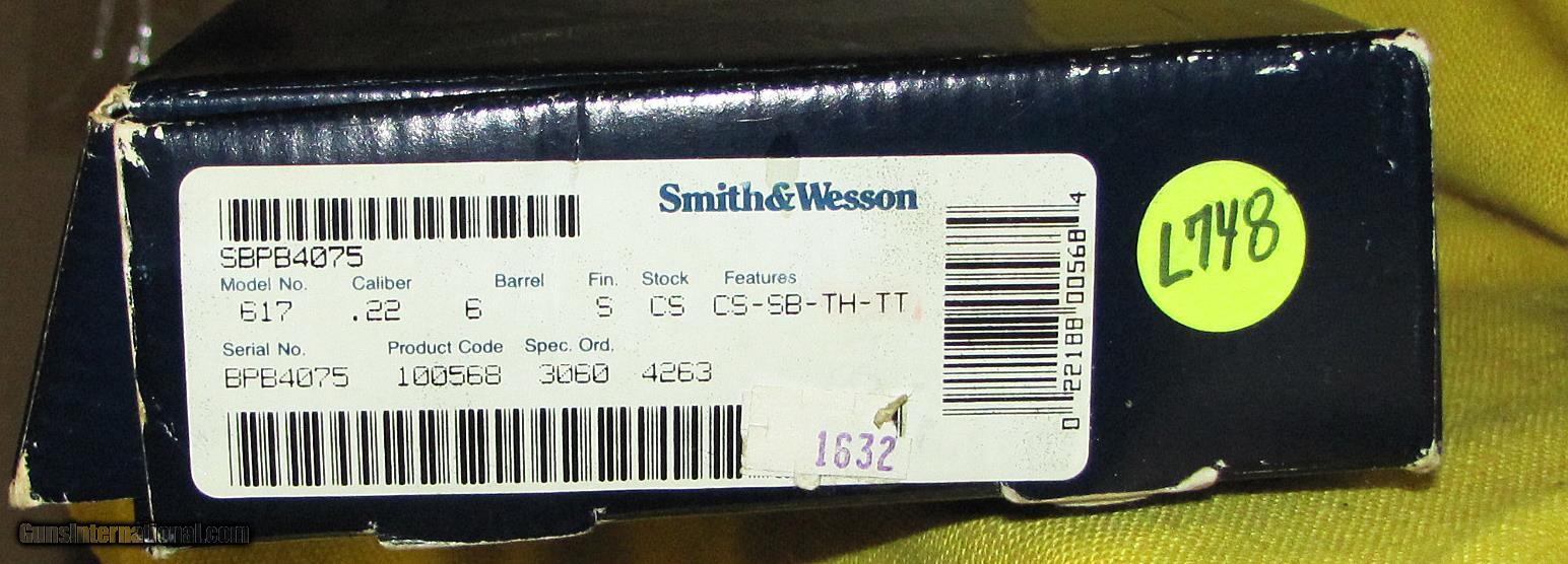 Description: S&W 617 (6 SHOT) IN .22 L.R. CAL., WITH 6" BARREL. COLOR STAINLESS STEEL. CONDITION 98% LIKE NEW. SERIAL NUMBER BPB4075. S&W MODEL 617 (6 SHOT), MIRROR BORE, COMES WITH TARGET TRIGGER, TARGET HAMMER, AND FINGER GROOVE S&W TARGET GRIPS, ADJUSTABLE BLACK REAR SIGHT, FACTORY BOX AND MANUAL SERIAL NUMBERED TWO THE FIREARM, 98%+ FACTORY FINISH. OUR NEW STOCK # D31018. SOLD |