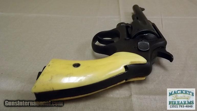 Description: Smith and Wesson model M&P 1905 blued revolver. Chambers .38 S&W special caliber cartridges from a swing-out, fluted, 6-shot cylinder. The barrel length is 5 inches with an excellent bore. Fixed sights. Narrow, spurred hammer and a grooved trigger. White grip plates that have turned yellow with a lot of wear. Lanyard ring attached. Finish is rated at ~20% with some pitting and very little blue finish. Serial number on frame does not match cylinder or butt. Stamped "UNITED STATES PROPERTY" on top of frame. No box. SN: 912### FFL dealer required for shipment. We do not ship outside the United States. SOLD |