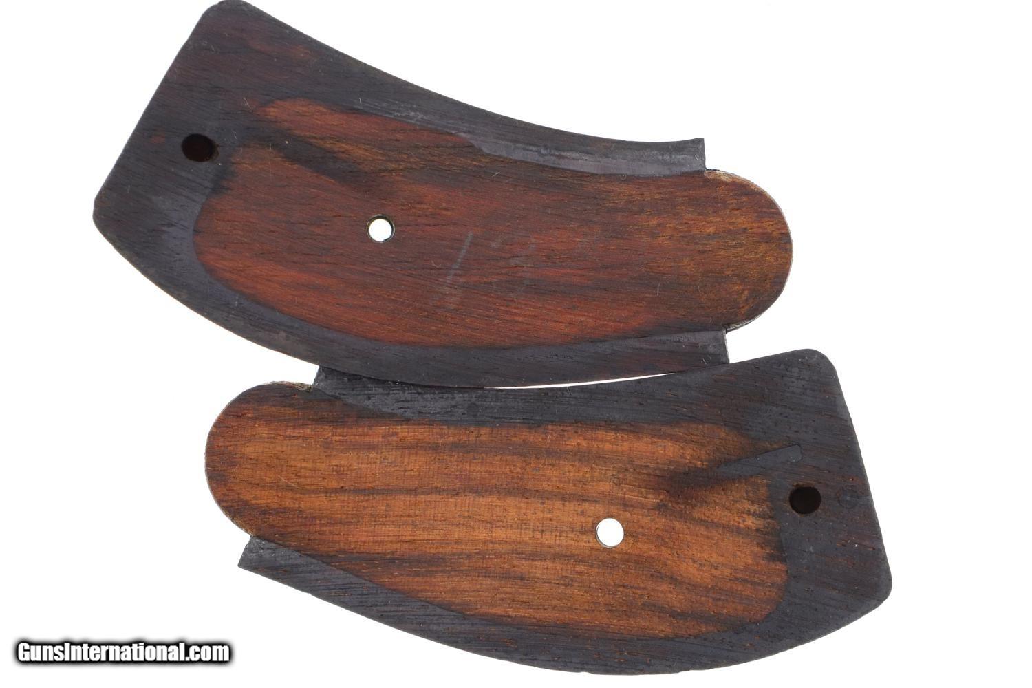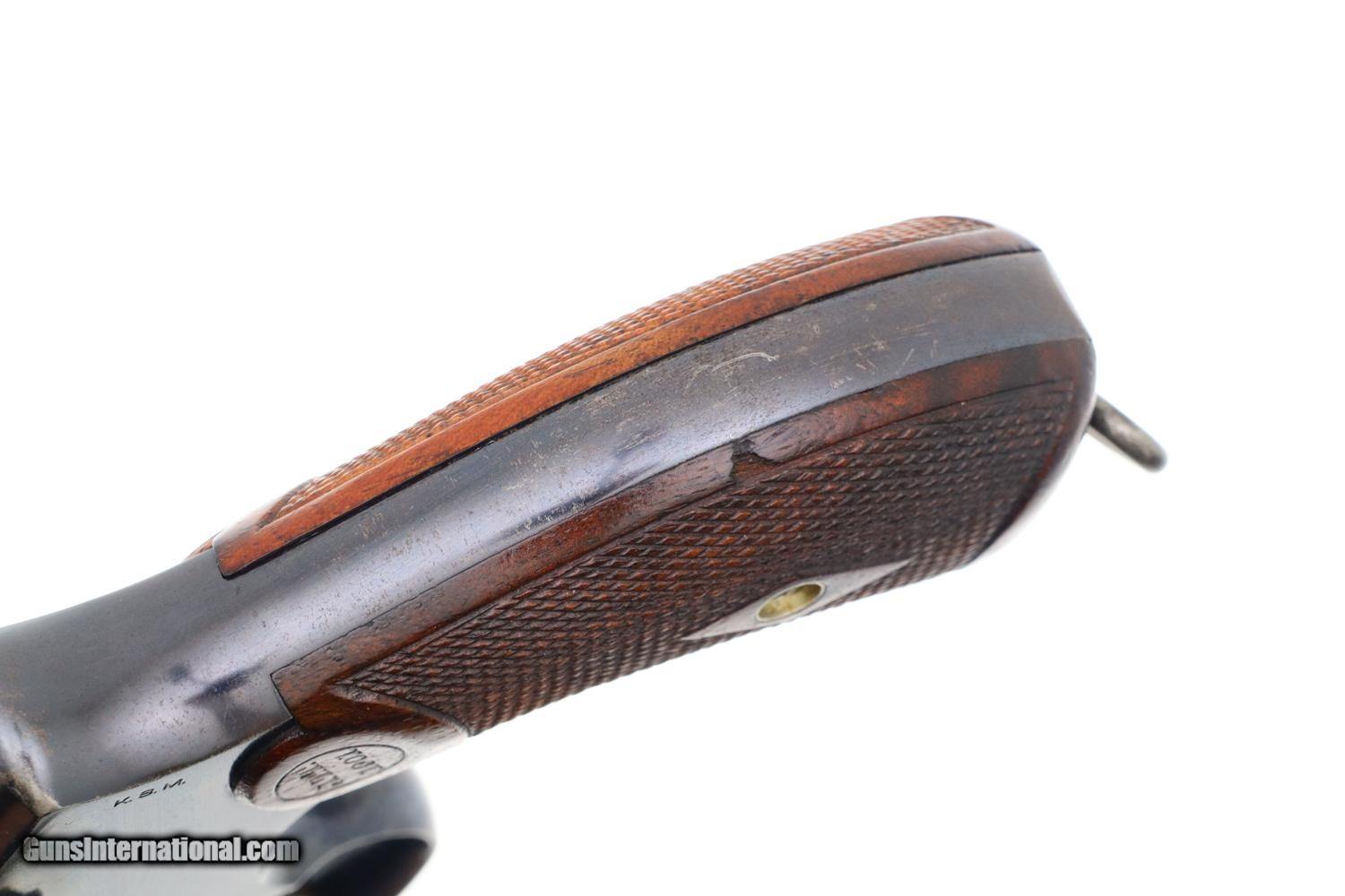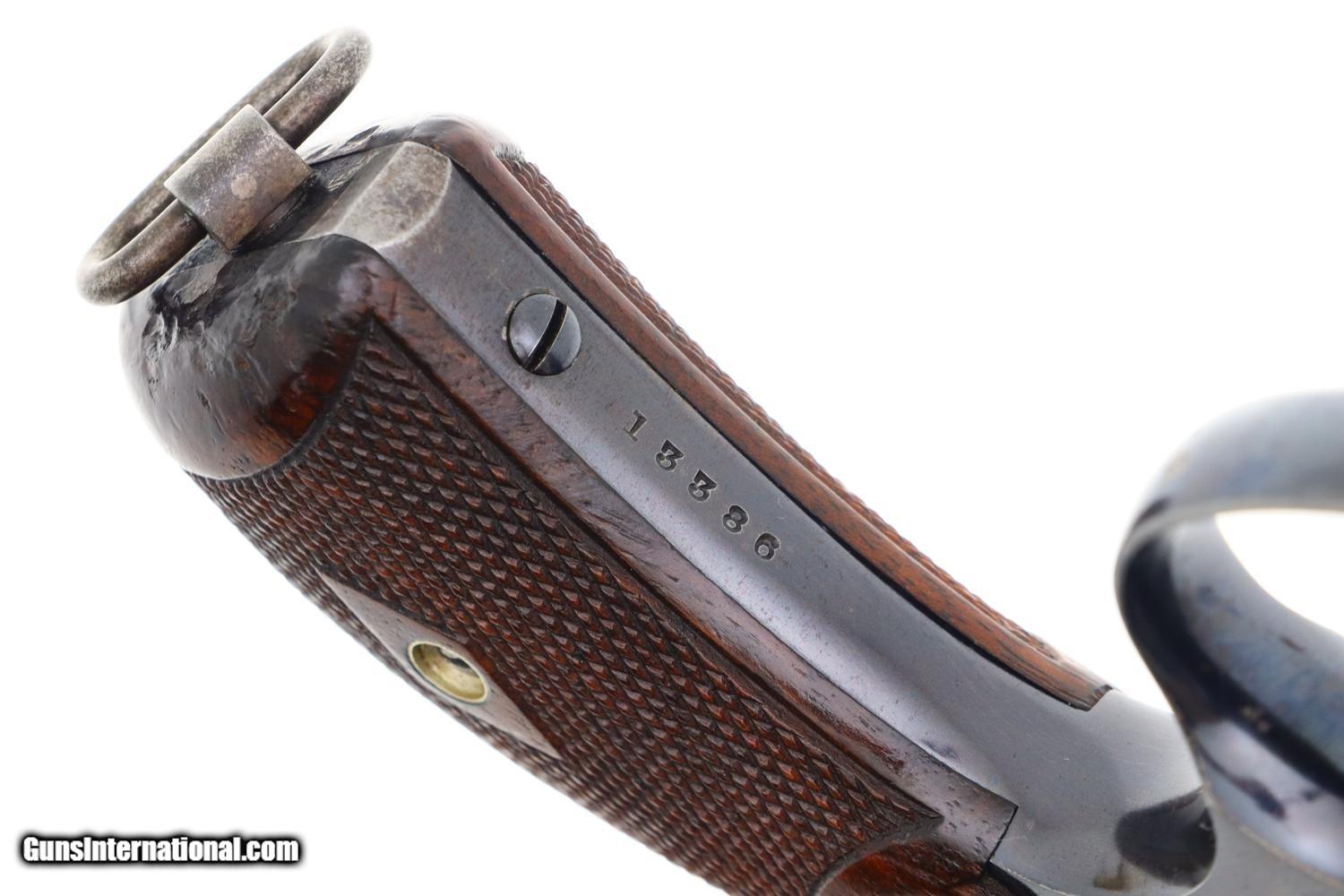 G/VG high luster original blue with spotting and wear consistent with a revolver that was in use prior to and during WWI. Comparable fading of the color case hardened parts. Grips with mild oil staining, the left panel missing a small border chip along backstrap, both panels with scattered impressions at butt near lanyard ring. Mirror bright bore. Perfect manual mechanics, each cylinder indexing properly against mild resistance. Most of the wear due to carry/handling rather than use as recoil shield shows only the very faintest cartridge head imprints.