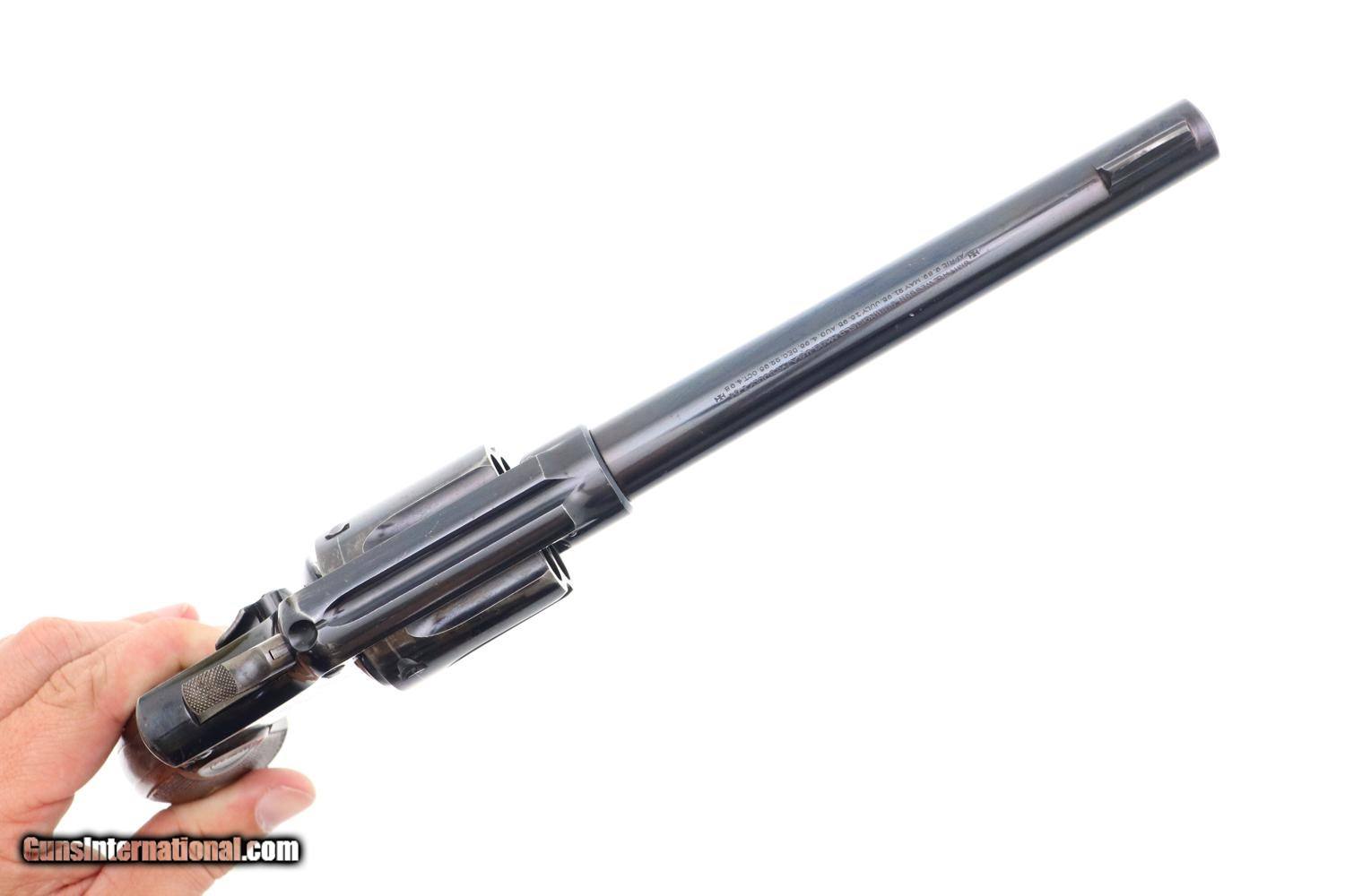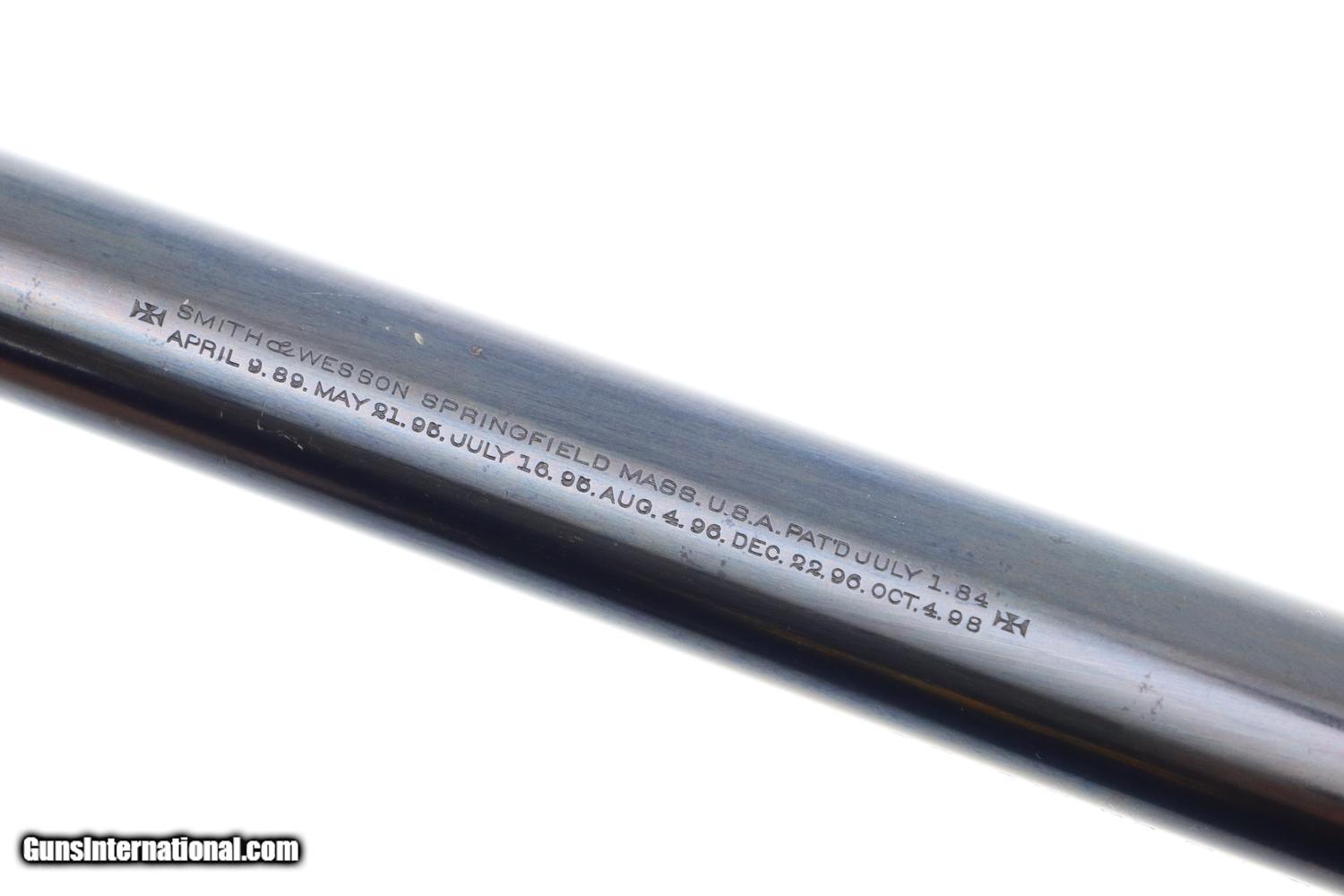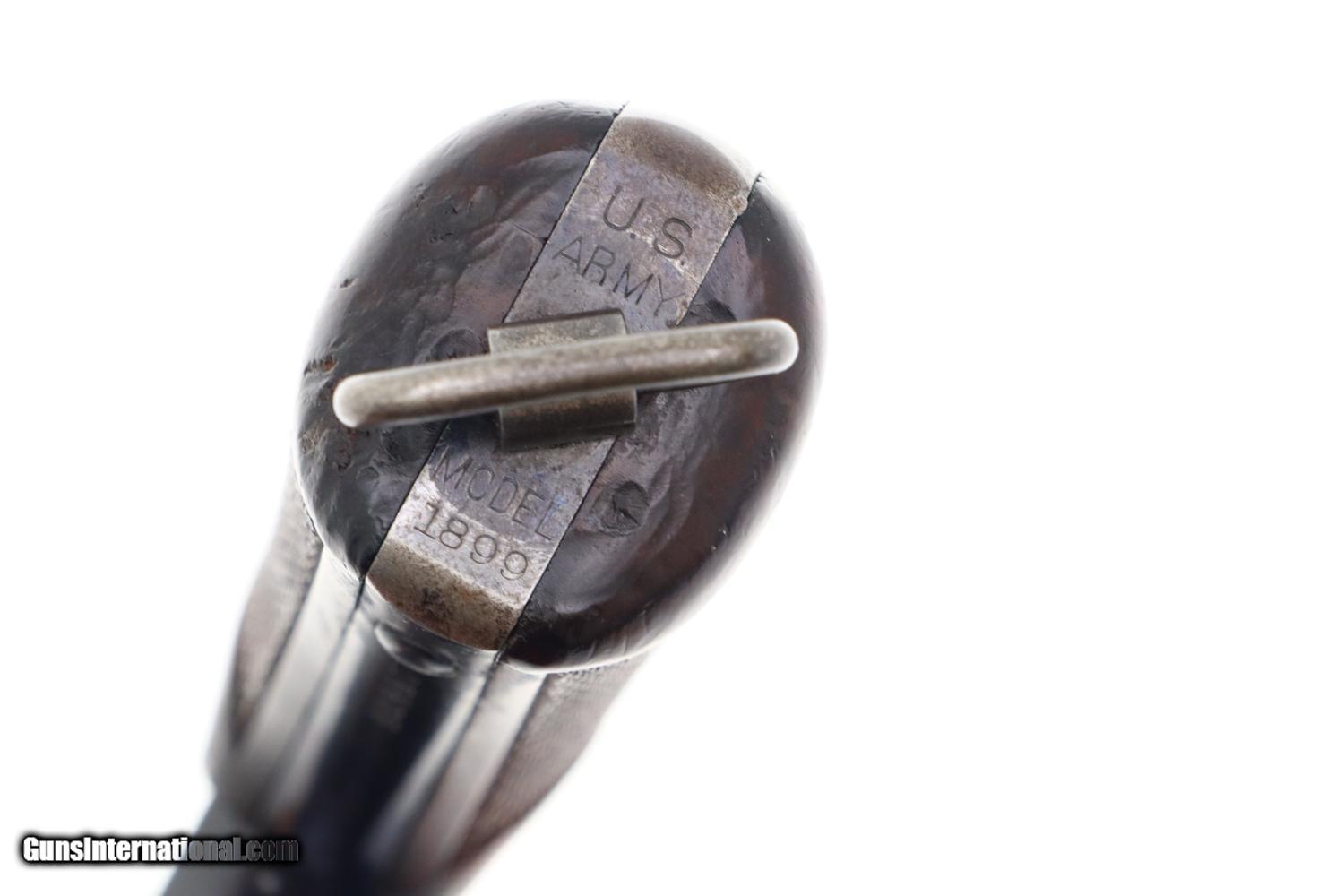 Description: Synopsis: Scarce, original, and all-matching S&W Model 1899 U.S. Army Revolver, this example having been made in 1901. Description: Standard configuration S&W Model 1899 U.S. Army revolver (cal: .38 Special), this example having a 6” barrel, halfmoon blade front sight, and grooved rear sight. Left side of the barrel marked “S.& W. 38 MIL”. Top of the barrel having the standard two line S&W address. Sideplate having the usual S&W logo. Matching serial numbers on frontstrap, cylinder, under grips and under barrel. The left side of frame is inspector marked (KSM), as is the barrel, and cylinder. Color-case-hardened trigger and hammer. Butt marked "U.S. Army Model 1899". Fitted with walnut checkered grips marked “ J.T.T / 1901” (left) and “K.S.M” (right) diamonds around the screw. Condition: G/VG high luster original blue with spotting and wear consistent with a revolver that was in use prior to and during WWI. Comparable fading of the color case hardened parts. Grips with mild oil staining, the left panel missing a small border chip along backstrap, both panels with scattered impressions at butt near lanyard ring. Mirror bright bore. Perfect manual mechanics, each cylinder indexing properly against mild resistance. Most of the wear due to carry/handling rather than use as recoil shield shows only the very faintest cartridge head imprints. SOLD Manufacturer: S&W Model: 1899 Serial Number: 13386 Caliber Info: .38 S&W Special Condition: G/VG |