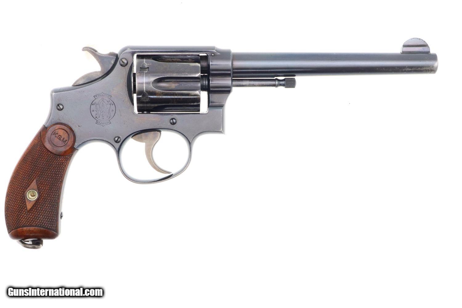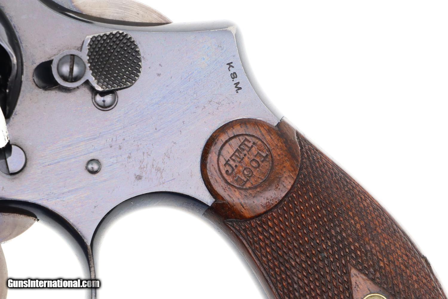Standard configuration S&W Model 1899 U.S. Army revolver (cal: .38 Special), this example having a 6” barrel, halfmoon blade front sight, and grooved rear sight. Left side of the barrel marked “S.& W. 38 MIL”. Top of the barrel having the standard two line S&W address. Sideplate having the usual S&W logo. Matching serial numbers on frontstrap, cylinder, under grips and under barrel. The left side of frame is inspector marked (KSM), as is the barrel, and cylinder. Color-case-hardened trigger and hammer. Butt marked "U.S. Army Model 1899". Fitted with walnut checkered grips marked “ J.T.T / 1901” (left) and “K.S.M” (right) diamonds around the screw.