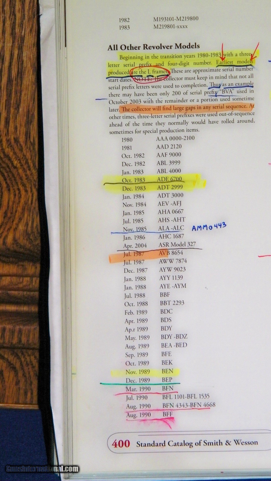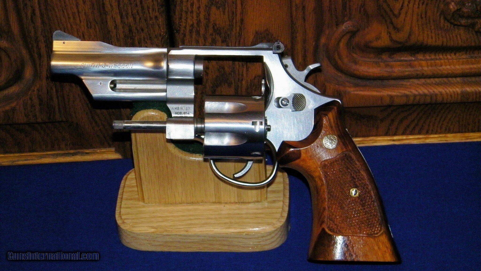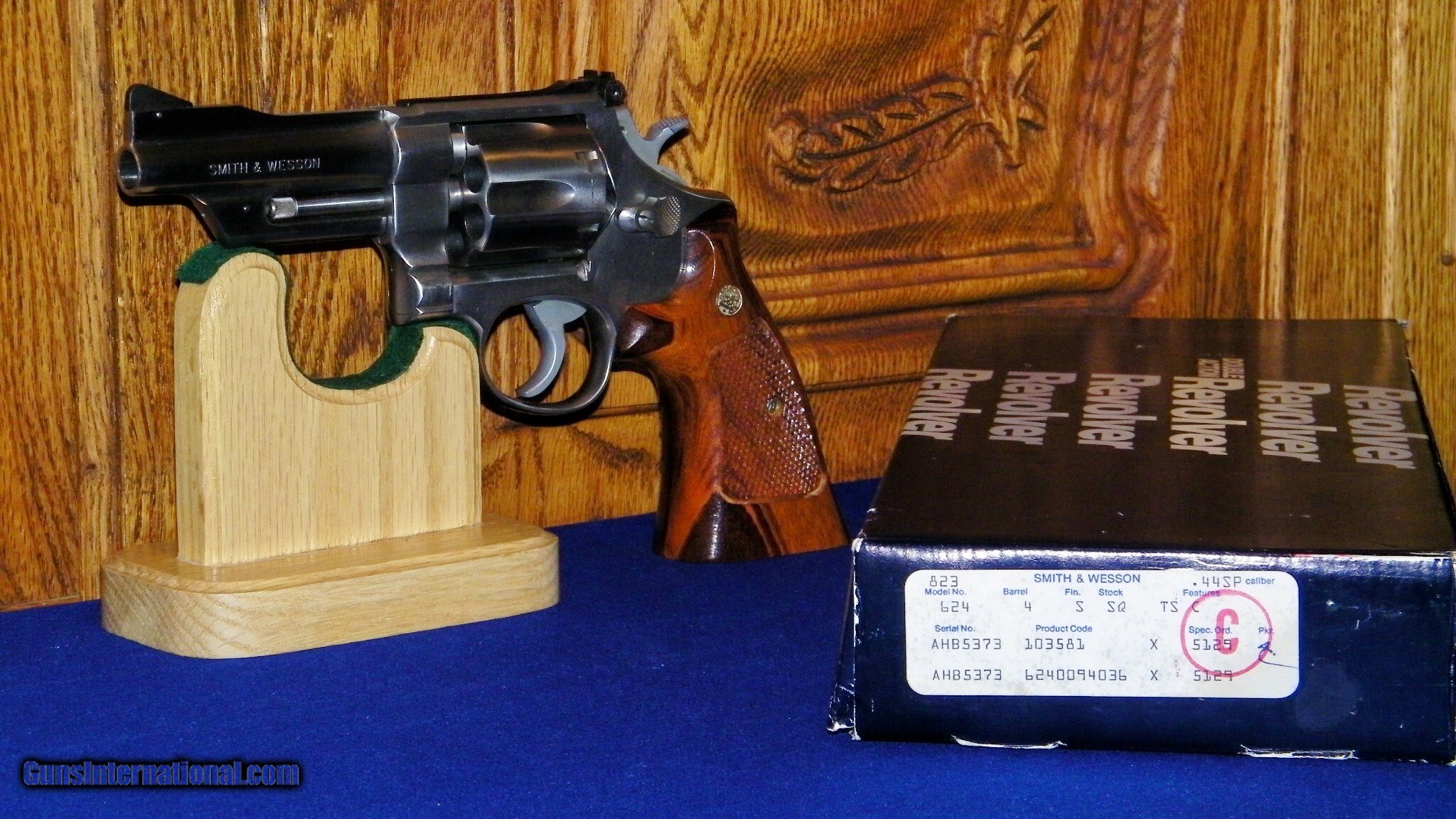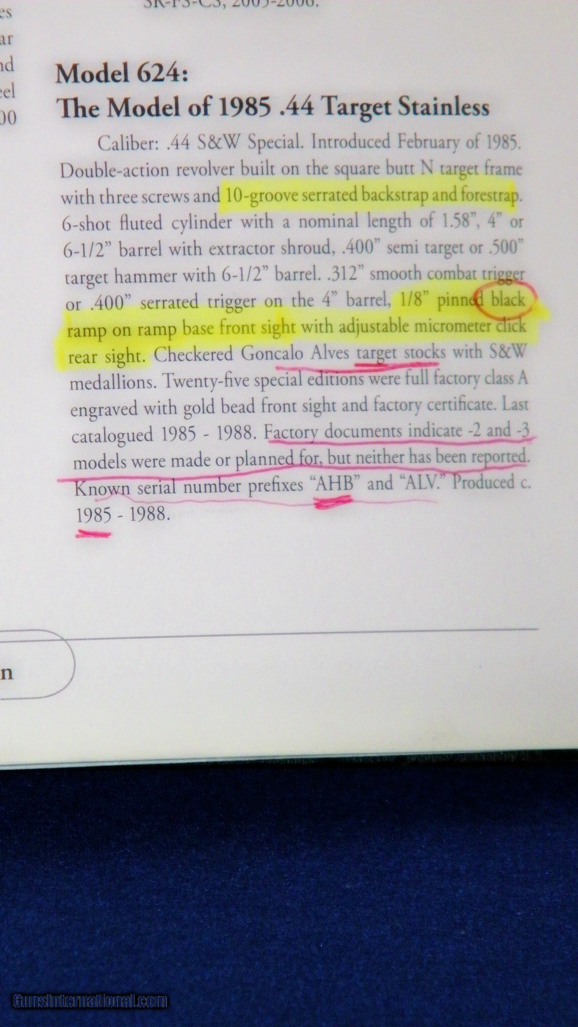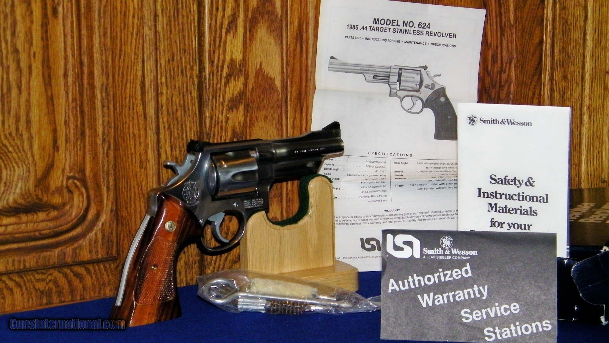 Description: SOLD to G.G.D. 4-13-20 SOLD to: G.G.D. = This Smith & Wesson Model 624, 4"inch, .44 Special with Serial #AHB5373…"AKA" The Model of 1985 .44 Target Stainless. It is 100% New in the Matching Numbered Box $1695 …"This S&W Pistol is A "First-Year" Production of the .44 Stainless-Steel "Target-Model 624" Which is Also Known As : "The Model of 1985 .44 Target Stainless". Ref: PG 252 SW Book = These were introduced February of 1985. Smooth Combat Trigger on this 4"inch Barrel, 1/8" Pinned Black Ramp, on Ramp Base Front Sight; With Adjustable Micrometer Click Rear Sight. Checkered Goncalo Alves Target Stocks with S&W Medallions. 10 Groove Serrated Backstrap & Forestrap. is 100% NIB $1695 SOLD |