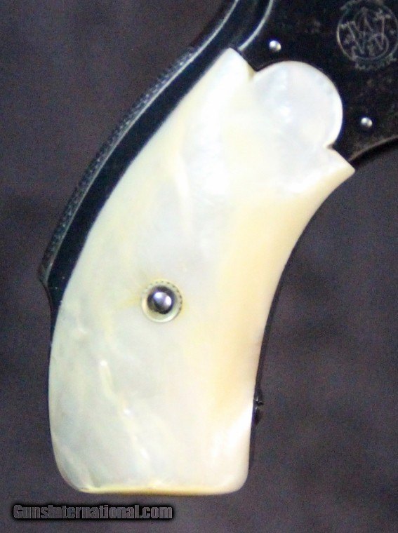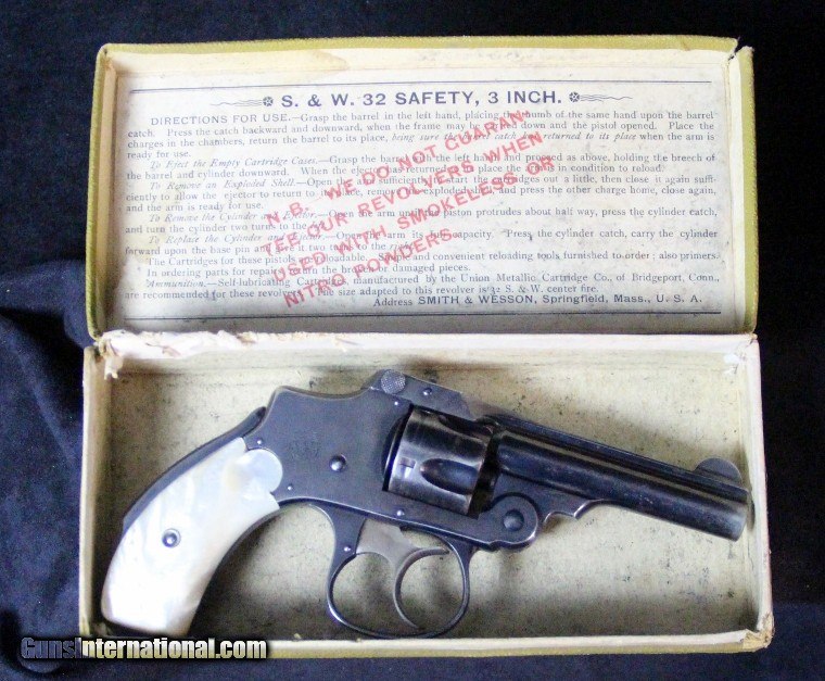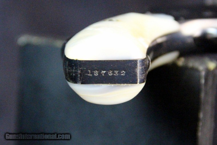 Description: .32s&w, #187632, 3 inch barrel, blue finish, 2 piece pearl grips, box end panel "32, 3 inch, nickel" Condition: excellent bore, 95% blue overall, excellent grips, functions well, excellent marks, very good box. SOLD Curio/Relic: Yes |