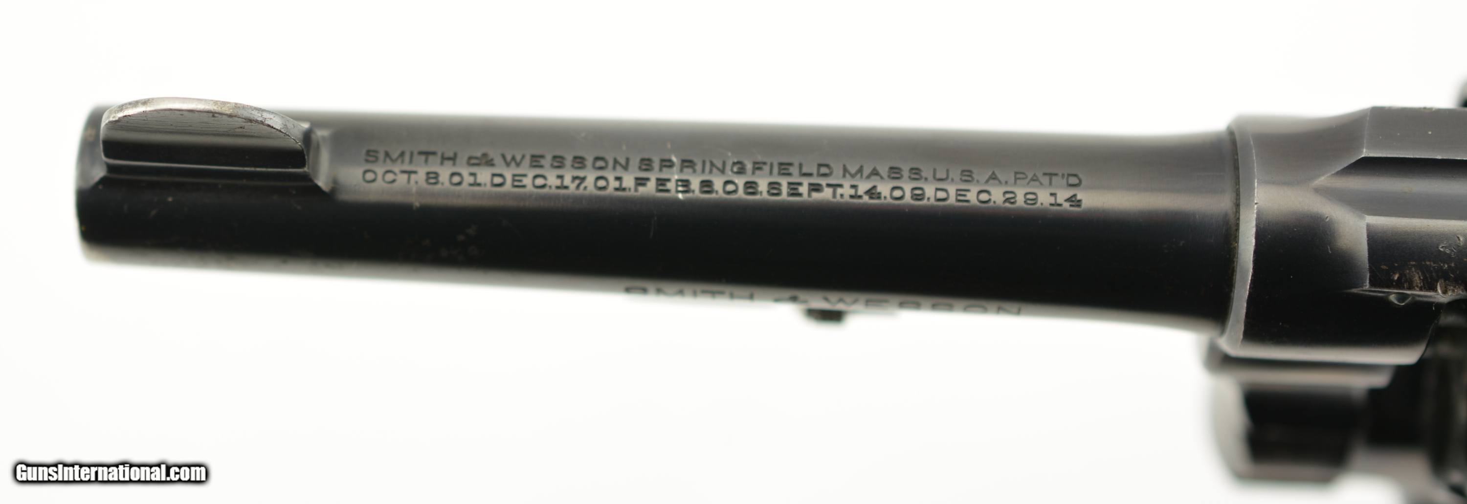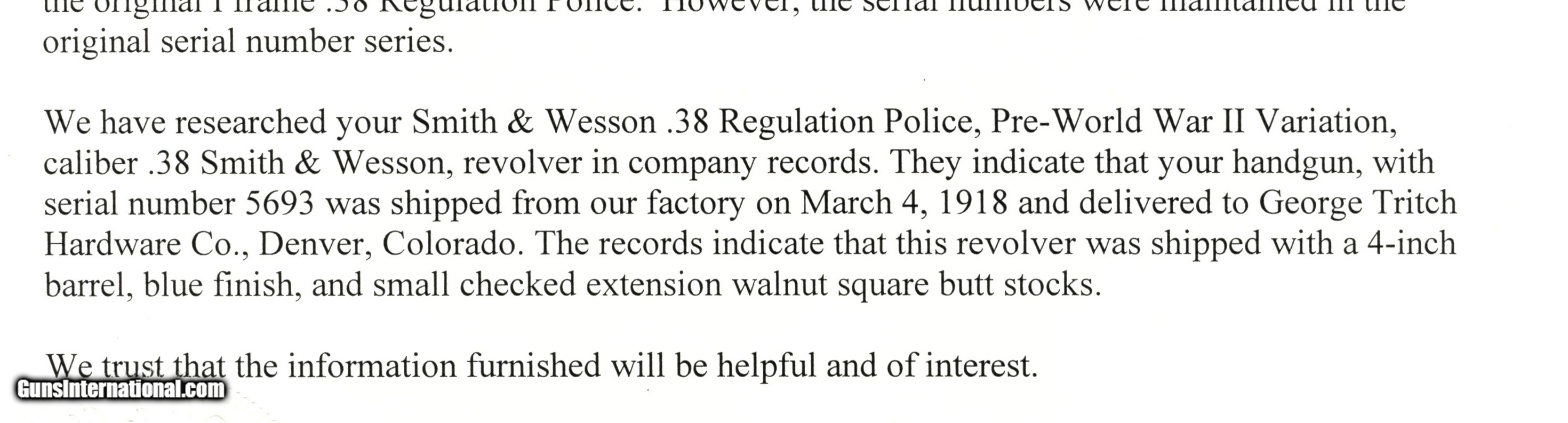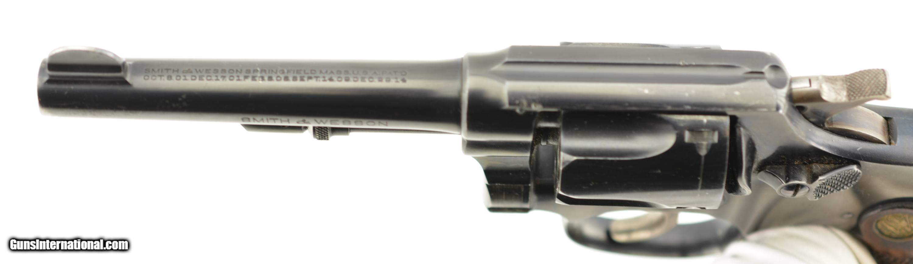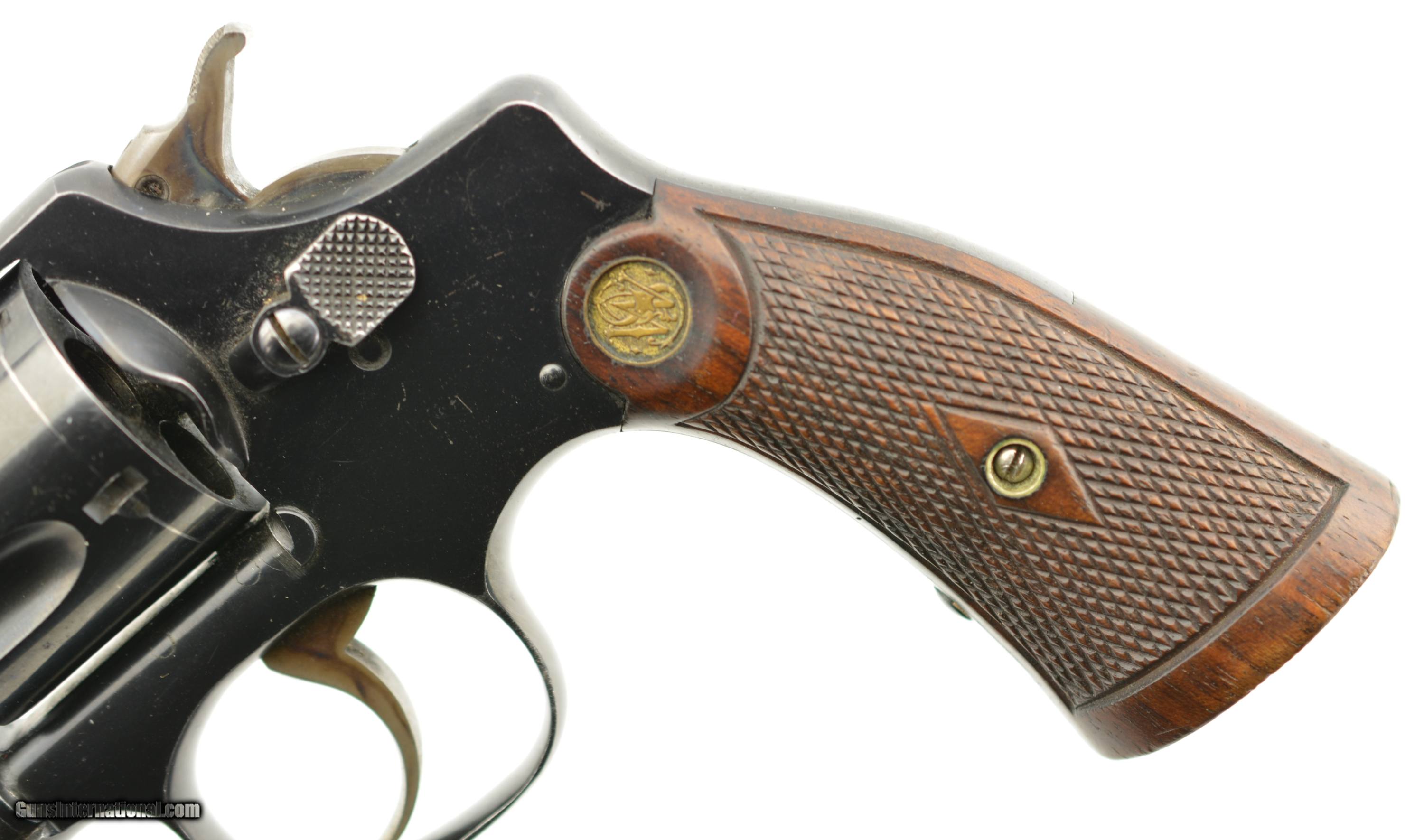 Description: Serial #5693, .38 S&W, 4" barrel with a fine, bright bore that has a small amount of freckling within the grooves at the breech. This is a handsome revolver that has matching numbers on the frame, barrel, cylinder, yoke, and extractor, with the metal retaining 95-97% of the original blue finish that has some silvering at the muzzle, on the high edges and projections, as well as a turn-ring on the cylinder. The hammer and trigger retain a commensurate amount of the original color case-hardening, with some silvering along the edges and contact points. The original checkered, diamond-center grips are pencil-numbered to the gun on the interior, and are in very good plus condition, with some flattening of the points, and some minor impact marks on the butt. The lock-up is tight, and the action is fully functional. The revolver is accompanied by a 2021 dated S&W Historical Foundation letter that lists a ship date of March 4, 1918, to the George Tritch Hardware Co. of Denver, CO. This is a splendid looking S&W, and is in fine-near excellent condition. FFL or C&R SOLD Curio/Relic: Yes |