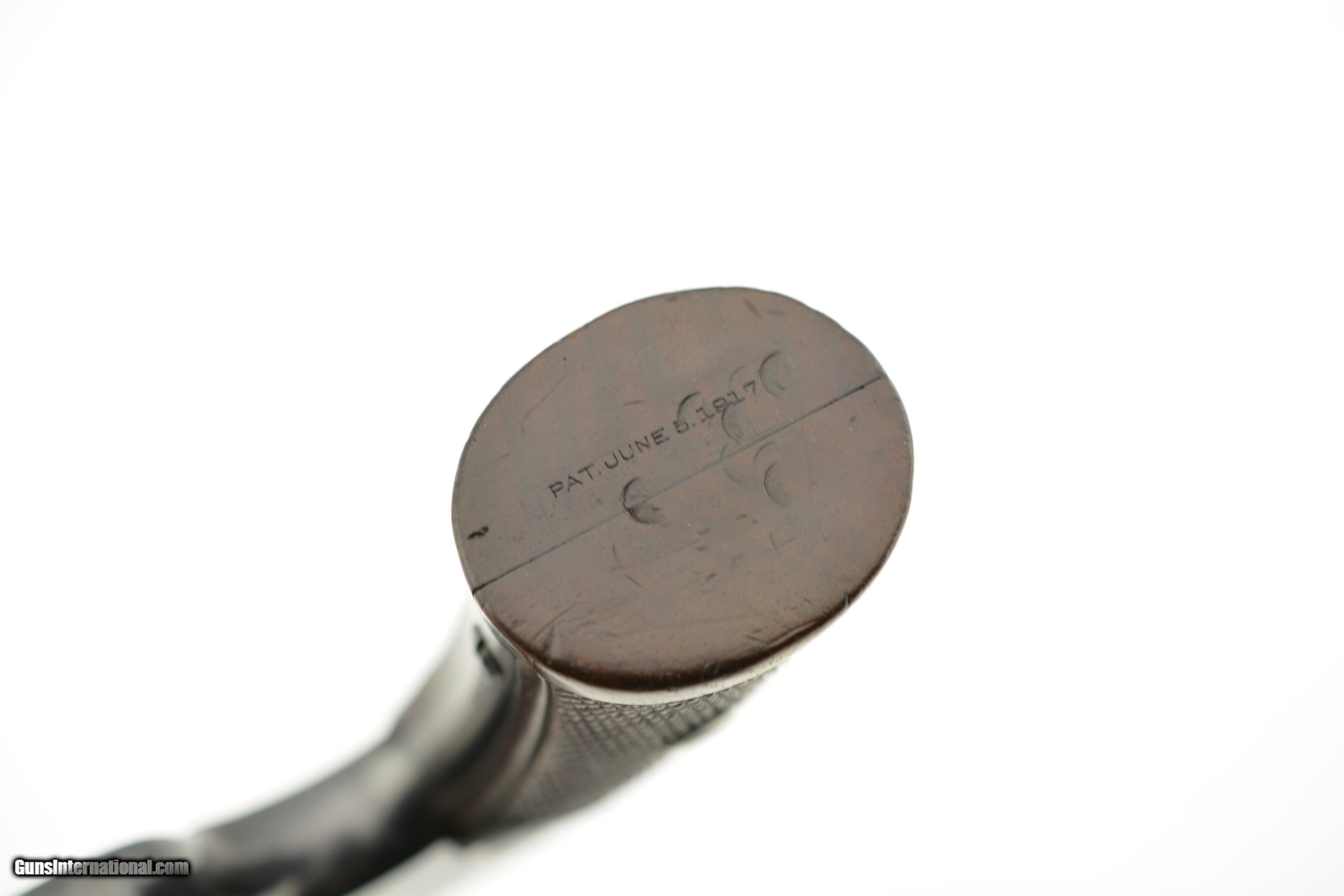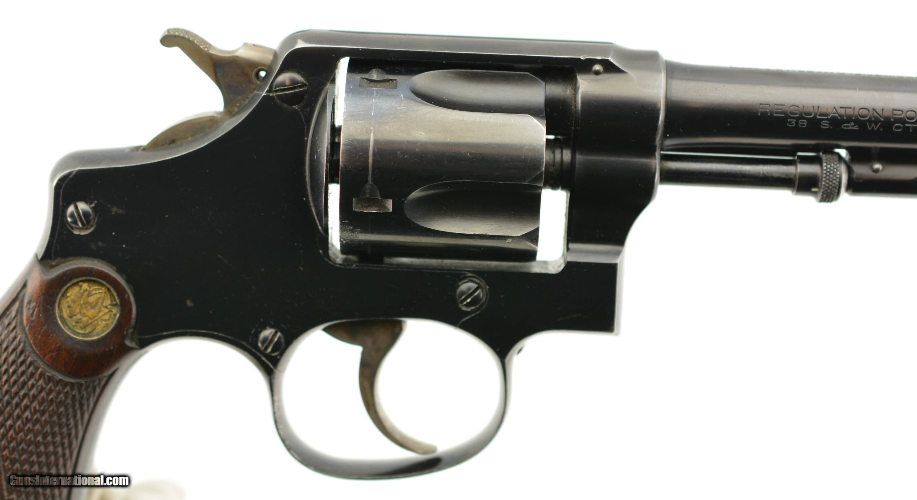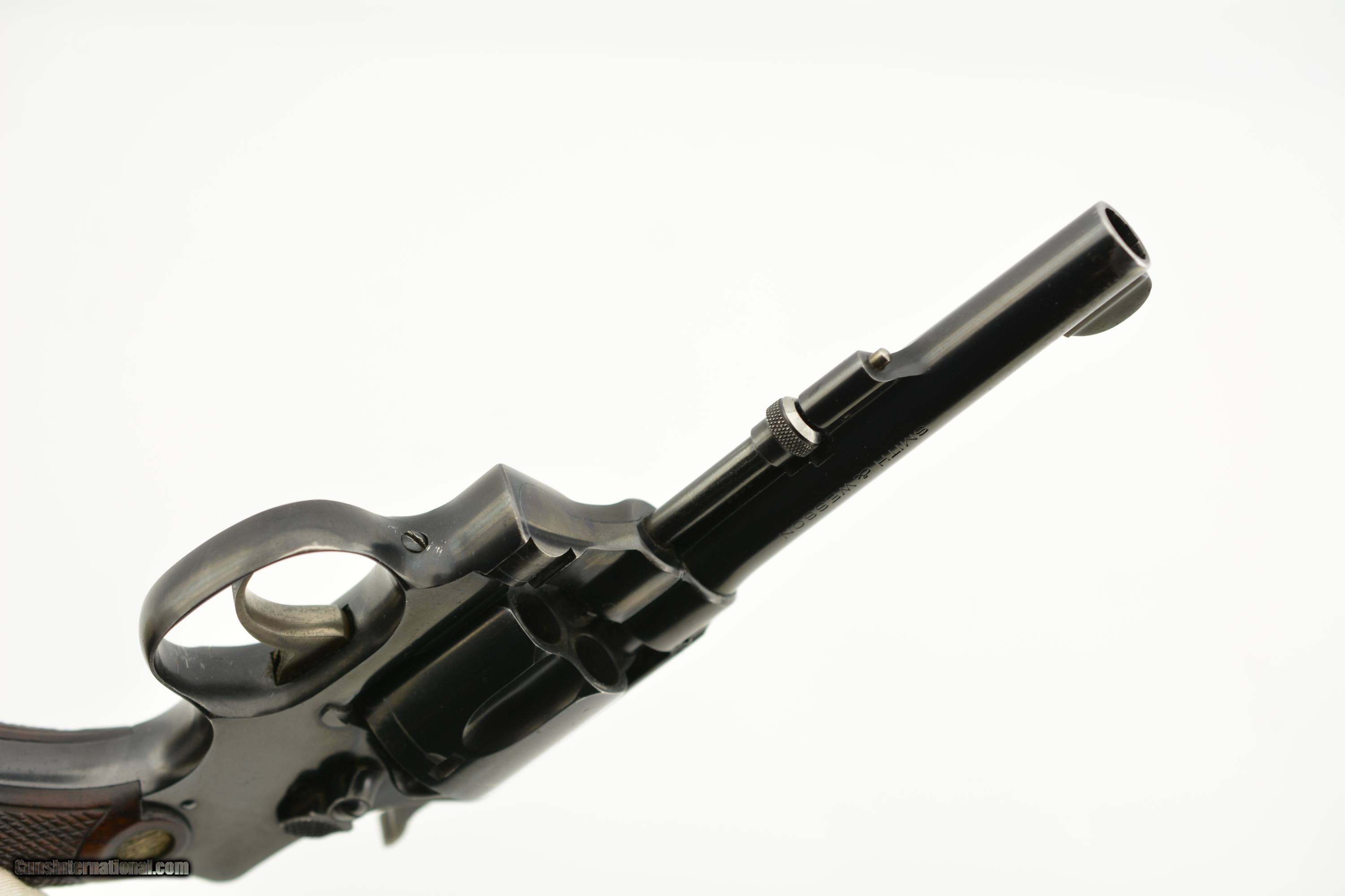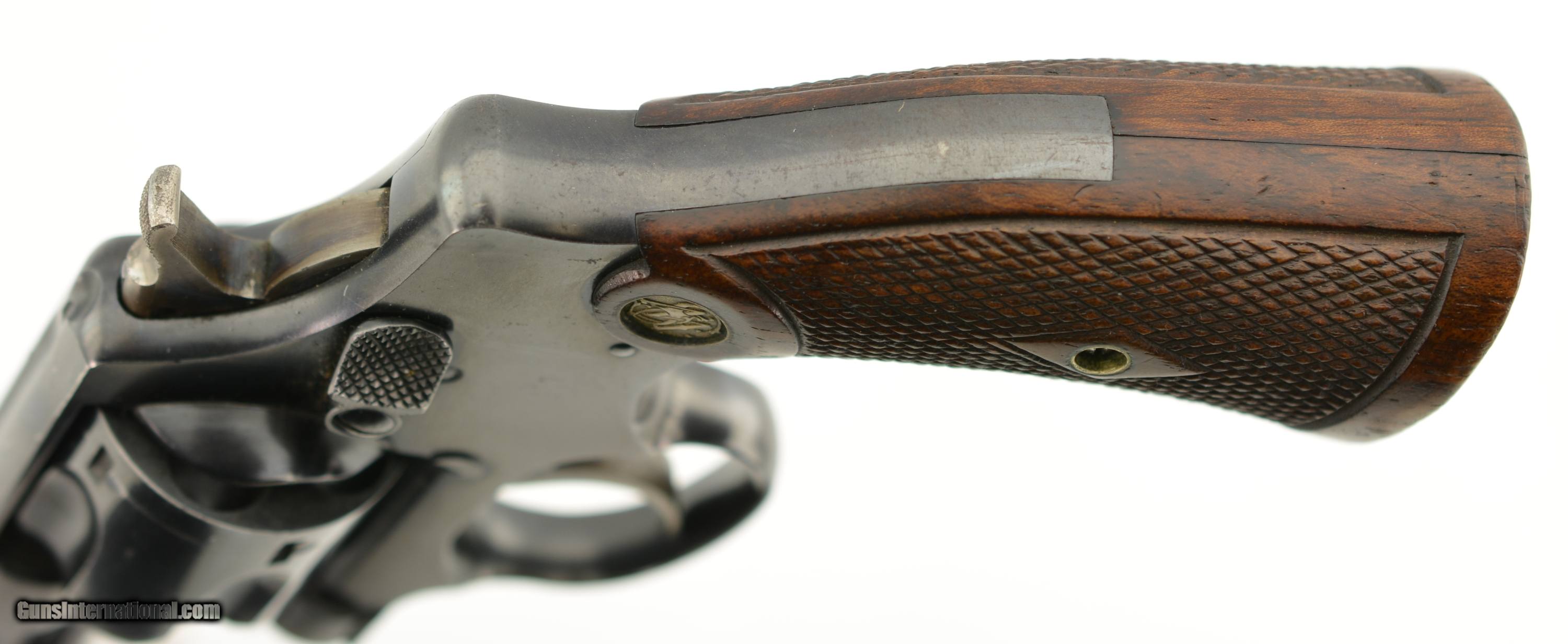 Description: Serial #5693, .38 S&W, 4" barrel with a fine, bright bore that has a small amount of freckling within the grooves at the breech. This is a handsome revolver that has matching numbers on the frame, barrel, cylinder, yoke, and extractor, with the metal retaining 95-97% of the original blue finish that has some silvering at the muzzle, on the high edges and projections, as well as a turn-ring on the cylinder. The hammer and trigger retain a commensurate amount of the original color case-hardening, with some silvering along the edges and contact points. The original checkered, diamond-center grips are pencil-numbered to the gun on the interior, and are in very good plus condition, with some flattening of the points, and some minor impact marks on the butt. The lock-up is tight, and the action is fully functional. The revolver is accompanied by a 2021 dated S&W Historical Foundation letter that lists a ship date of March 4, 1918, to the George Tritch Hardware Co. of Denver, CO. This is a splendid looking S&W, and is in fine-near excellent condition. FFL or C&R SOLD Curio/Relic: Yes |