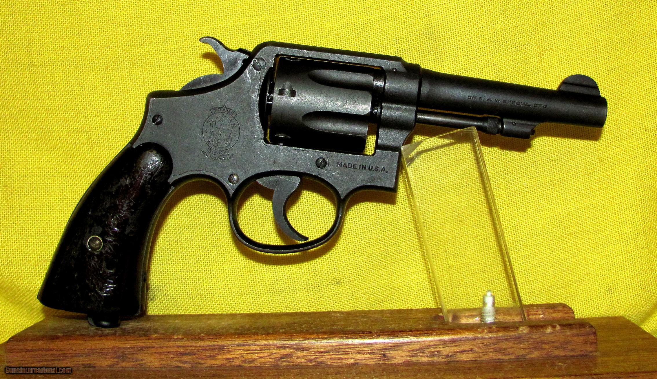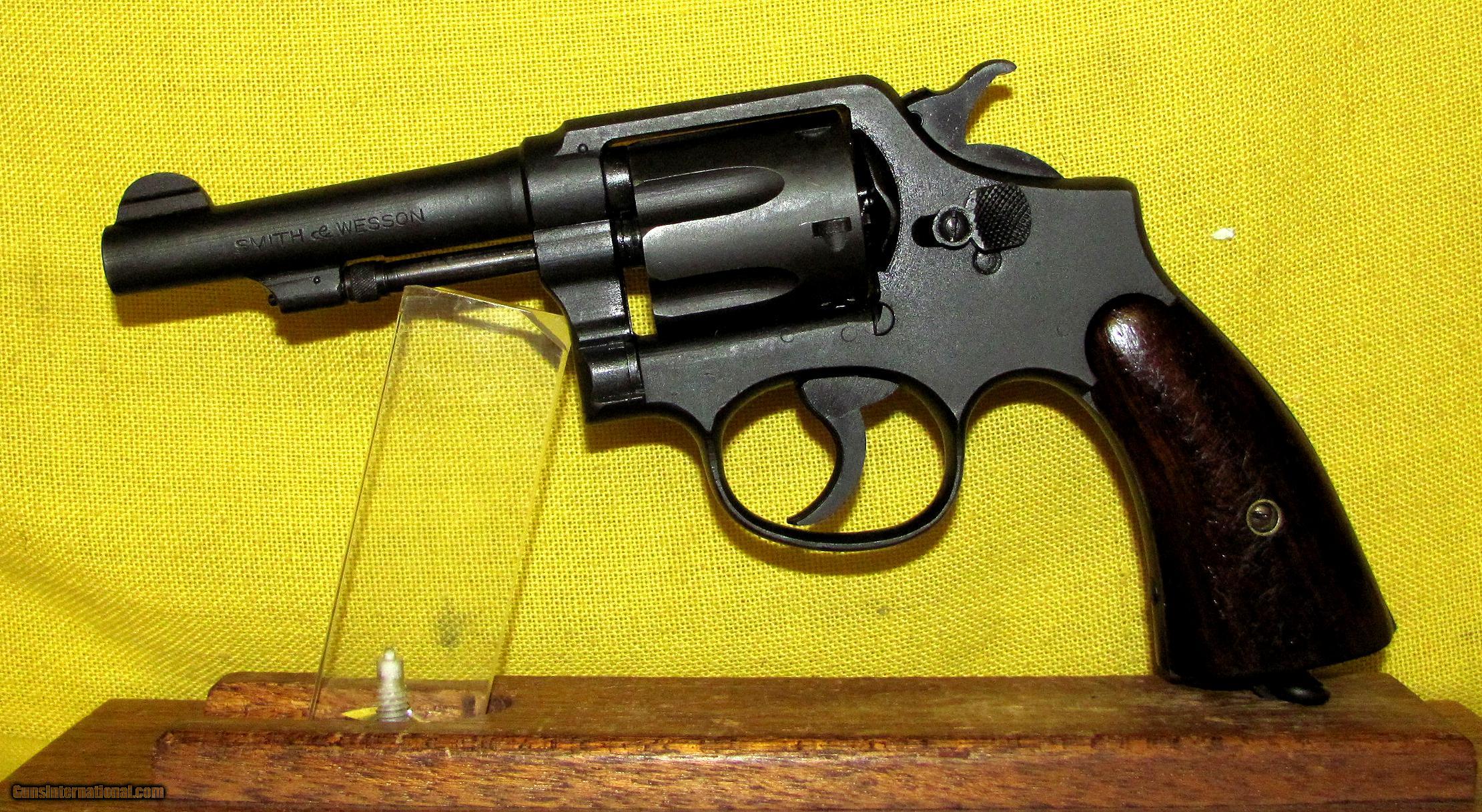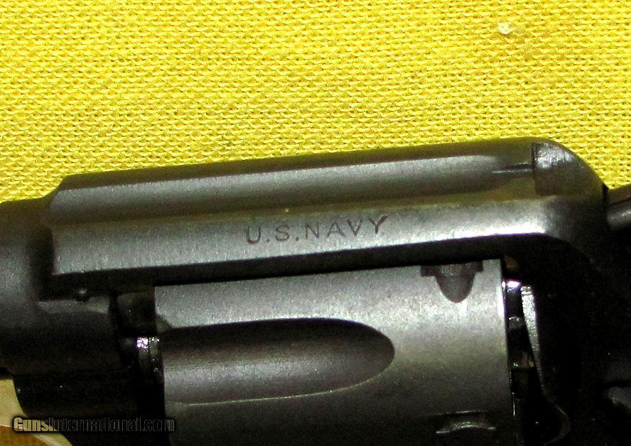 Description: S&W model VICTORY in .38 SPECIAL CAL., with 4" barrel. Color PARKERIZED. S&W MODEL VICTORY MODEL, MARKED US NAVY ON TOP STRAP, BRIGHT SHINNY BORE, VERY GOOD SMOOTH GRIPS, LANYARD LOOP, 97%+ PARKERIZED FINISH, ALL ORIGINAL. OUR NEW STOCK # D31061 Condition 97%. Serial number V195023. SOLD |