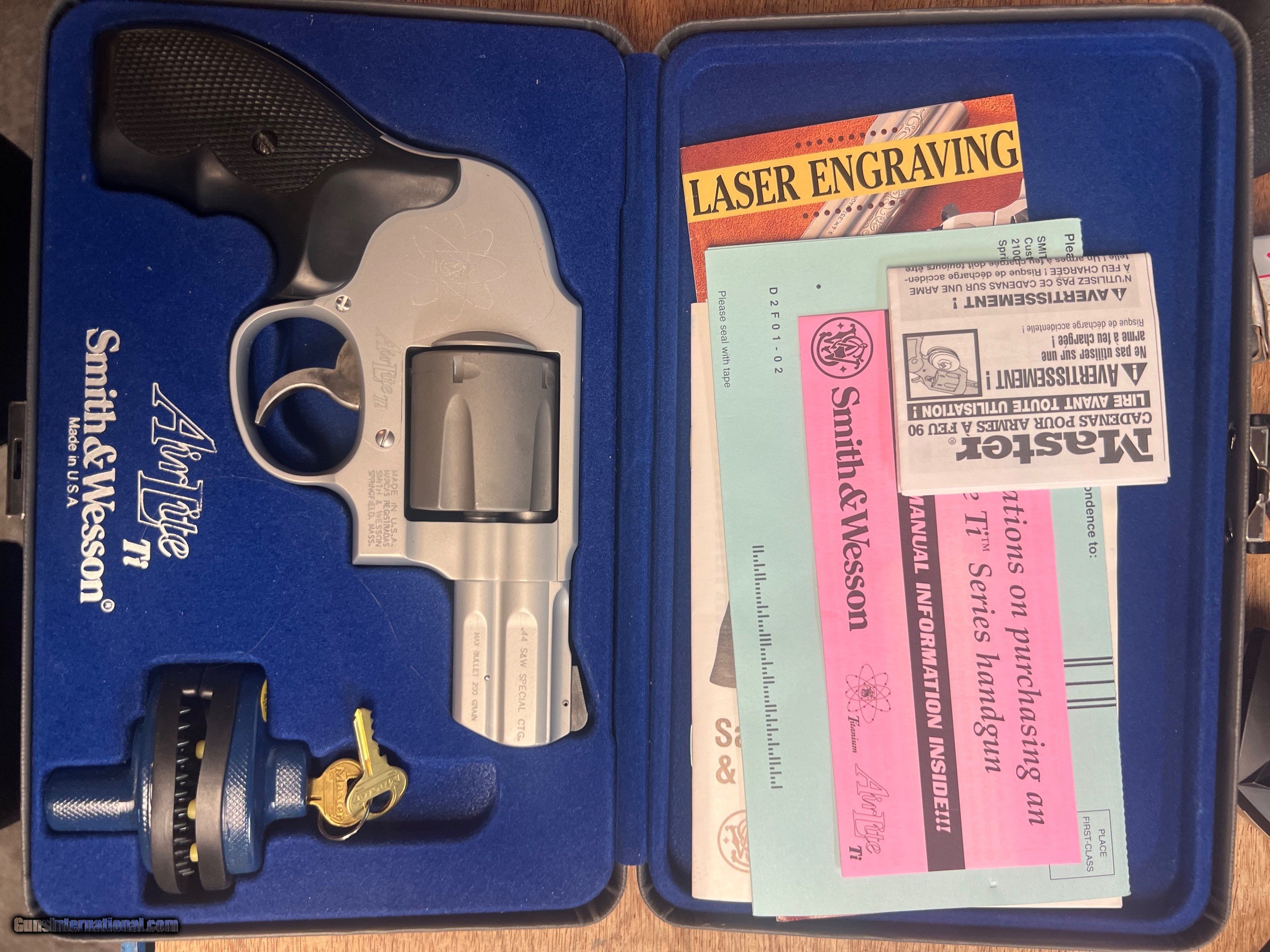 Description: Like new in box , appears unfired with papers has collectors box and cardboard box , Smith & Wesson Model 296 AirLight TI - .44 Special The Smith & Wesson Model 296 AirLite TI is a double action only revolver chambered in .44 Special. It is built on a scandium alloy "L" frame and has a titanium cylinder giving it a distinctive two-tone appearance. these are rare and hard to find . Excellent condition, No credit cards accepted , message with any questions , contact for payment SOLD Handgun Caliber: .44 Special Manufacturer: Smith and Wesson Model: 296 Ti Barrel Length: 2.5 inch Bore: Excellent Chambers: Excellent Ejectors: Excellent Condition: Excellent Metal Condition: Excellent Wood Condition: Excellent Bore Condition: Excellent Barrels: Excellent Action: Excellent Triggers: Excellent Weight: 1.2 lb |