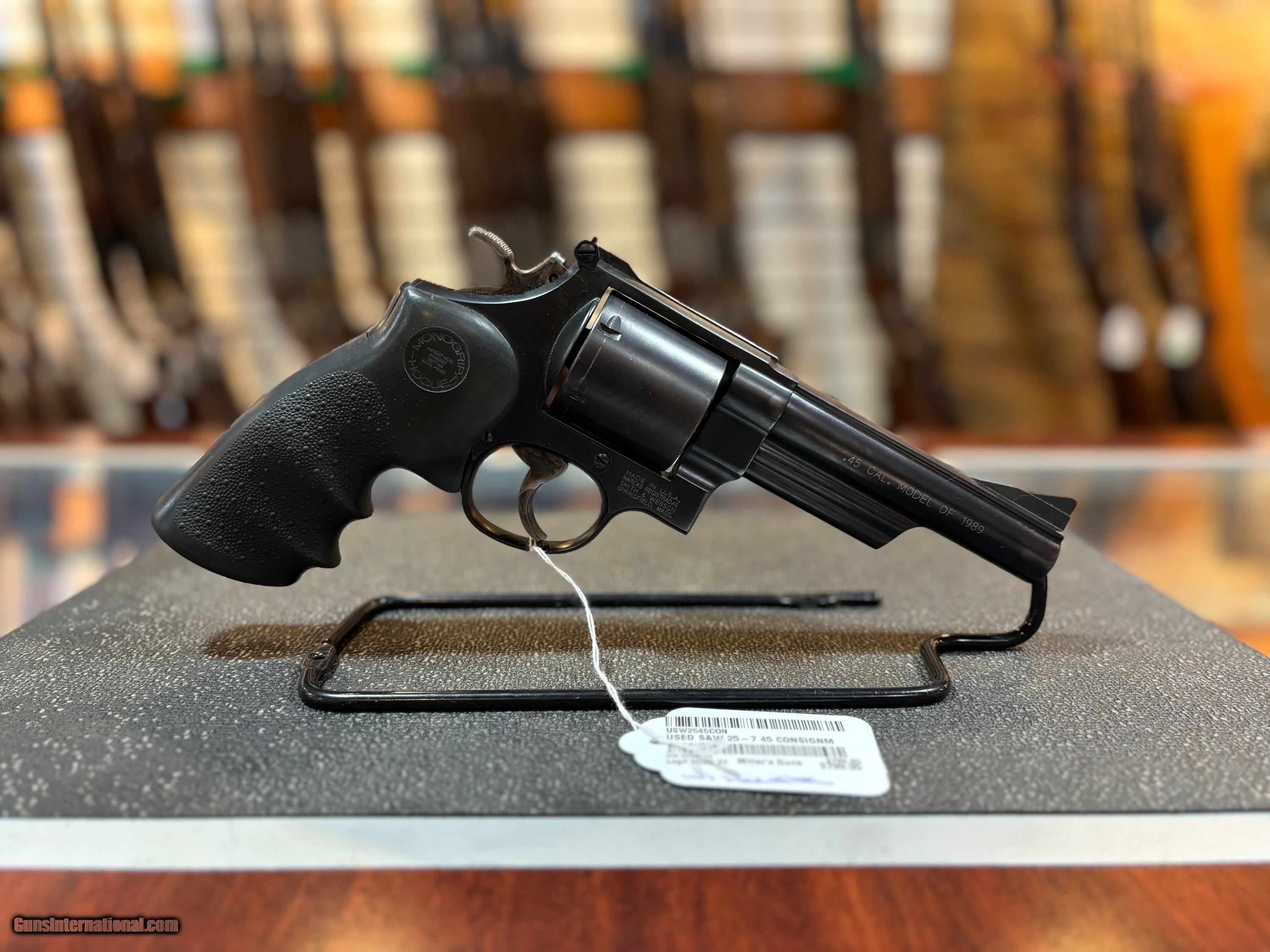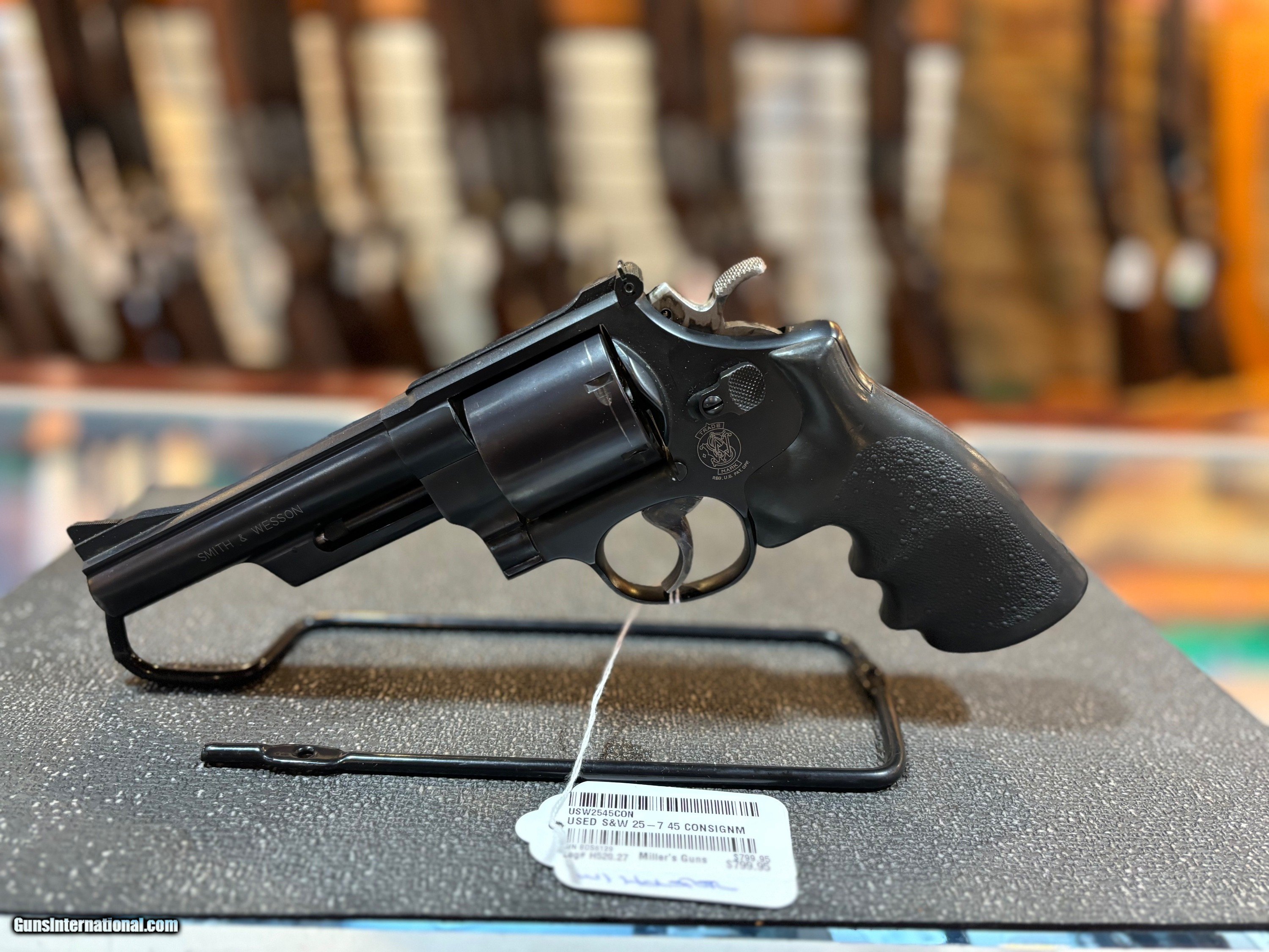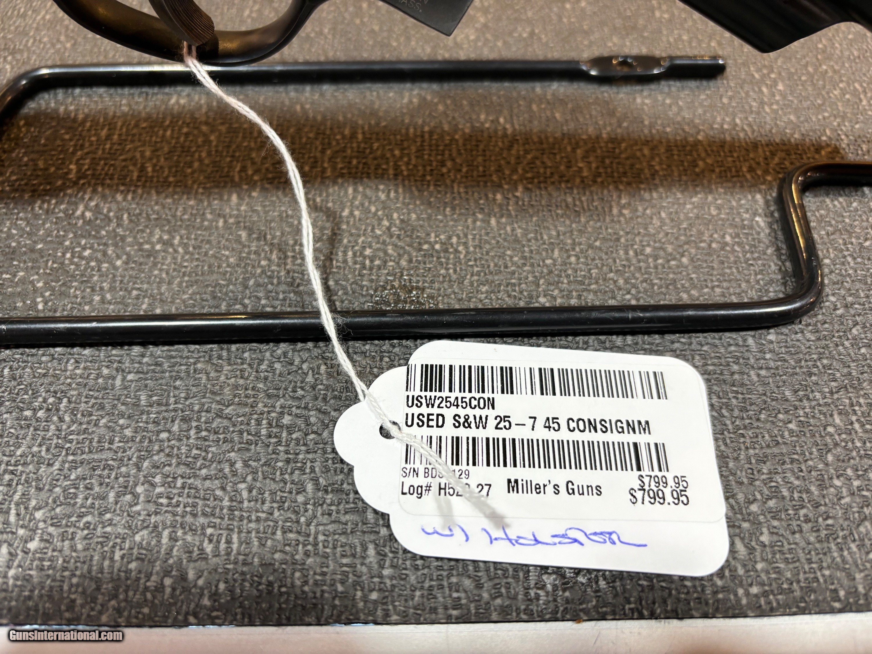 Description: Smith and Wesson 25-7 .45 Colt 6 round capacity No box/manual Holster included SOLD Handgun Caliber: .45 Manufacturer: Smith and Wesson Model: 25-7 Serial Number: BDS6129 Condition: Good/Fair |