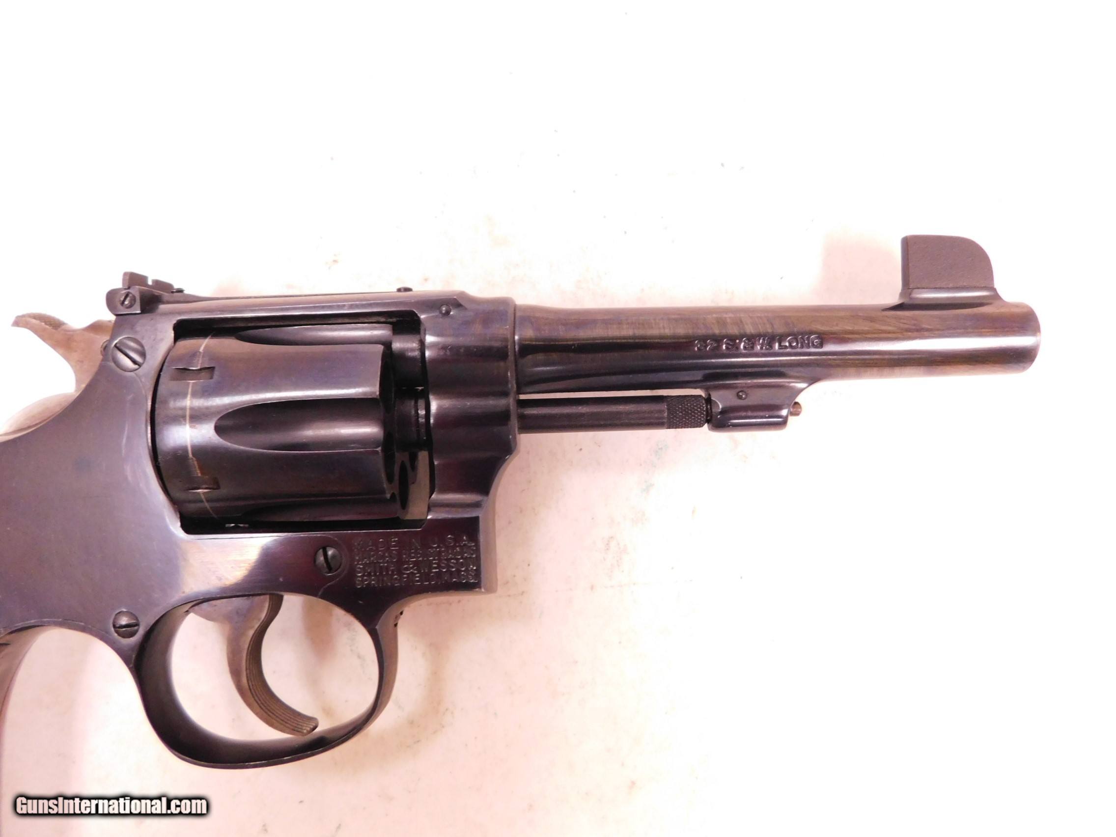 Description: Smith and Wesson 32 hand ejector, 32 s&w long, 4" barrel, manufactured 1957, last of the I frame revolvers. This is a rare adjustanle sight version in perfect original condition. The gun shows no use, there is a slight loss of bluing at that muzzel. Price $2500 and $25 shipping and handling. SOLD Manufacturer: SMITH AND WESSON Caliber Info: 32 Condition: EXCELLANT |