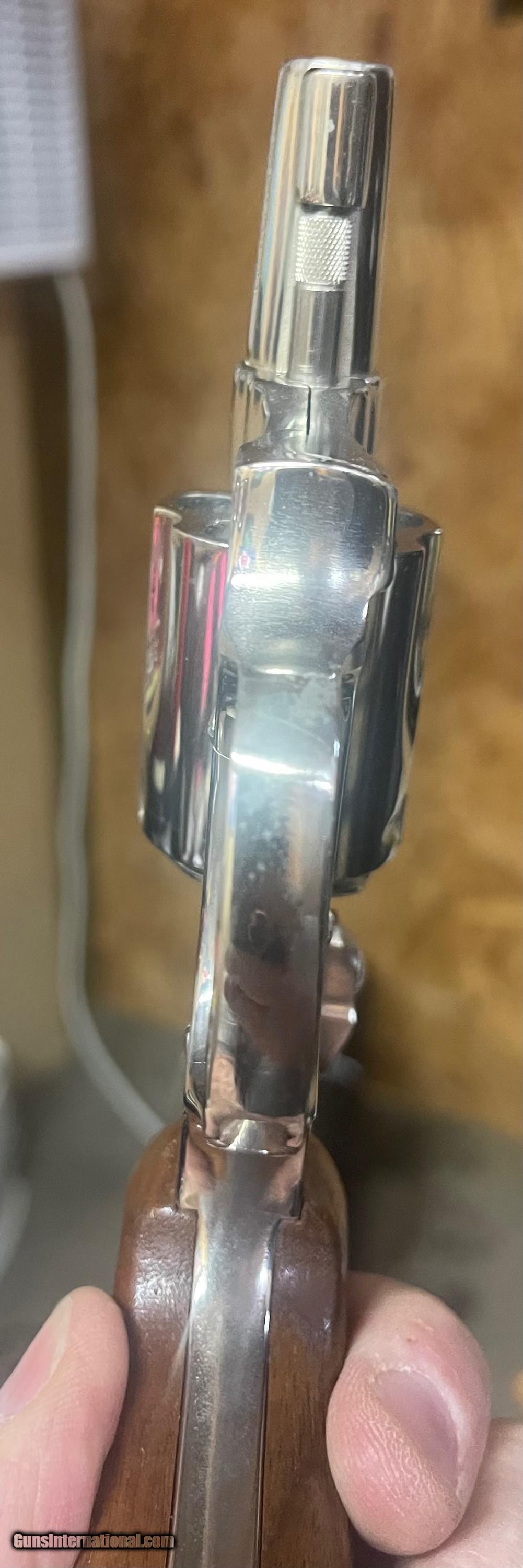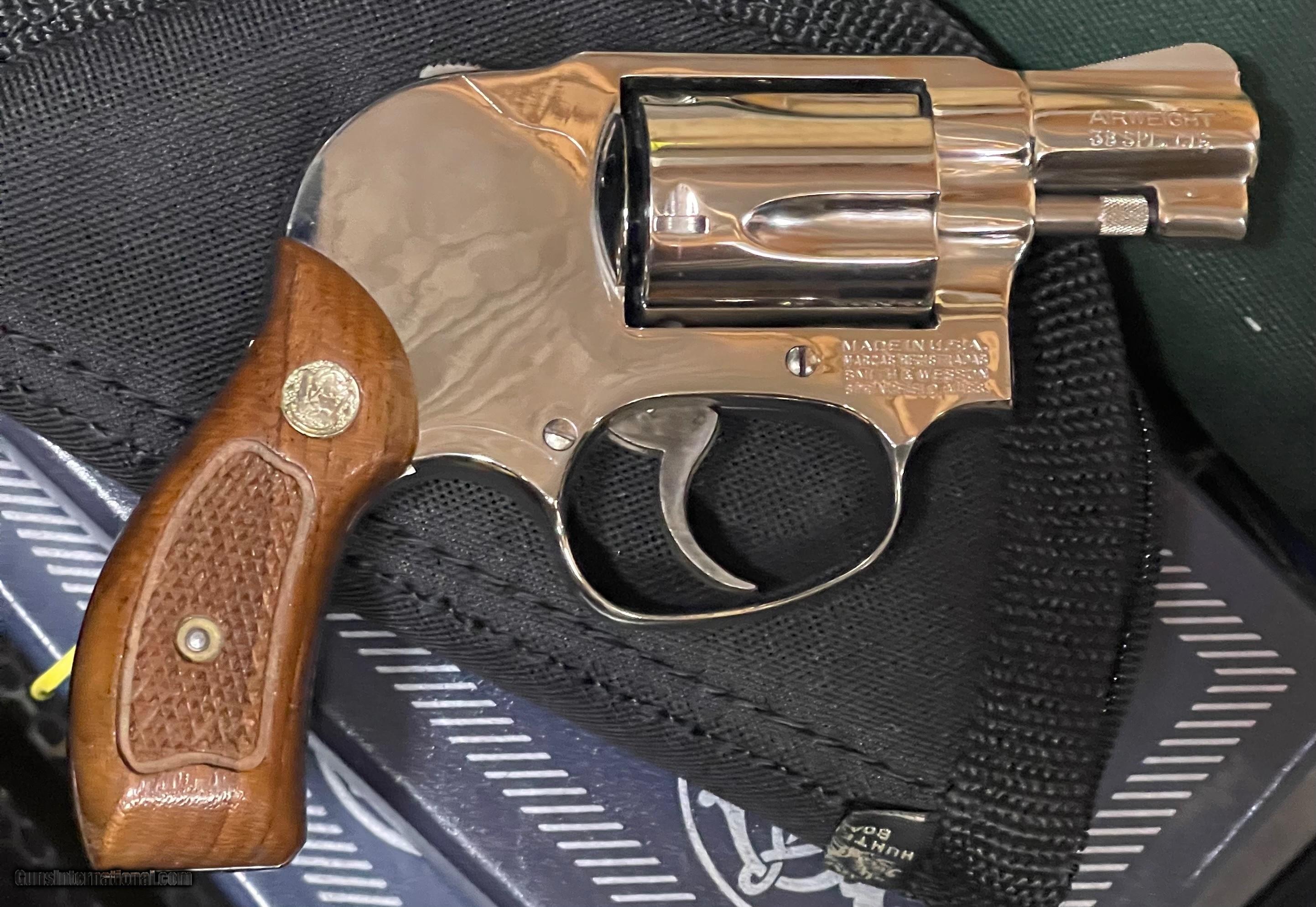 Description: Hard to find gun, especially in nickel. This Airweight model 38 is fitted with a 1 7/8ths inch barrel, recessed hammer, nickel finish, and wood grips. There is some light clouding around the top strap. Also, some nickel loss along the edges of the top strap from being carried. Nonetheless, a fine, rare gun. No box. Please email with questions. Shipping and insurance included. Cards add 3% SOLD Manufacturer: Smith and Wesson Model: 38 Barrel Length: 1 7/8ths Condition: Used Metal Condition: Very good Wood Condition: Excellent Bore Condition: Excellent Finish: Nick Item Location: 37075 |
