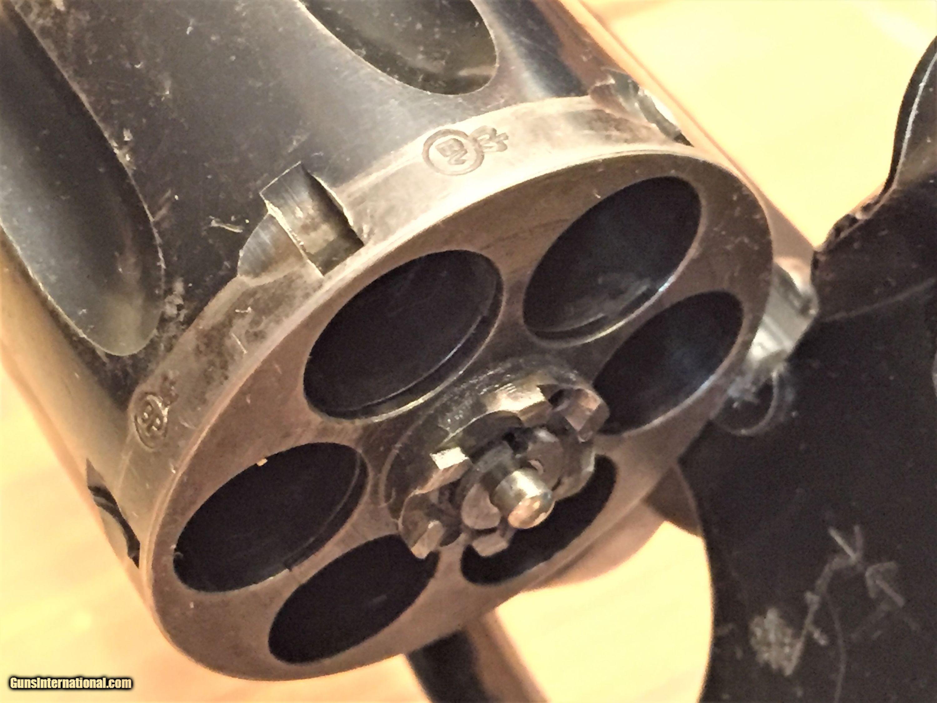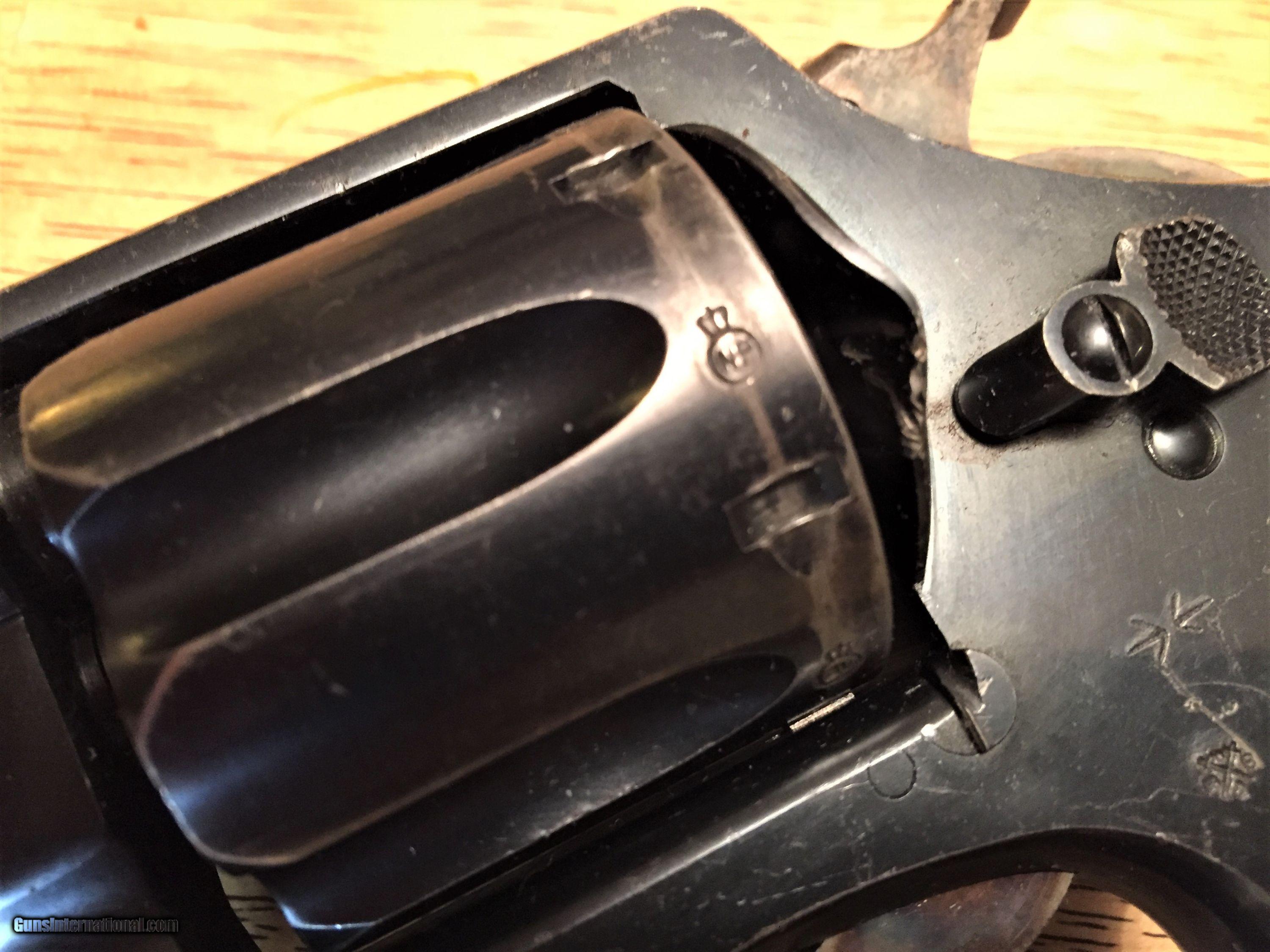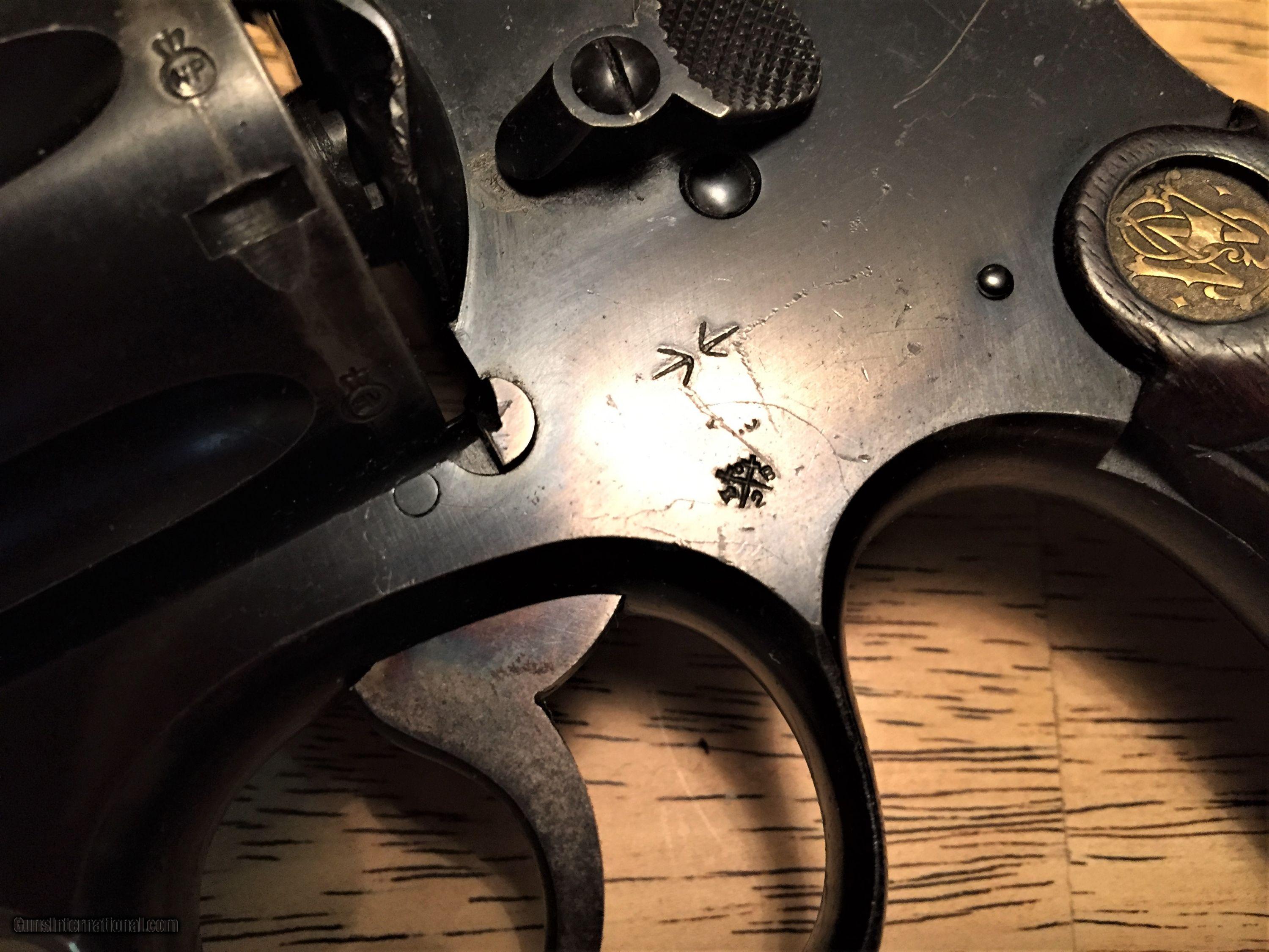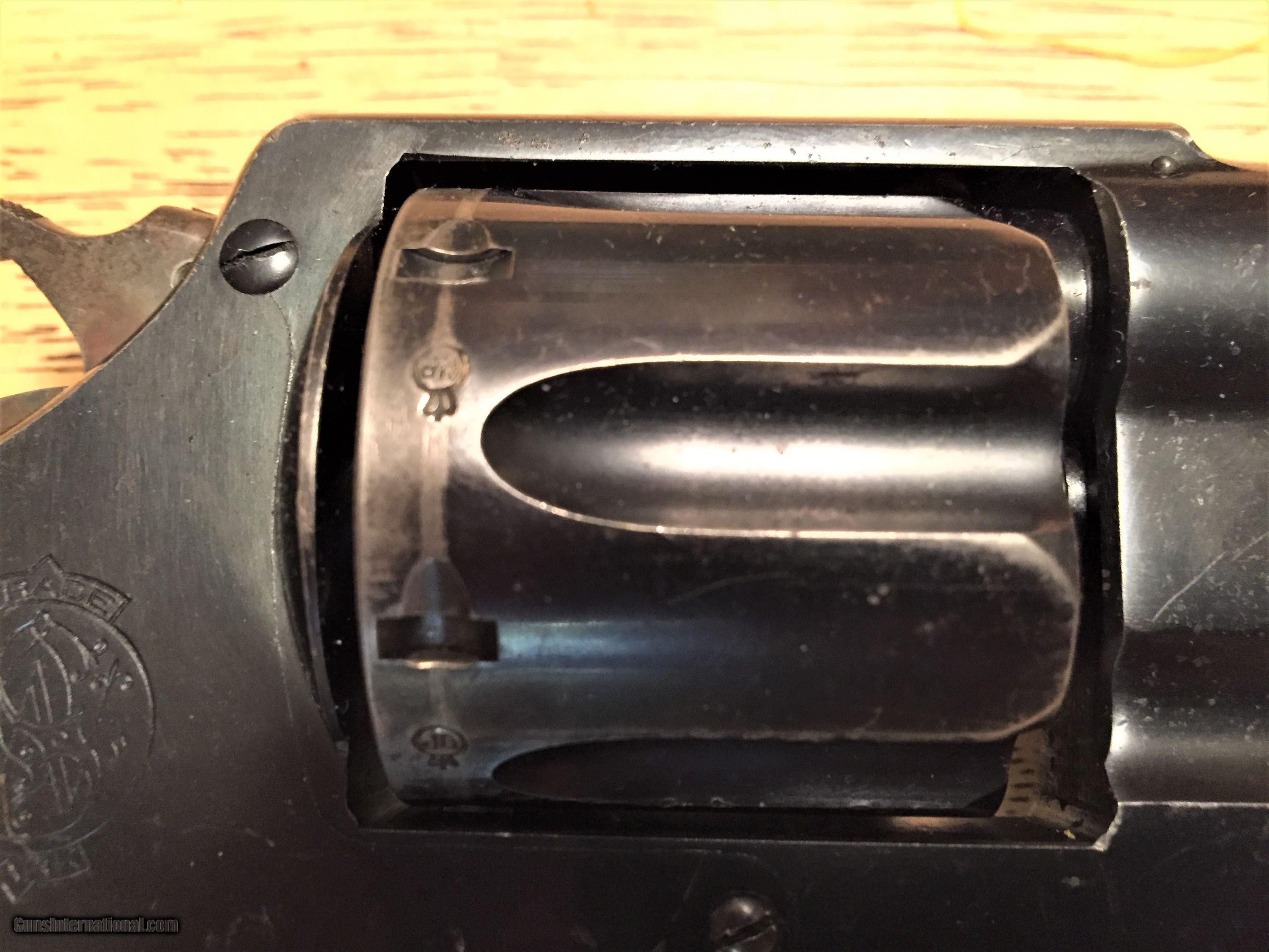 Description: Nice example of a Smith and Wesson .455 that has had the cylinder modified to take the 45ACP cartridge. gun is heavily proof marked, including each chamber of the cylinder. Also Marked "Not English Made" Original S&W gold medalion grips are in good condithon, Overall gun has substantial blue re-maining. Mostly gone from the rear of the cylinder where the modification took place. Used by both the British and Canadians, this is a nice example of an early big bore Smith in a shootable caliber.$695.00 C&R/FFL required. Buyer to pay $40.00 shipping. C/C please add 3% SOLD Curio/Relic: Yes Manufacturer: Smith and Wesson Model: Hand Eject Serial Number: 31246 Caliber Info: .455/45acp Condition: good |