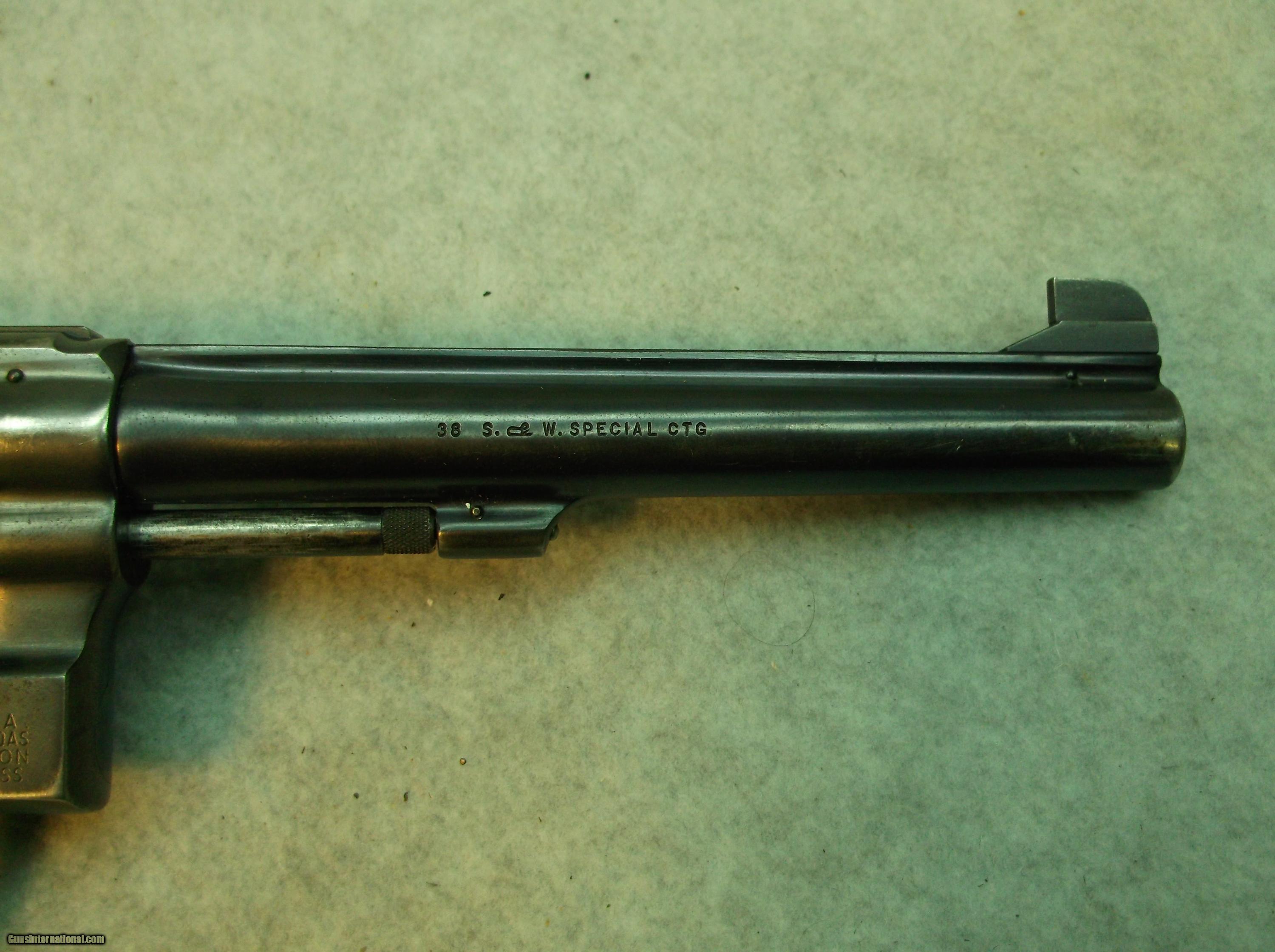 Description: Good clean Smith and Wesson 38 special K-frame revolver with a 6" barrel. Bore is bright and shiny and the action crisp. The bluing is starting to fade on the barrel and high parts of the cylinder. Wood grips have some scratches and dinks and a small piece missing at the base of one. Our stock # A055, please use this number when referencing this item. Willing to ship anywhere in the USA, buyer pays freight charges. SOLD Manufacturer: Smith & Wesson Caliber Info: 38 Spl Item Location: Eugene, Oregon |