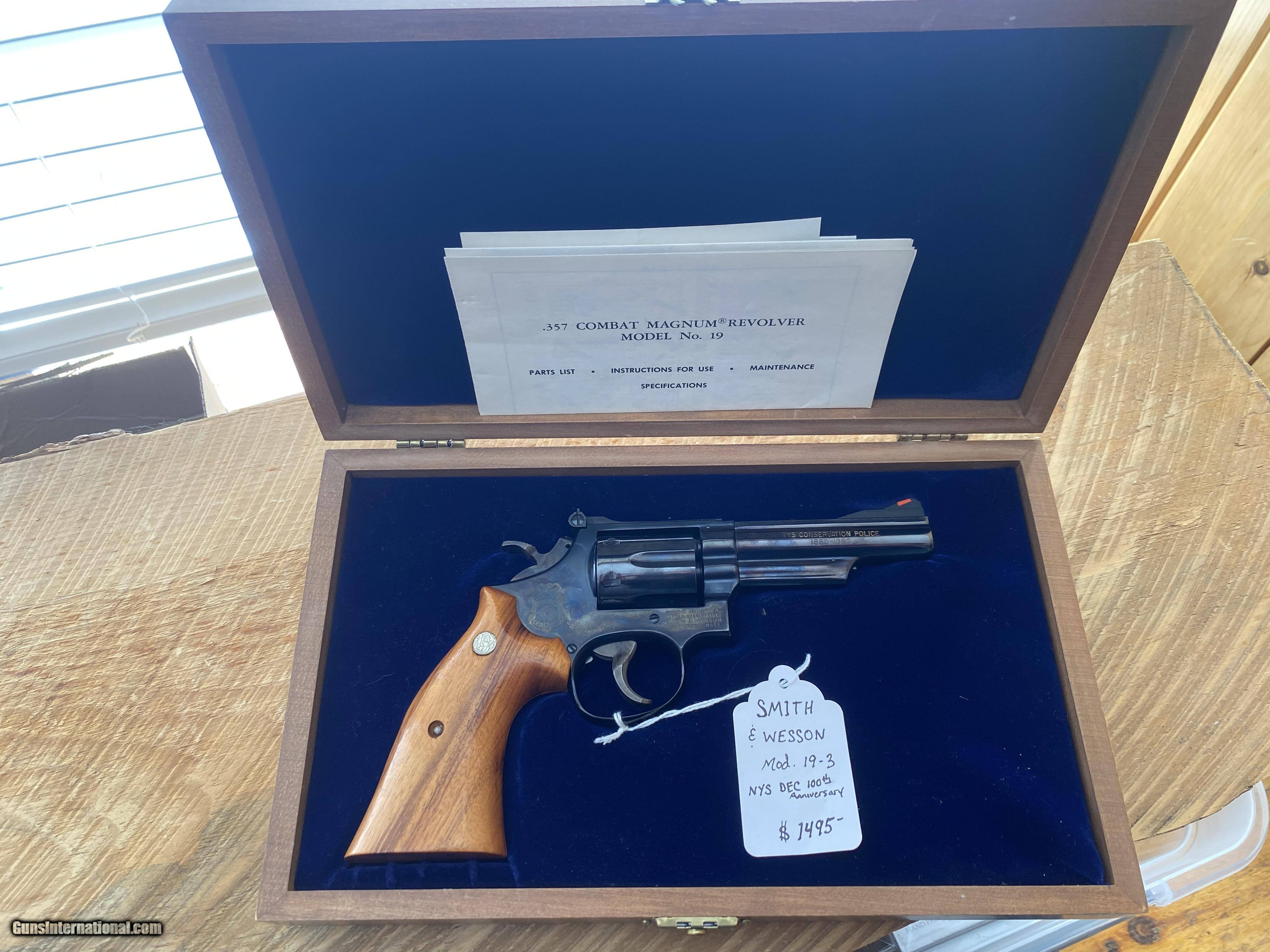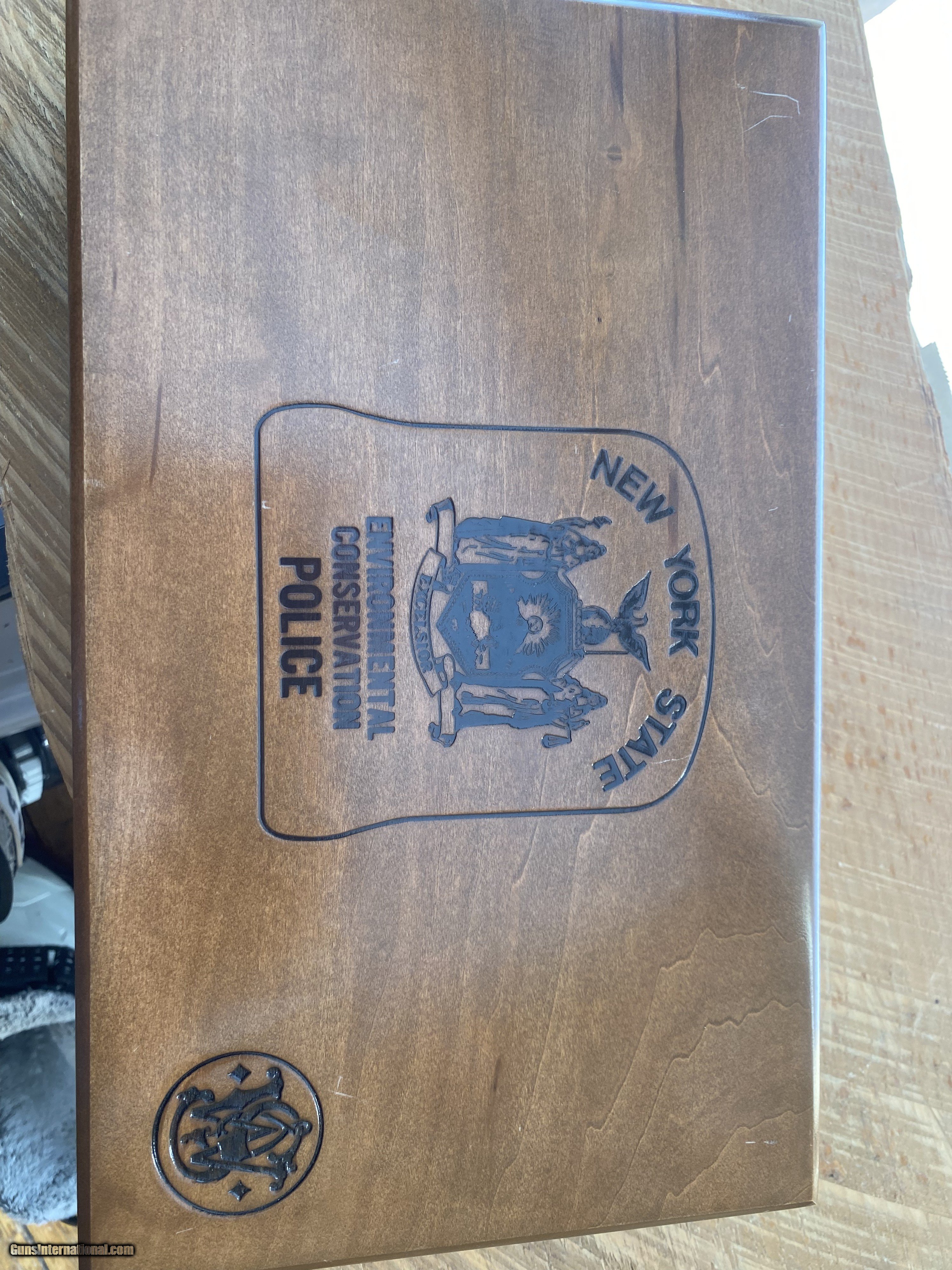 The year 1980 marked the 100th anniversary of conservation law enfourcement in New york State. To help celebrate this occasion, Smith and Wesson made this commemorative Model 19 in 357. The barrel in inscribed with 1880-1980 Conservation Police and the Environmental Conservation Police Badge is on the side plate, all gold inlaid. The handgun comes equipped with a target trigger and hammer, a red front ramp and a white outlined rear sight, plus Goncalo Alves smooth grips. The handgun is in a velvet lined case with New York State Environmental Conservation Police emblem burned into the top cover.