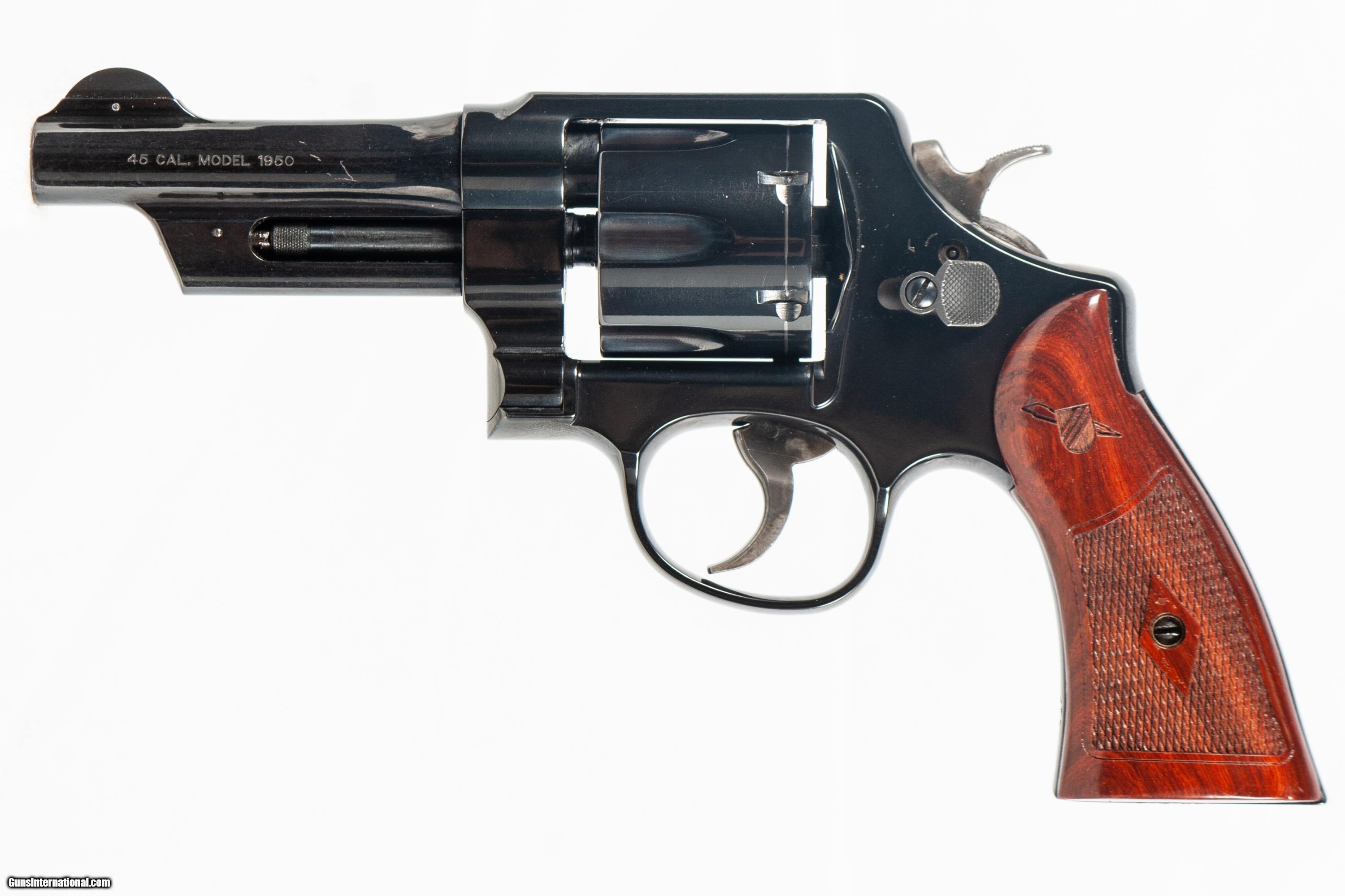 SMITH AND WESSON MODEL 1950 22-4 CHAMBERED IN 45 CAL WITH A 4 INCH BARREL BRIGHT BORE GOOD GROOVES AND 17 MOON CLIPS. THIS GUN IS IN EXCELLENT CONDITION AND IS COVERED BY DURY'S LIFETIME WARRANTY.