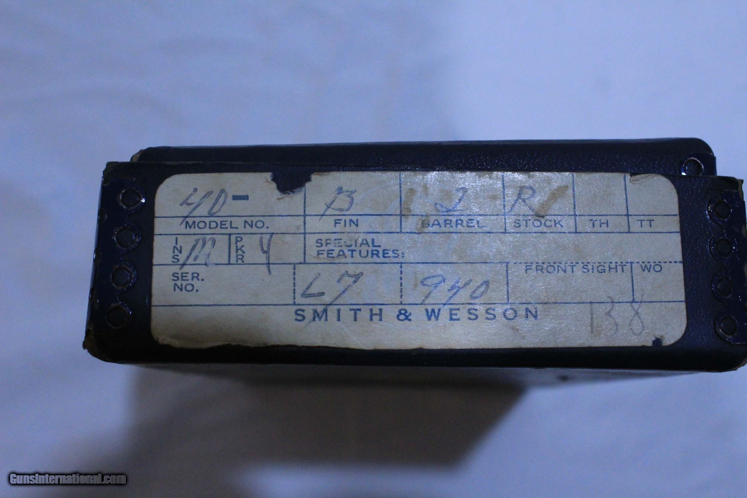 Description: Please read full description. Smith and Wesson Model 40 Blue, Hammerless, .38 special w/grip safety. In original box, like new condition - no wear marks, bluing 100%, Walnut grips no scratches. No sales to California! I am not an FFL holder. Ship UPS, handguns only shipped overnight. If your receiving FFL will not accept shipments from an individual, you will either need to find another FFL or do noton this item. Please note I am only able to make shipments on Fridays. If you are the winning , the firearm will ship the first Friday after your payment is received. This item is cross-posted and I reserve the right to end this , with no notice and regardless of amount should item sell through any other listing. SOLD Handgun Caliber: .38 Special Manufacturer: Smith and Wesson Model: 40 Serial Number: L7940 Barrel Length: 2 Condition: Very good Metal Condition: Very good Wood Condition: Very good Bore Condition: Very good Action: Double |