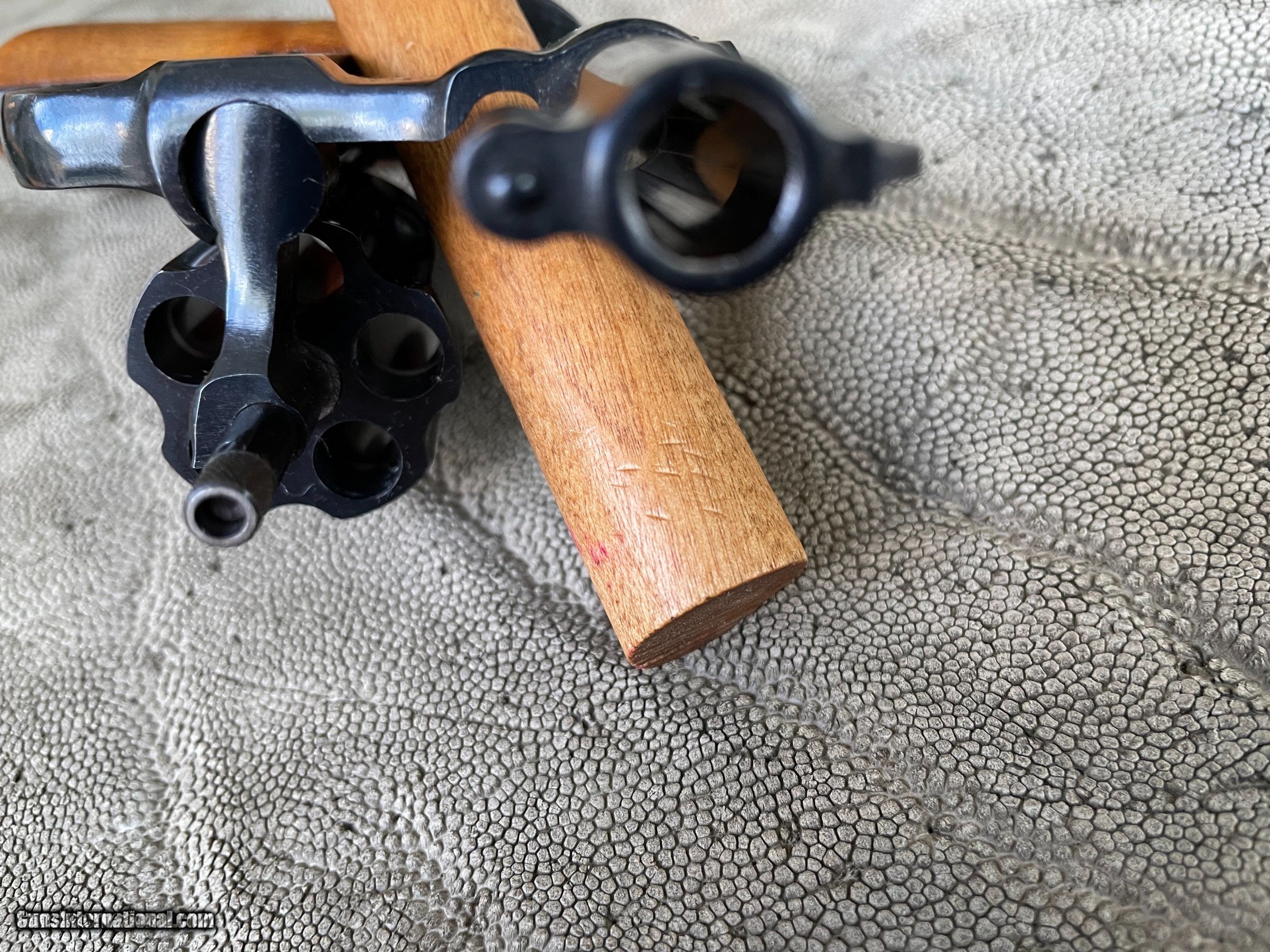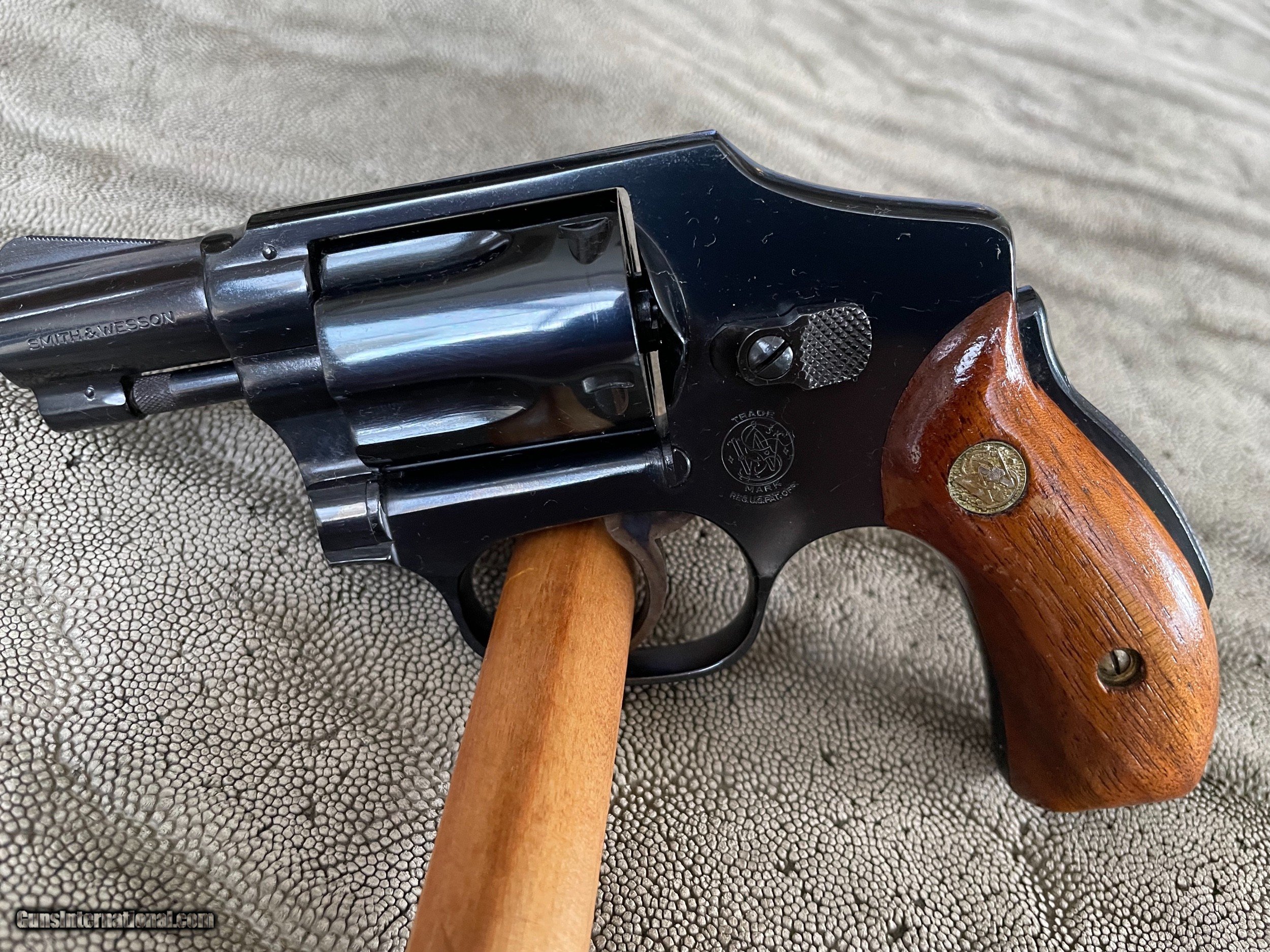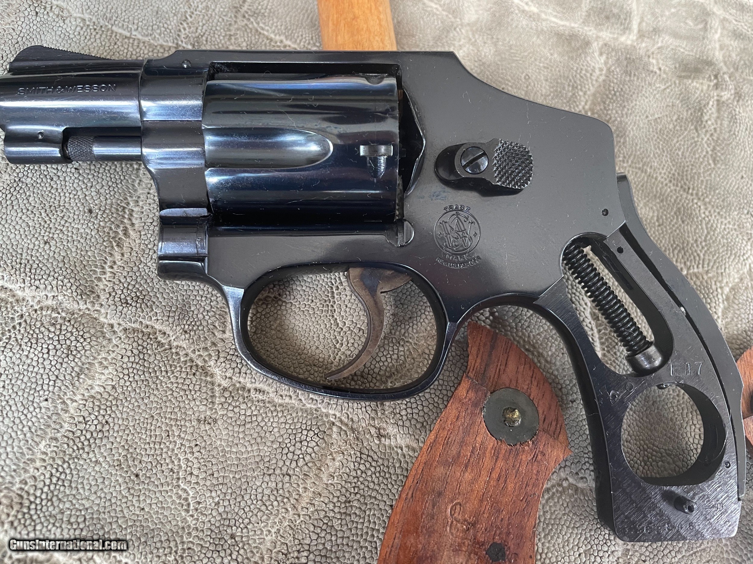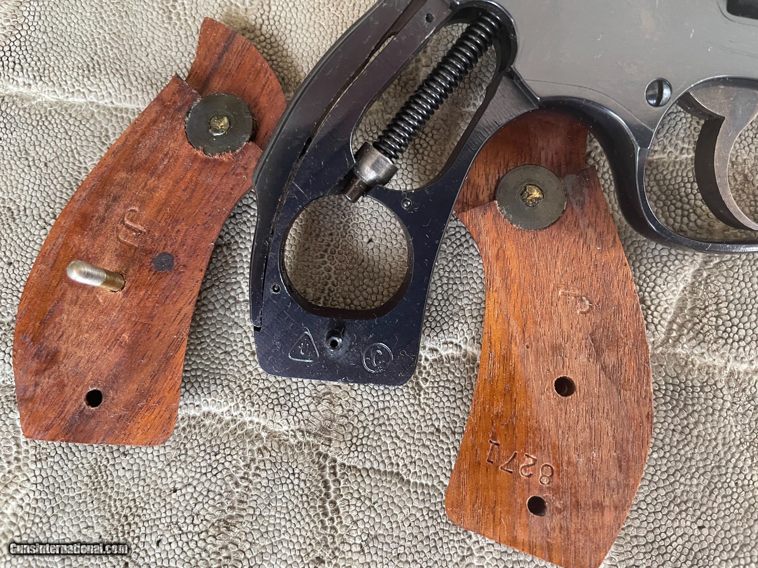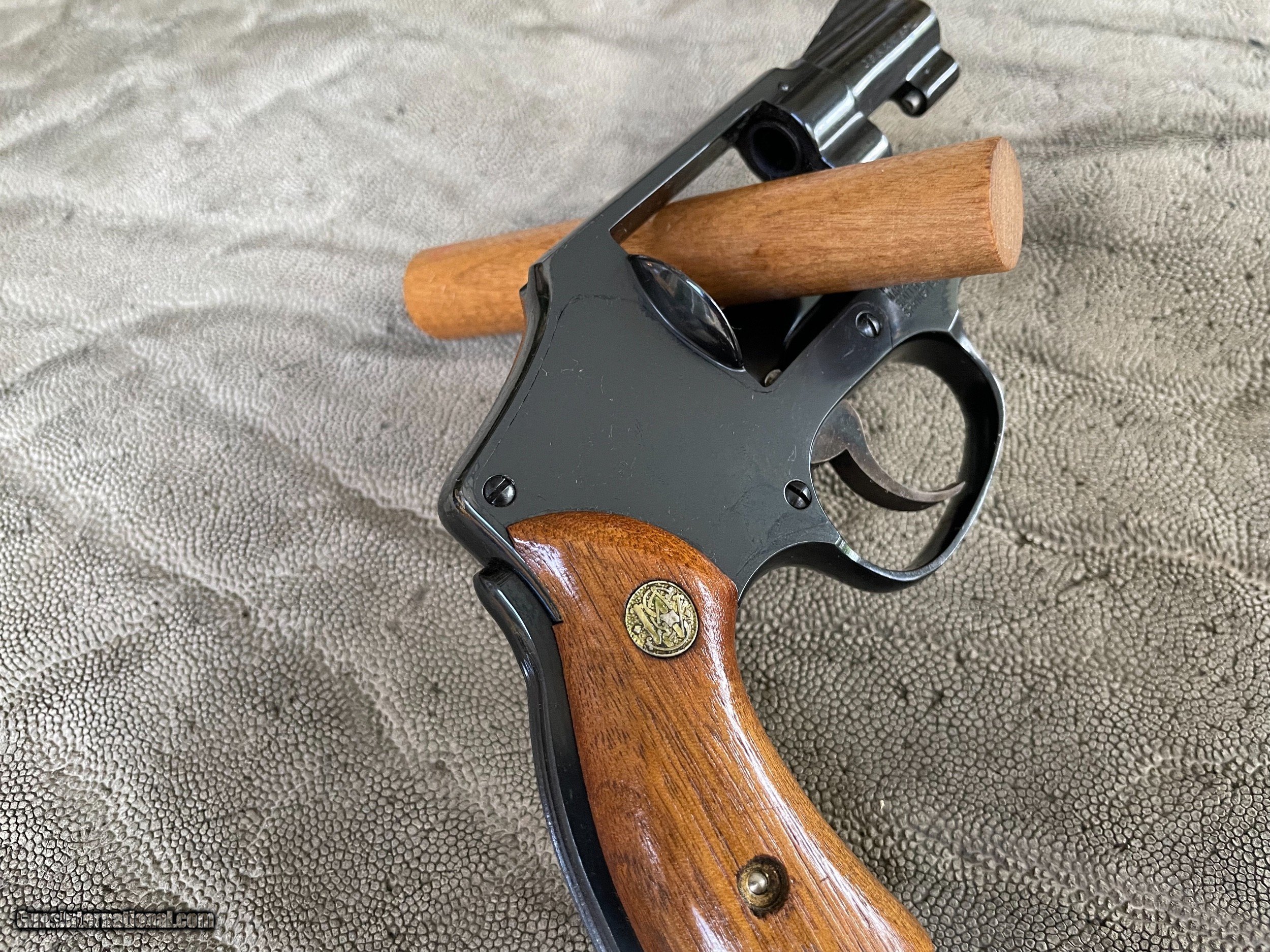 Description: SMITH AND WESSON MODEL 40 HAMMERLESS , PINNED BARREL, DOUBLE ACTION REVOLVER .38 SPECIAL. 1 7/8 INCH BARREL WITH MINT BORE. SLIGHT BLEMISH ON CYLINDER ( SEE PHOTO 5 ) . SLIGHT BLEMISH ON GRIP JUST BELOW S&W MEDALION ON GRIP (SEE PHOTO 1 ). SLIGHT DRAG MARKS SEE PHOTOS. THIS REVOLVER IS IN EXCELLANT CONDITION INSIDE AND OUT. RARE FIND. GREAT CONCEALED FOR MEN, IN WOMEN'S PURSE OR AUTO GLOVE COMPARTMENT. ***** LAY AWAY OK ***** SOLD Handgun Caliber: .38 Special |