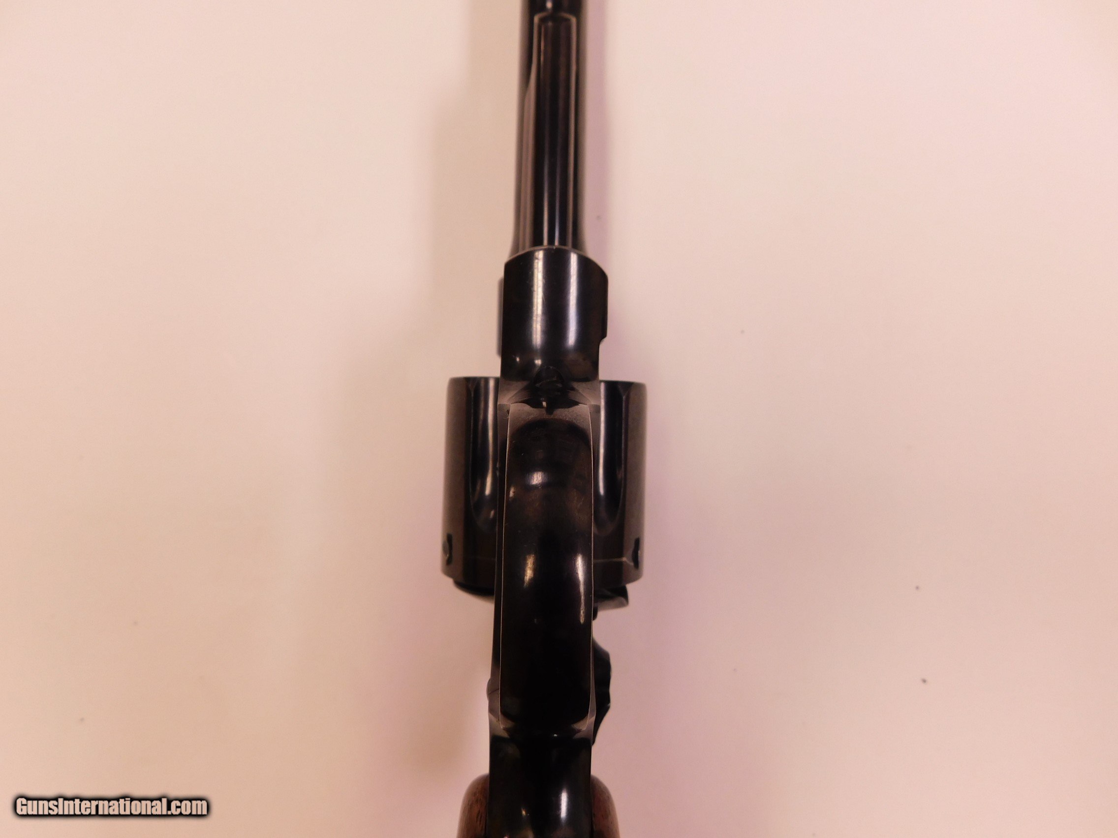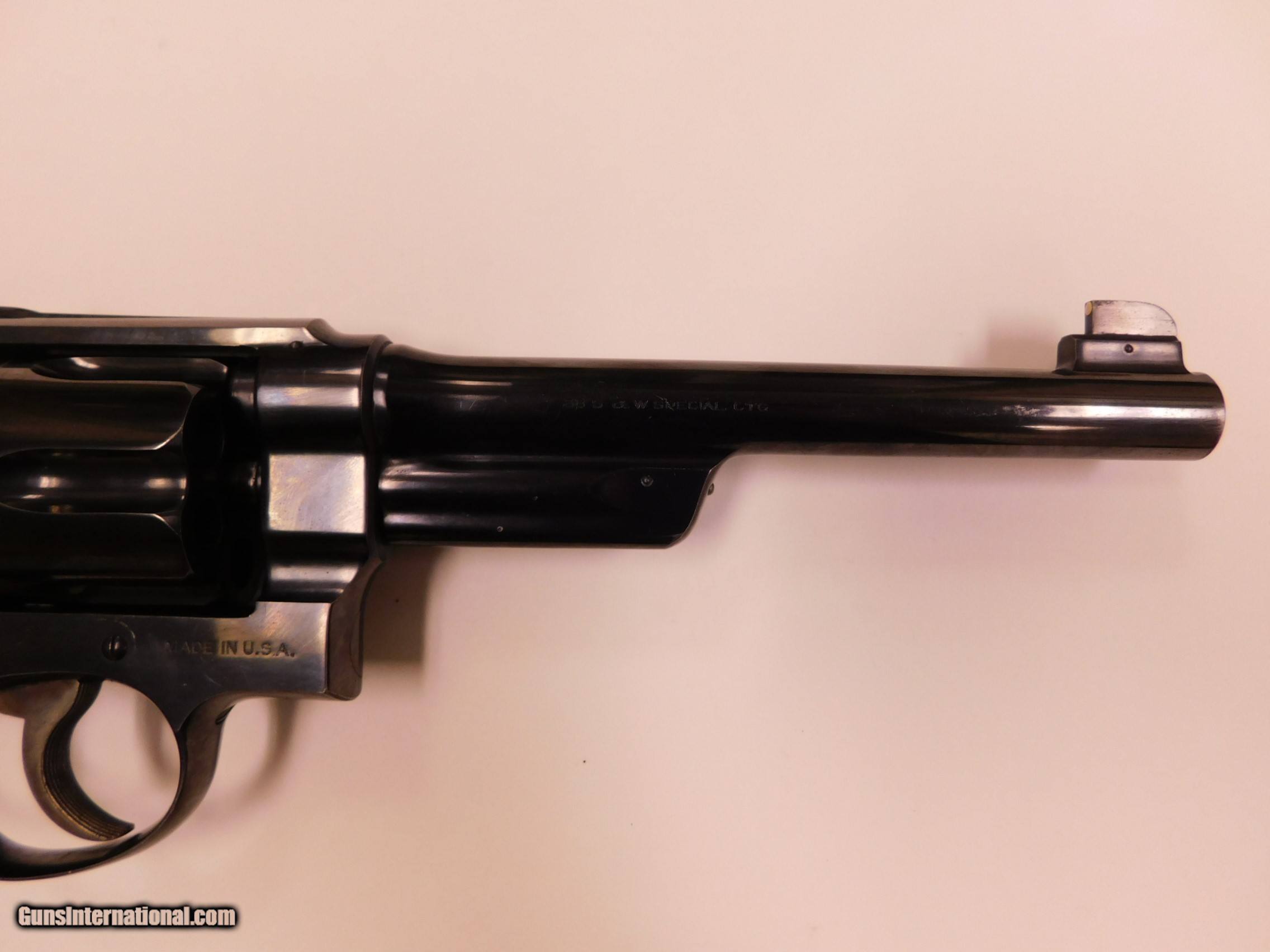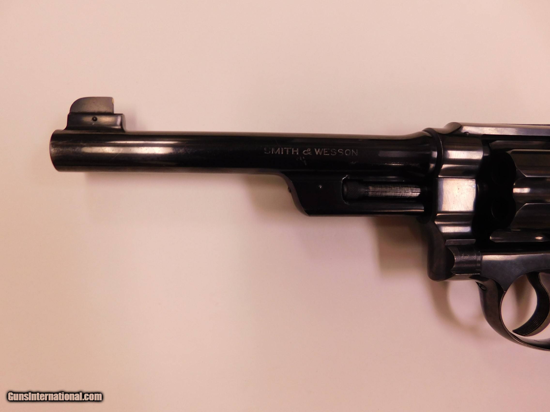 Description: Smith and wesson 38/44 outdoorsman 38special, 6.5" barrel, pre-war, 5 screw, excellant overall condition, minor finish wear at the muzzel. The bore is perfect , lockup is tight, no end shake. A small hole has been drilled in the front strap of the frame for a grip adapter, serial #48898, 1937. Price $1500 and $25 shipping and handling. SOLD Manufacturer: smith and wesson Model: 38/44 outdoorsman |