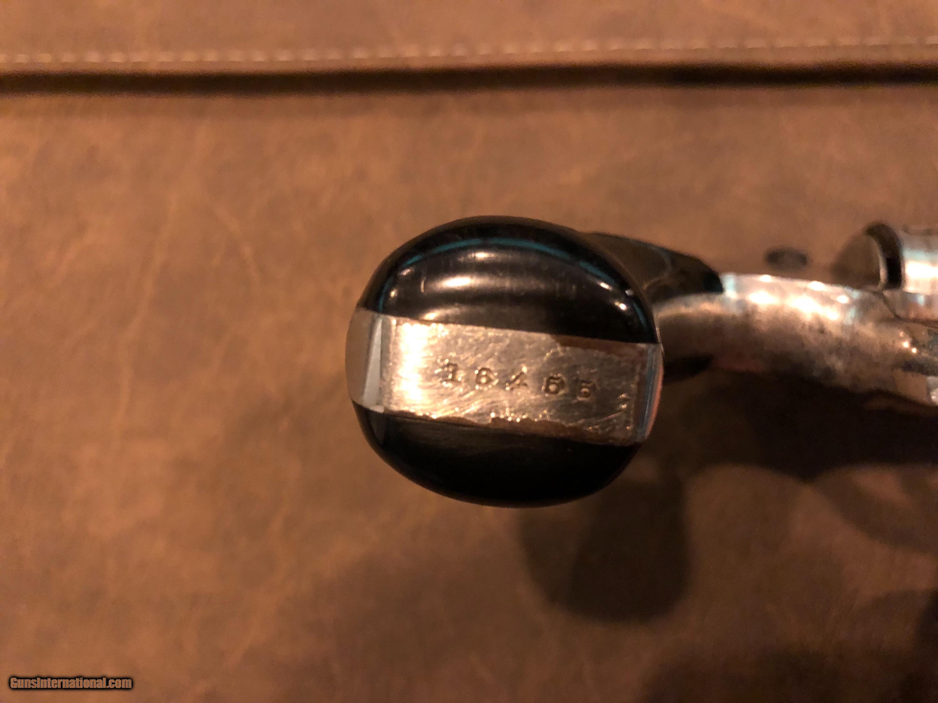 Description: Smith and Wesson Perfected Model. 38 S&W caliber, 5 inch barrel. Approximately 70% original nickel. Dark bore but clean with strong rifling. Only 59,400 of these revolvers made between 1909 and 1920. Perfect mechanically. Excellent hard rubber grips. Serial number 16,4XX. PRICE REDUCED $350 plus $30 shipping. ON HOLD SOLD Curio/Relic: Yes |
