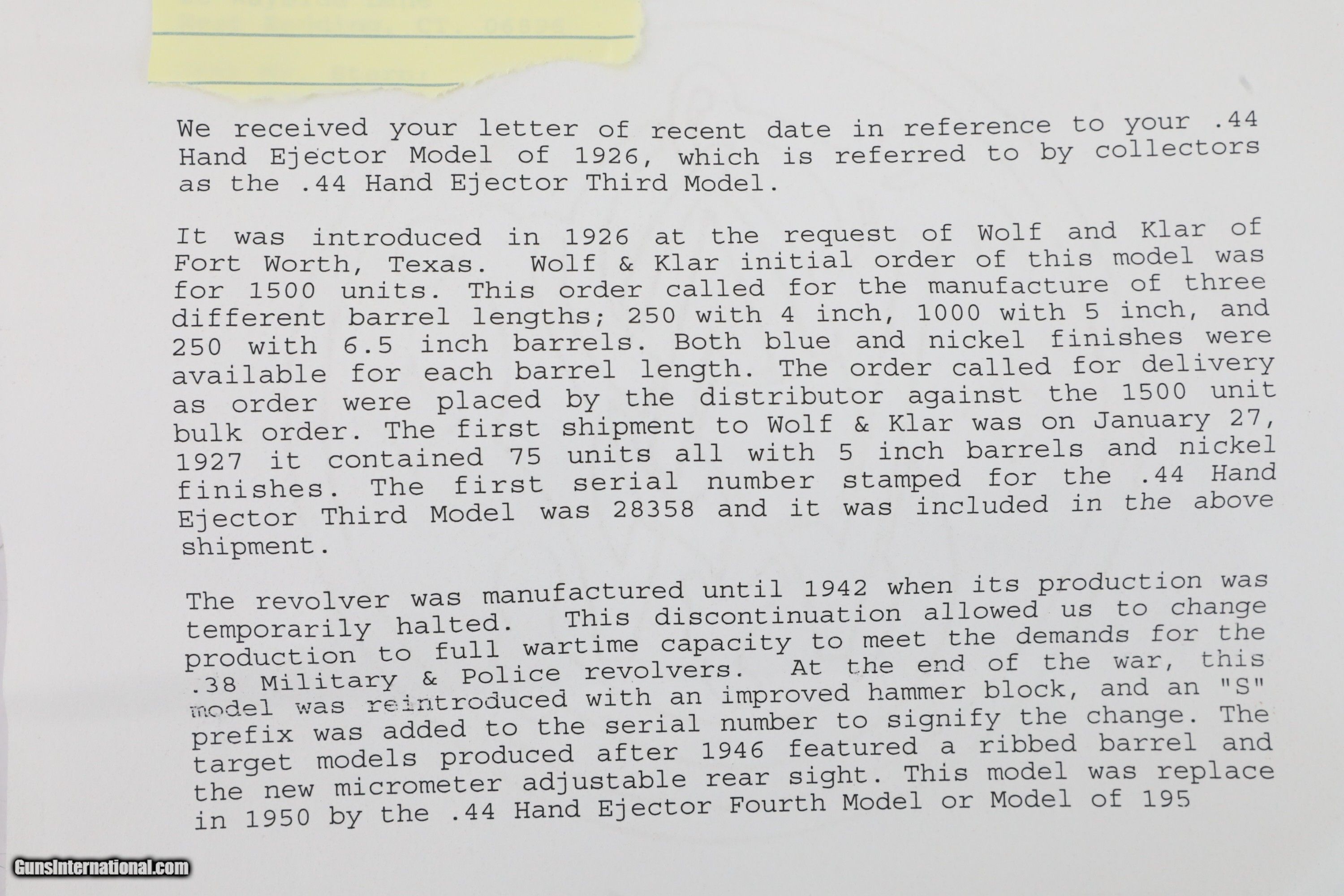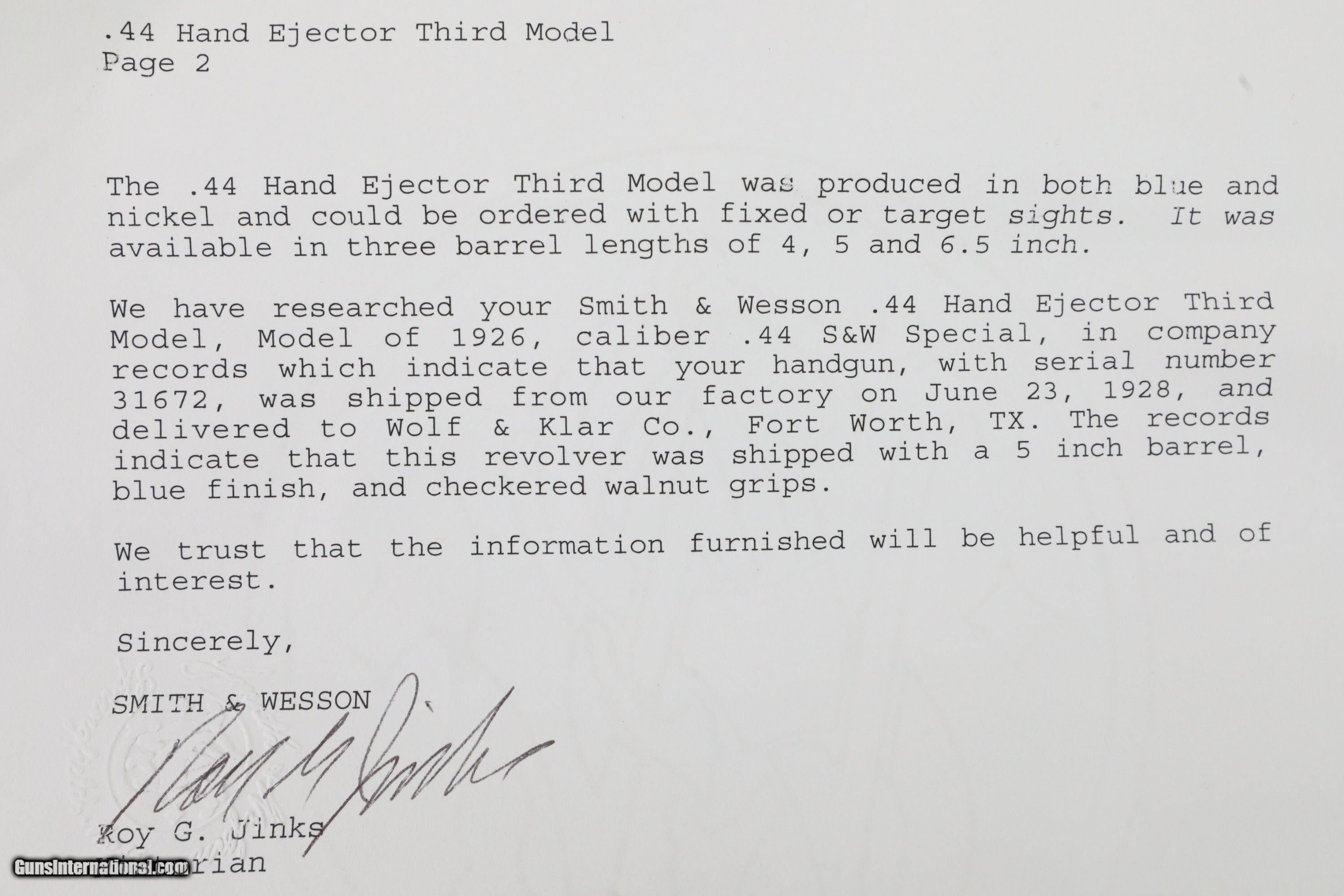 Smith and Wesson S&W .44 Hand Ejector Third Model of 1926 Wolf & Klar Engraved .44 S&W Special 5 Inch Revolver 1928 C&R RARE 1 of 1000 Factory Letter
